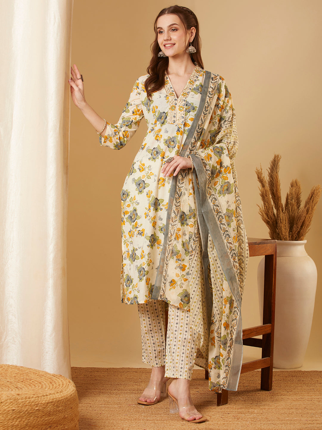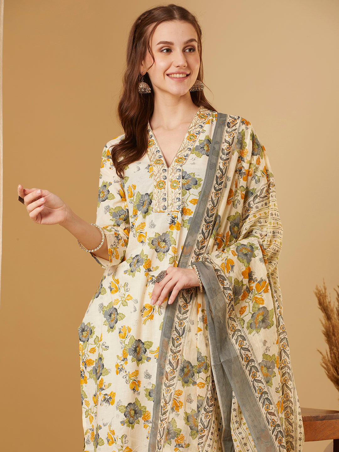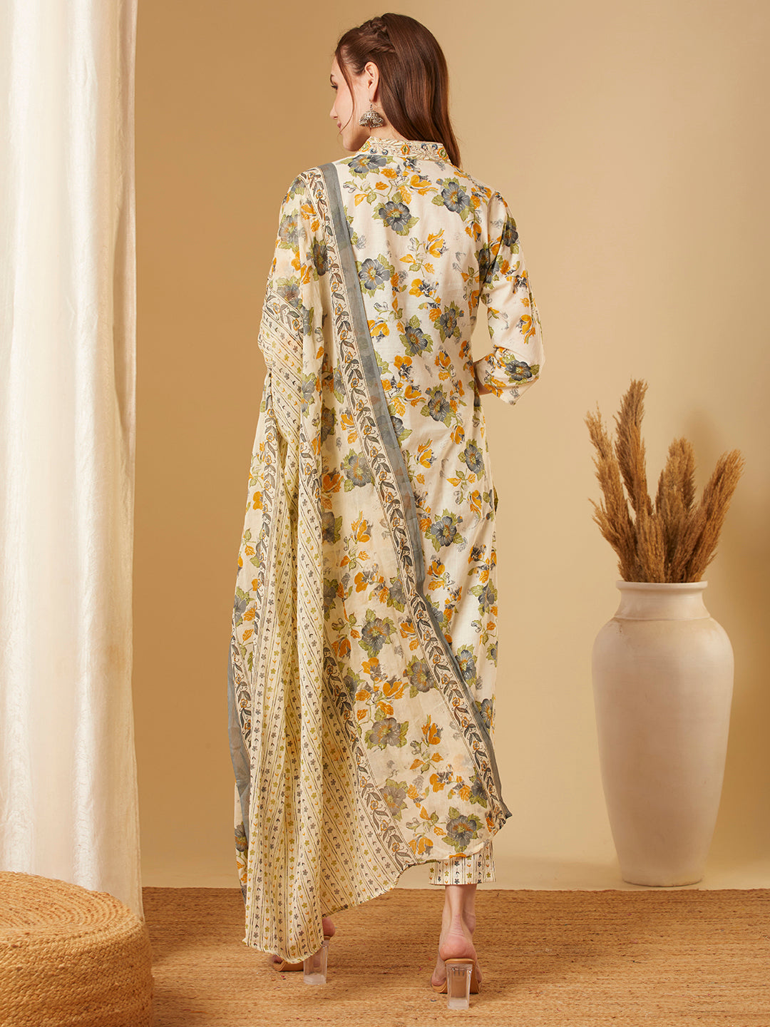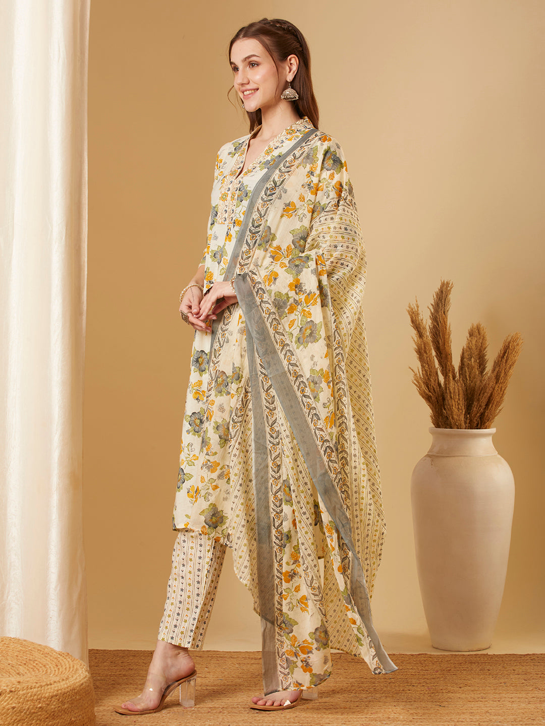 Floral Printed & Embroidered Straight Fit Kurta with Pant & Dupatta - Off White