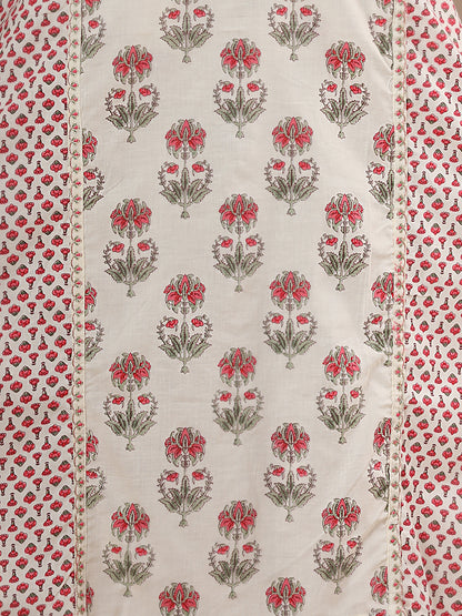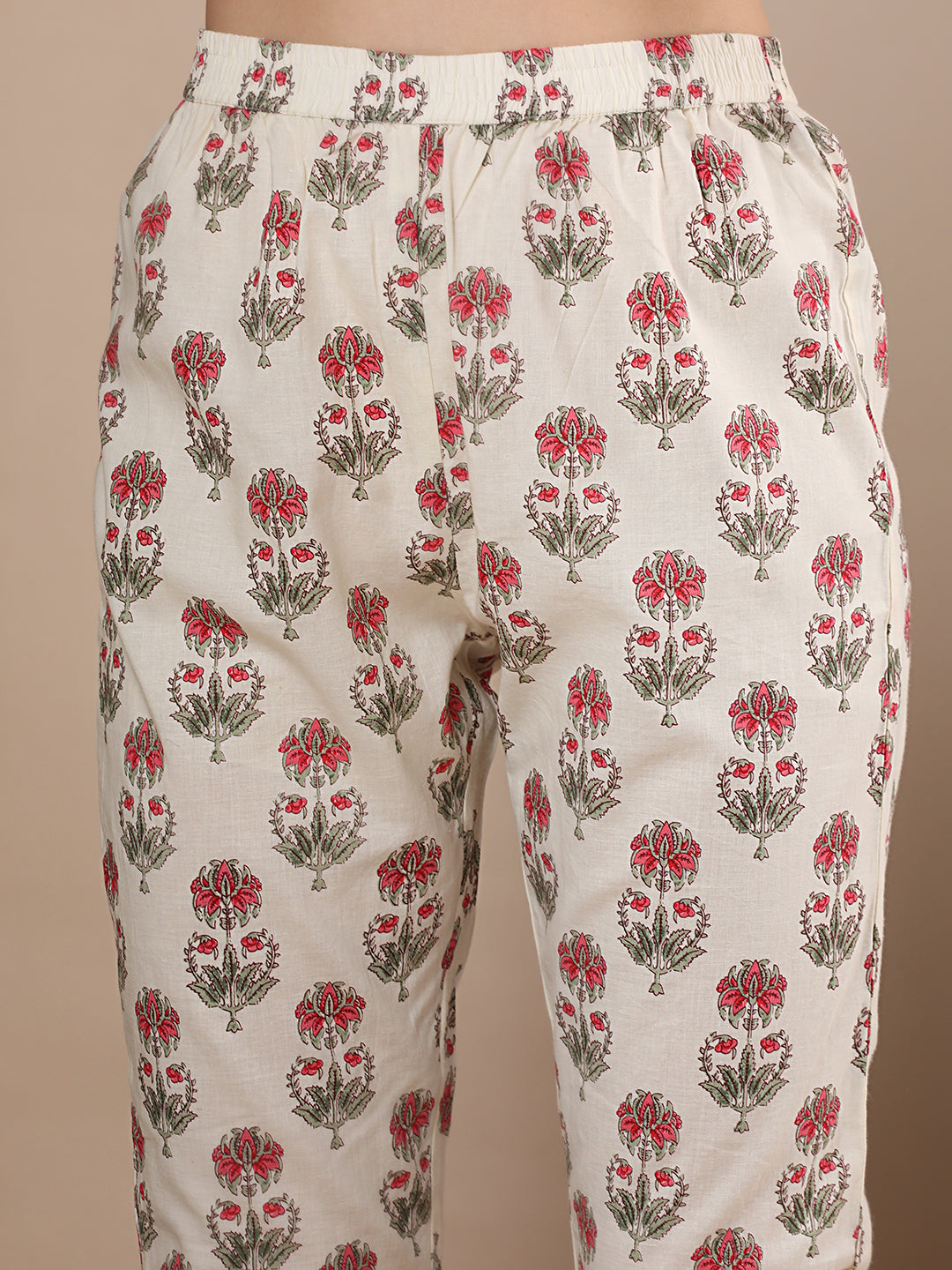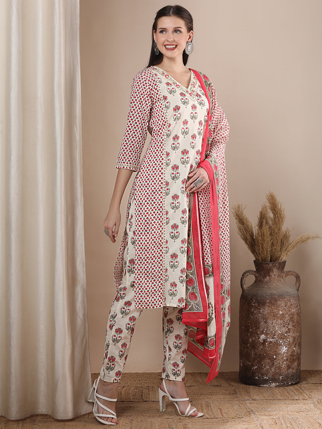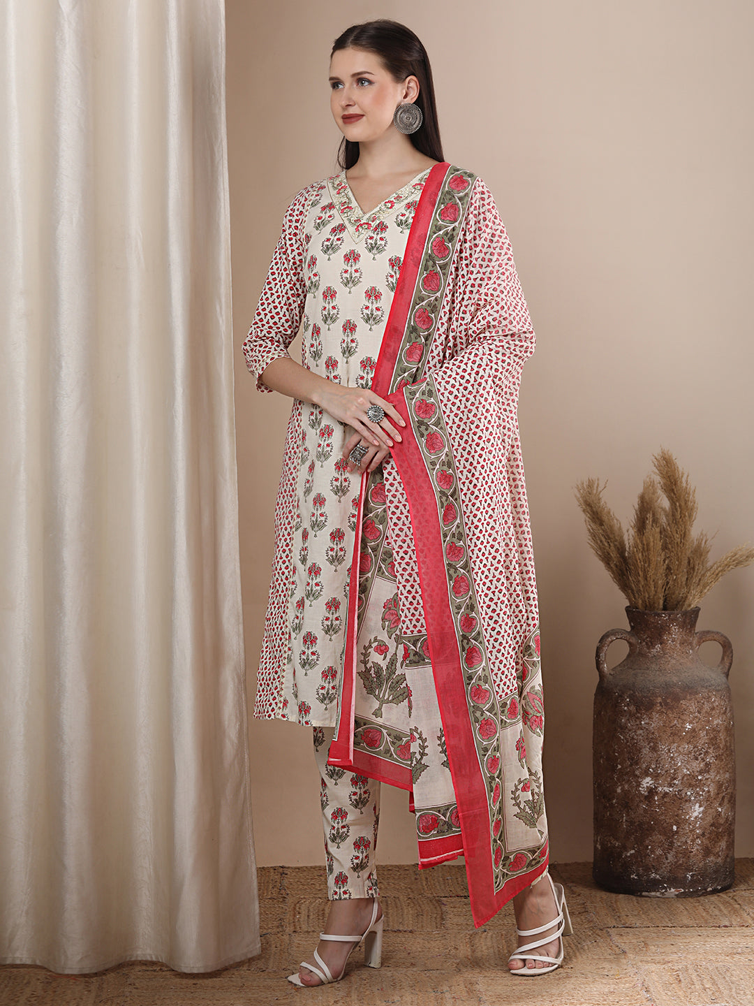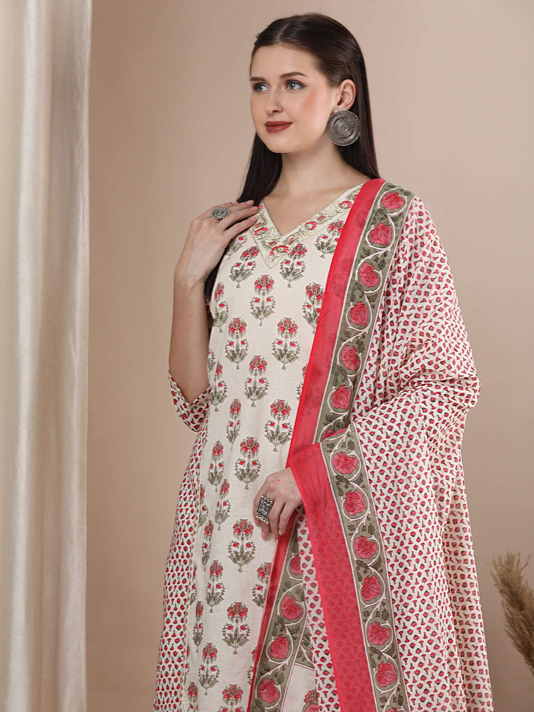 Floral Printed & Embroidered Straight Kurta with Pant & Dupatta - Off White