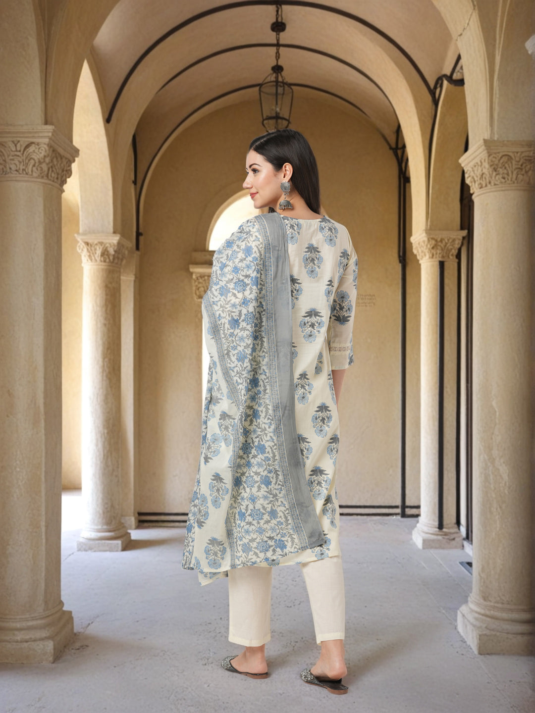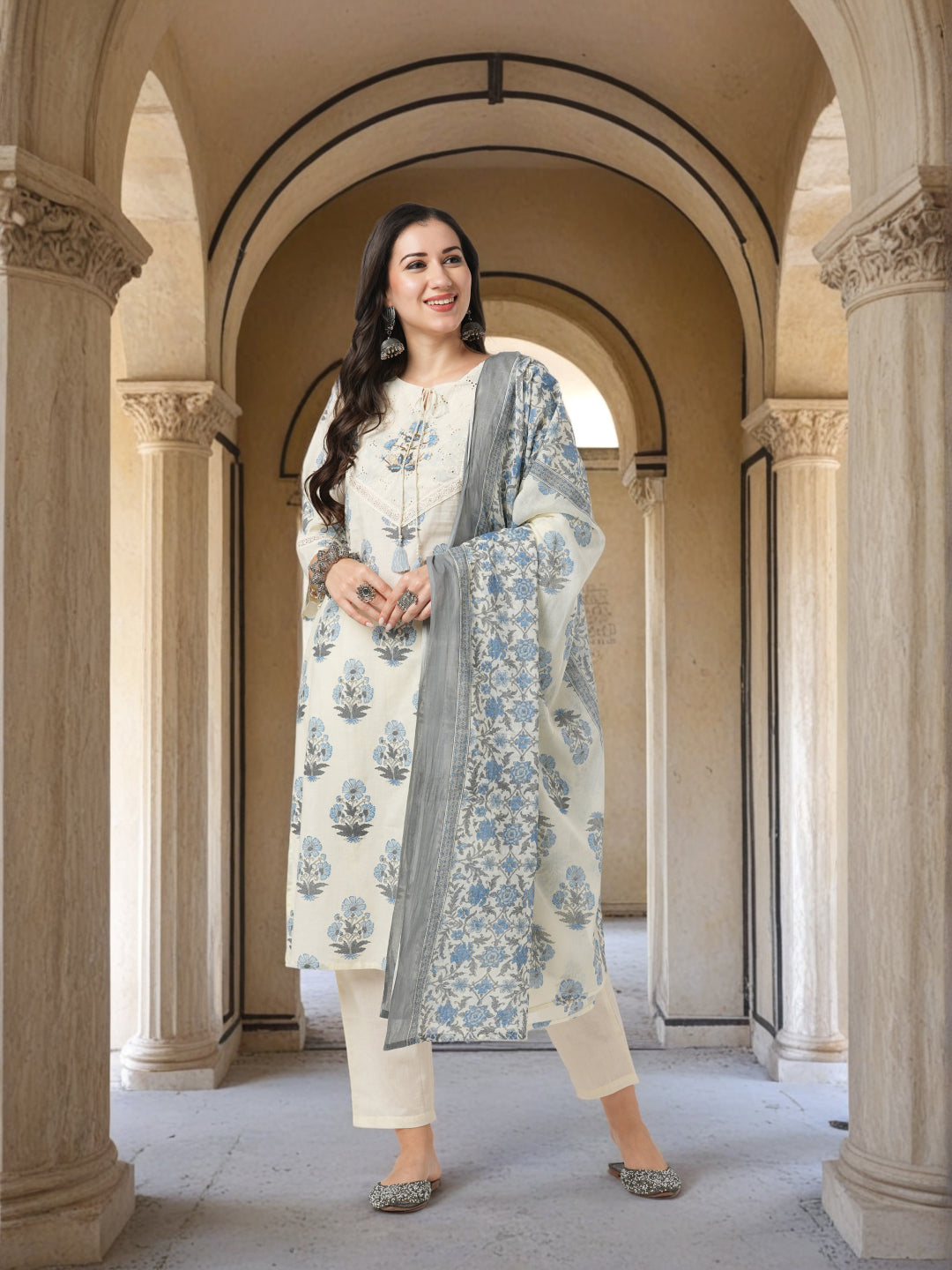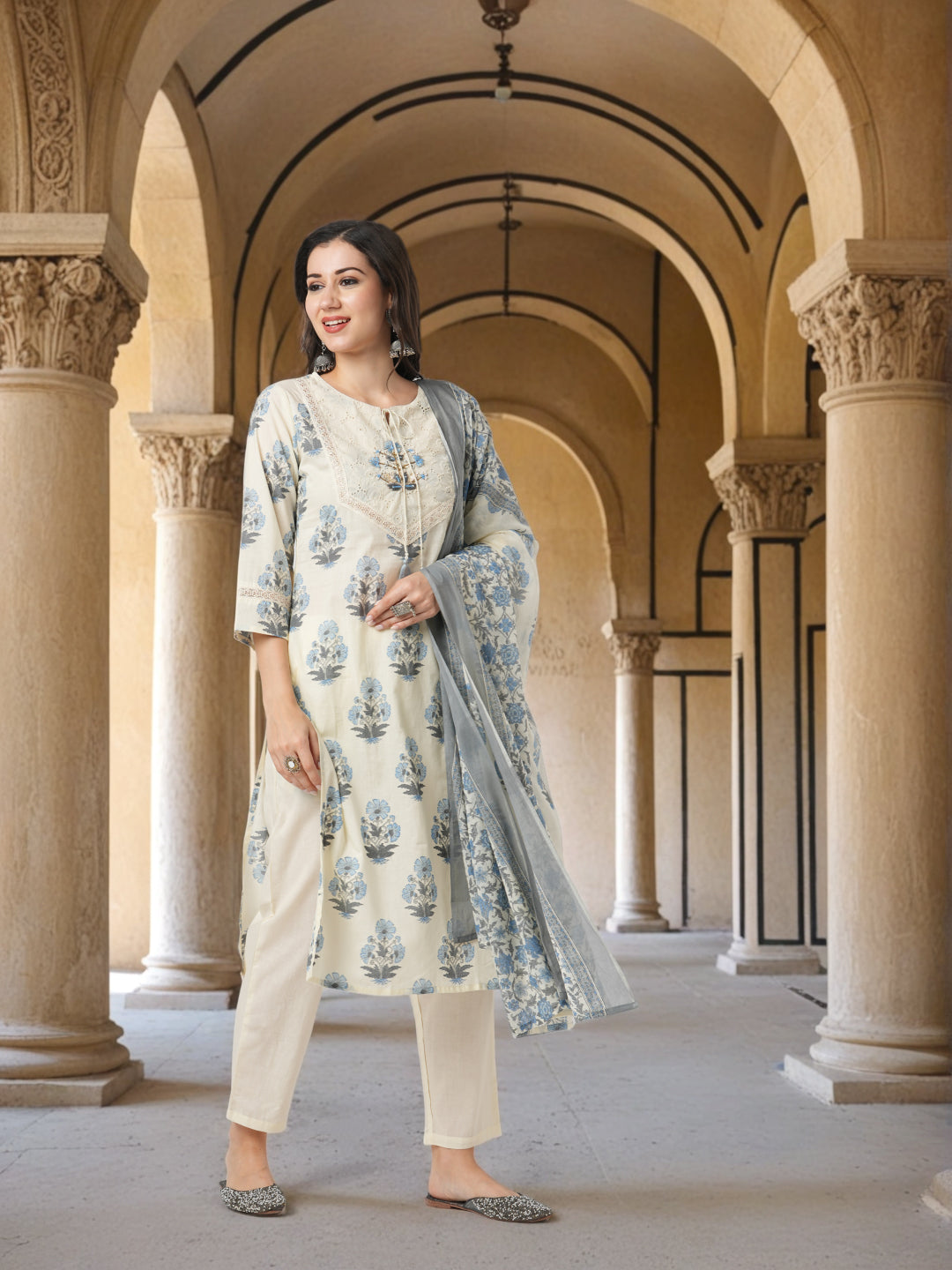 Refresh your everyday ethnic wardrobe with this charming straight fit kurta set, adorned with delicate ethnic floral prints all over. Crafted for comfort and style, the kurta features a classic round neckline subtly embellished with sequin work, adding a hint of sparkle to your daily look. It is paired with a solid, well-tailored pant that ensures ease of movement and a flattering silhouette. Completing the ensemble is a pure cotton printed dupatta that brings a breezy, elegant touch to the outfit. Perfect for workdays, casual outings, or relaxed gatherings, this set strikes the ideal balance between comfort and grace.