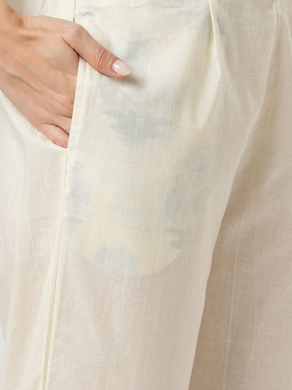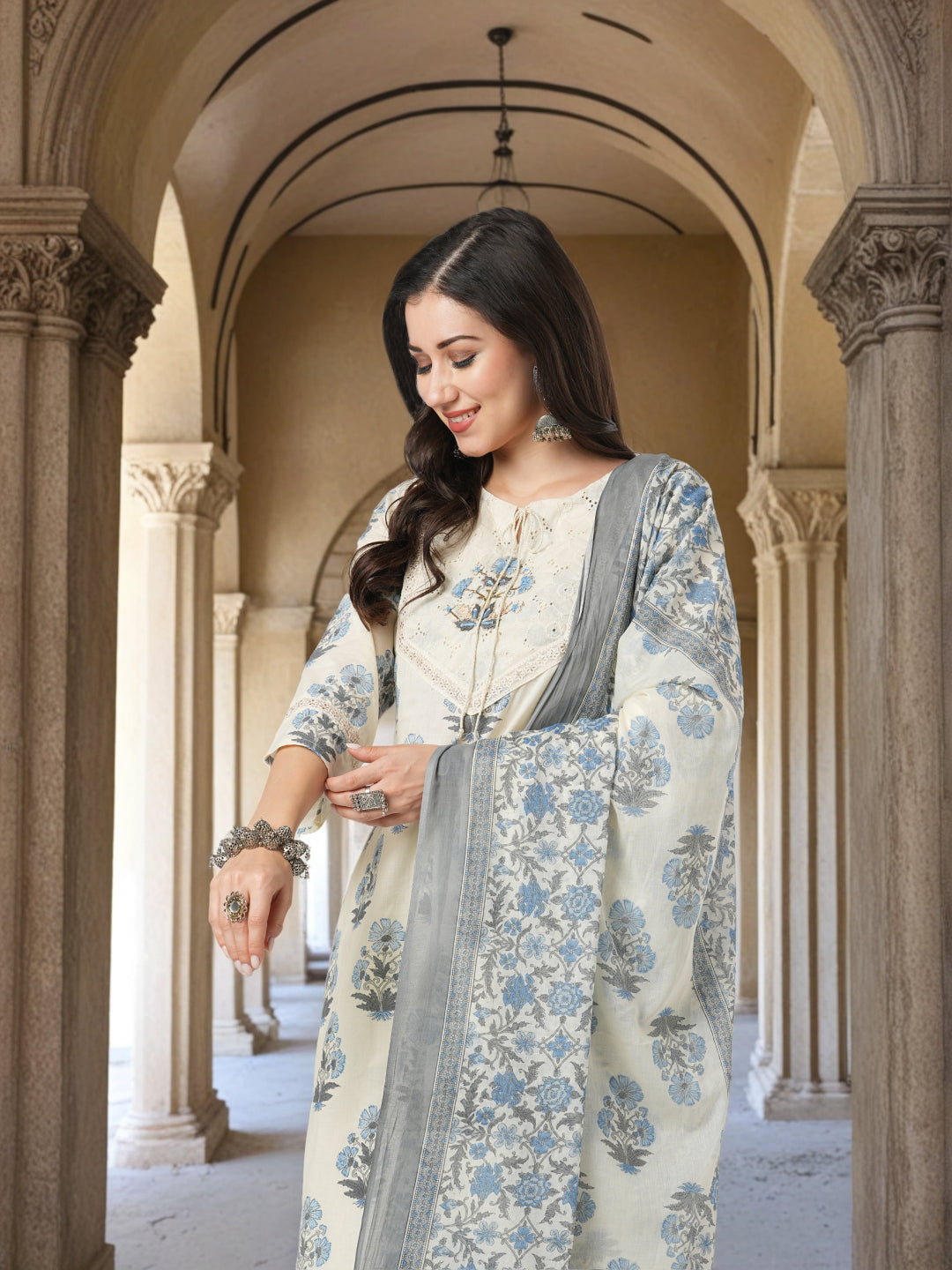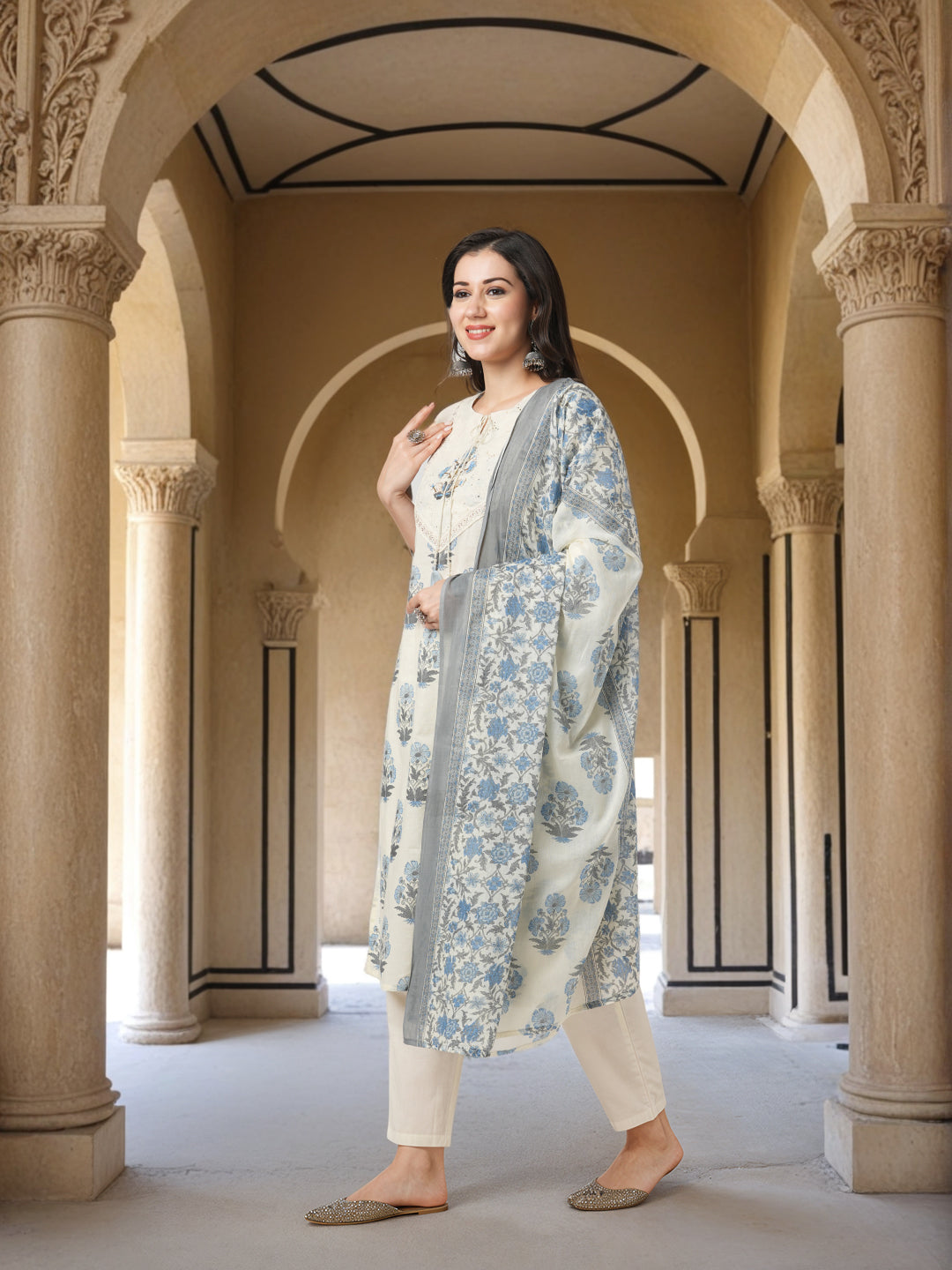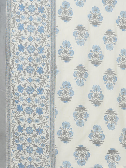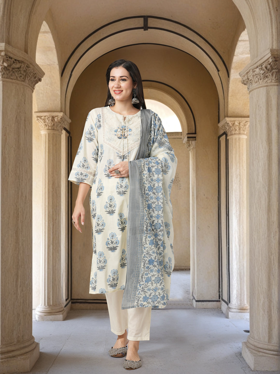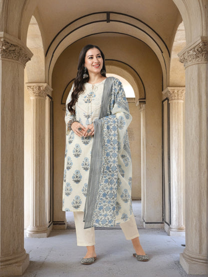 Floral Printed & Hand Embroidered Straight Fit Kurta with Pant and Dupatta - Off White