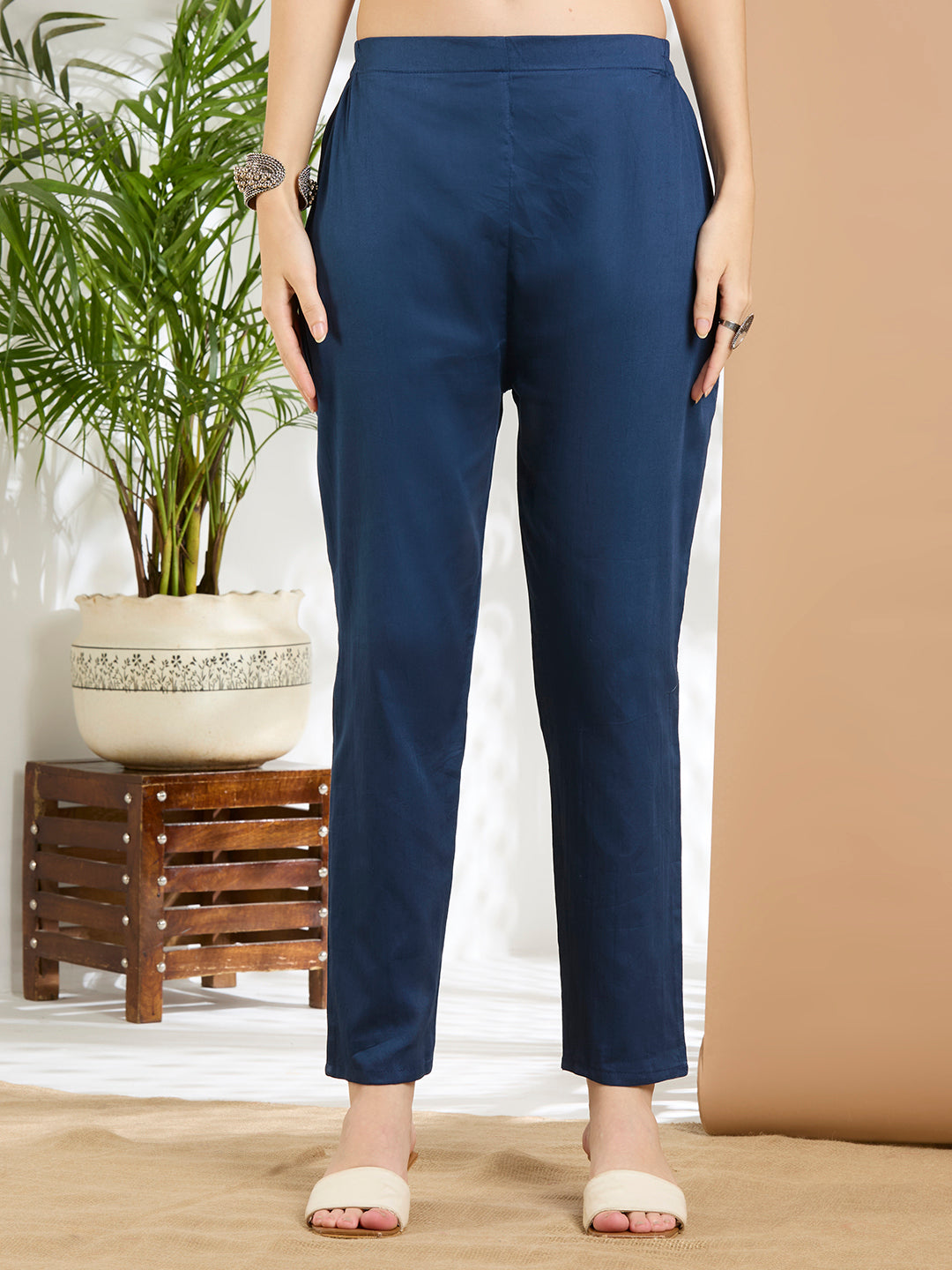 Elevate your everyday style with this elegant three-piece ensemble in soft Blue, crafted from luxurious Chanderi cotton. The straight-fit kurta features a flattering V-neckline, three-quarter sleeves, and side slits, adorned with a beautiful fusion of ethnic motifs, Floral patterns, and subtle stripes. Paired with solid cotton-blend trousers and a printed dupatta, this set offers a perfect balance of comfort and grace—ideal for both office wear and casual outings. The slip-on trousers with a partially elasticated waist ensure all-day ease, while the intricate prints add a touch of refined charm.