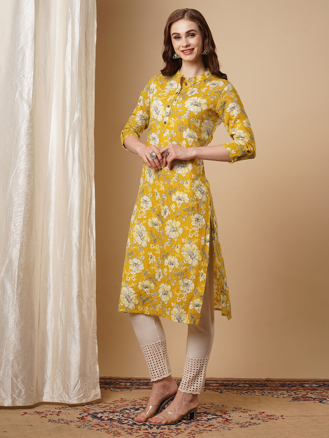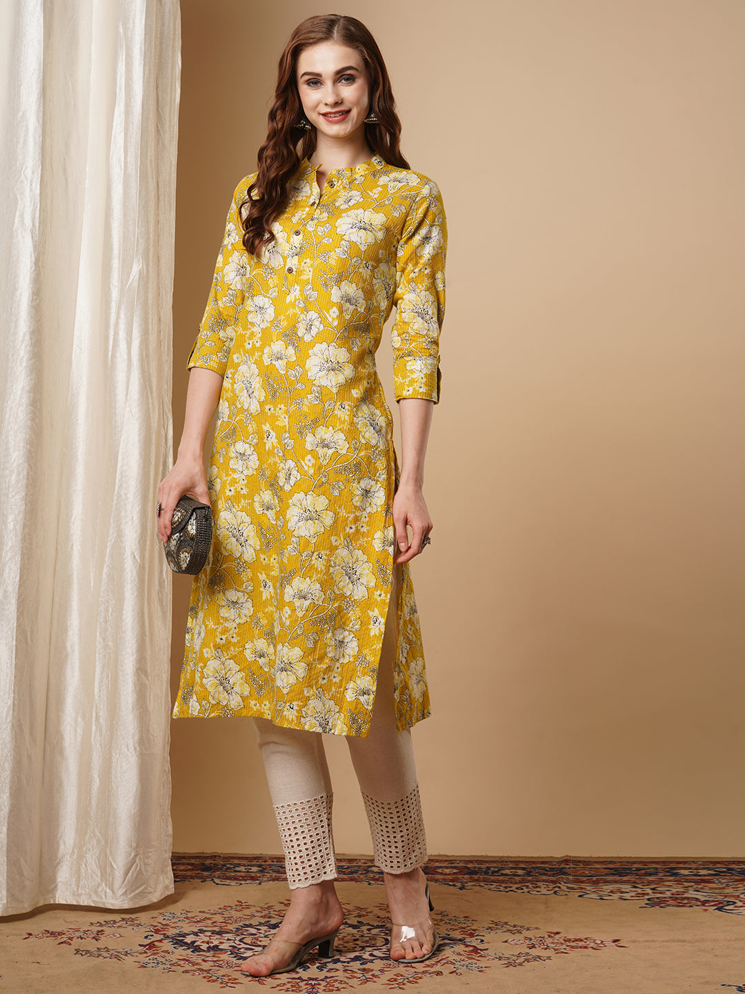 Brighten your everyday wardrobe with this charming straight cut kurta in a refreshing yellow hue. Crafted from breathable cotton fabric, it features delicate floral prints paired with subtle kantha-style woven detailing, offering a perfect blend of tradition and texture. The classic mandarin collar neckline lends a structured, contemporary touch, while the front placket is adorned with wooden button detailing, adding a hint of earthy elegance. Ideal for casual outings or workwear, this kurta brings effortless style with a handcrafted appeal.