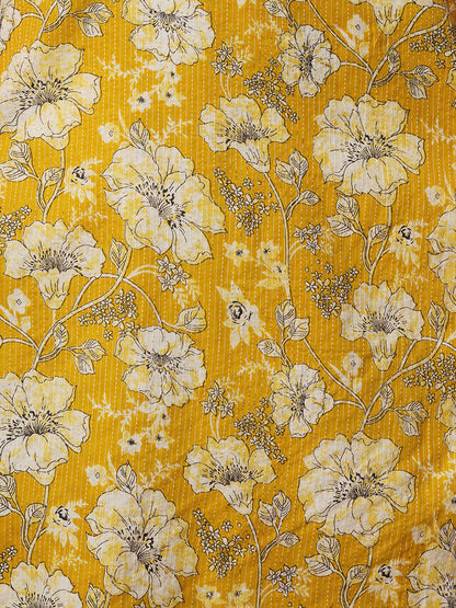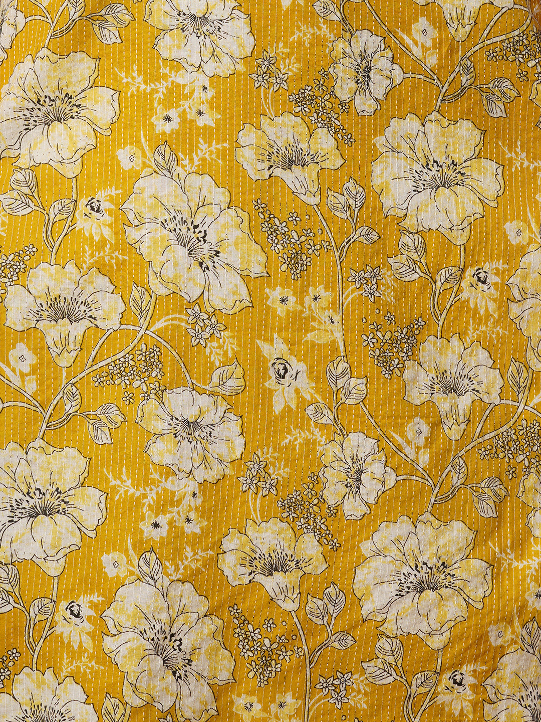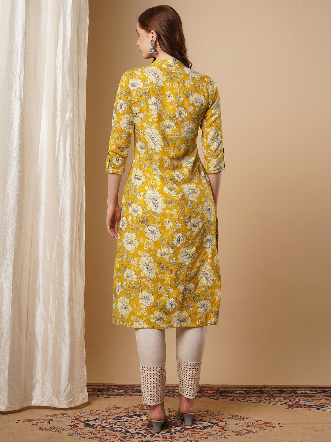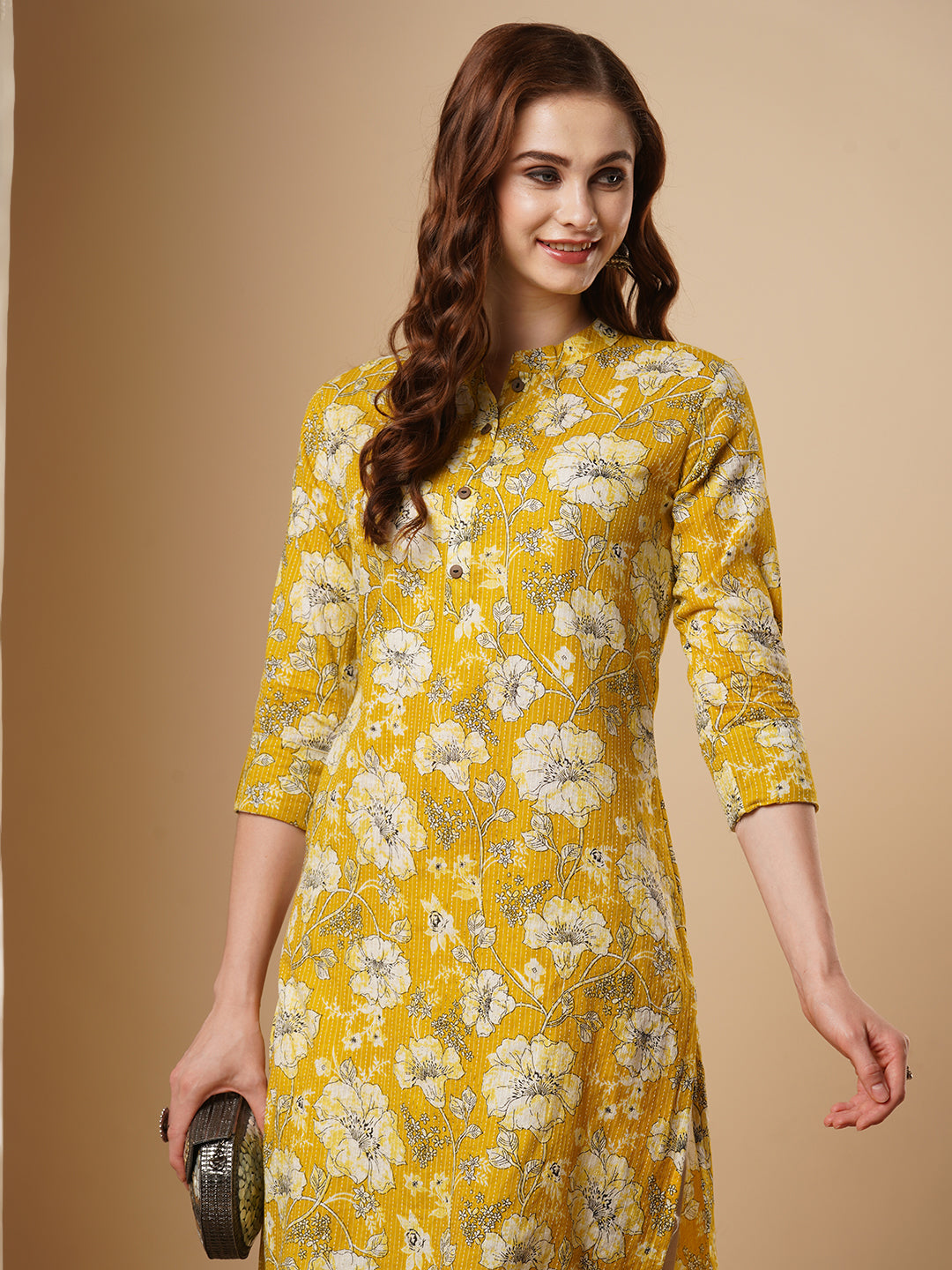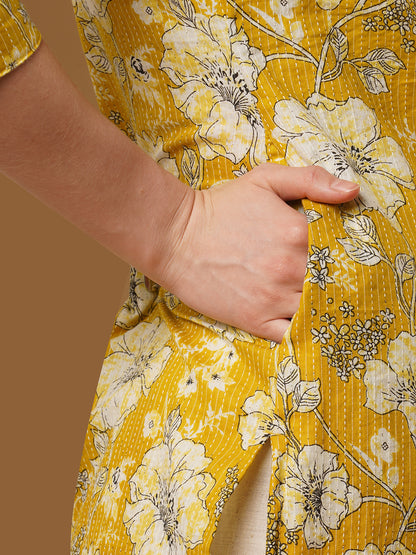 Floral Printed & Kantha Woven Straight Cut Kurta - Yellow