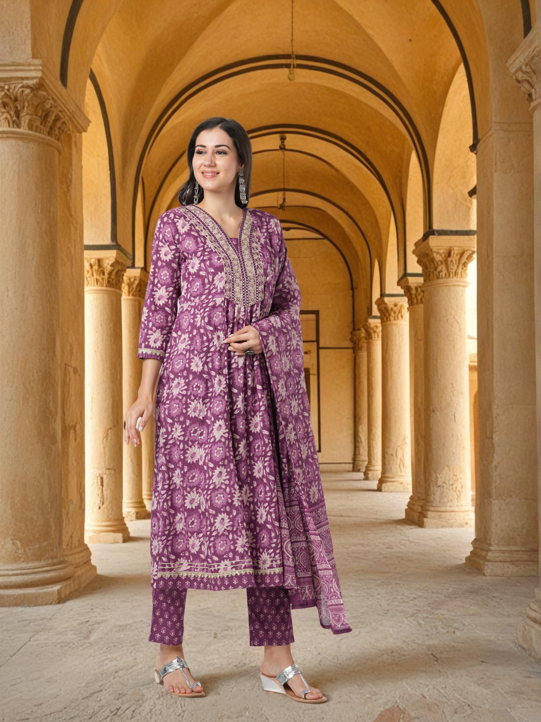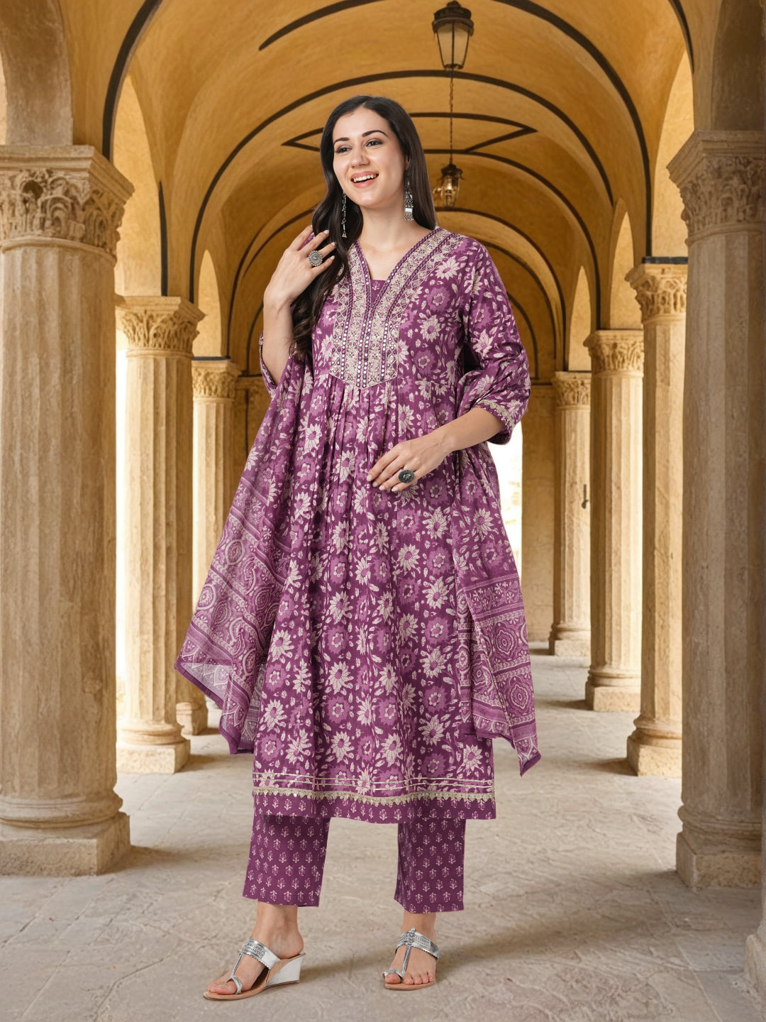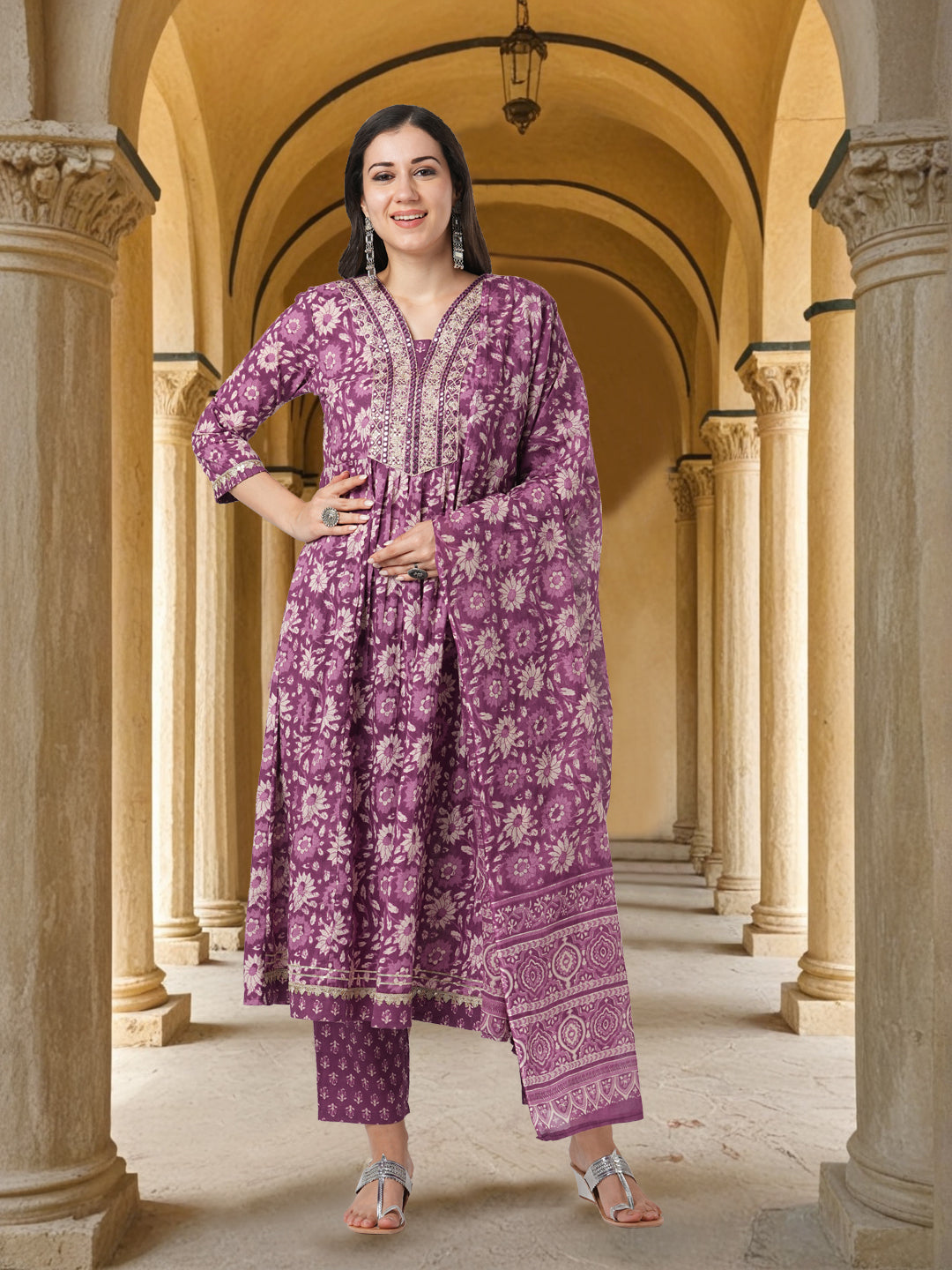 Floral Printed & Mirror Embroidered Anarkali Flared Kurta with Pant & Dupatta - Purple