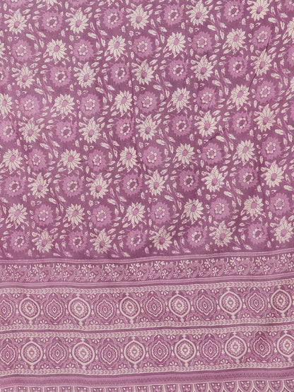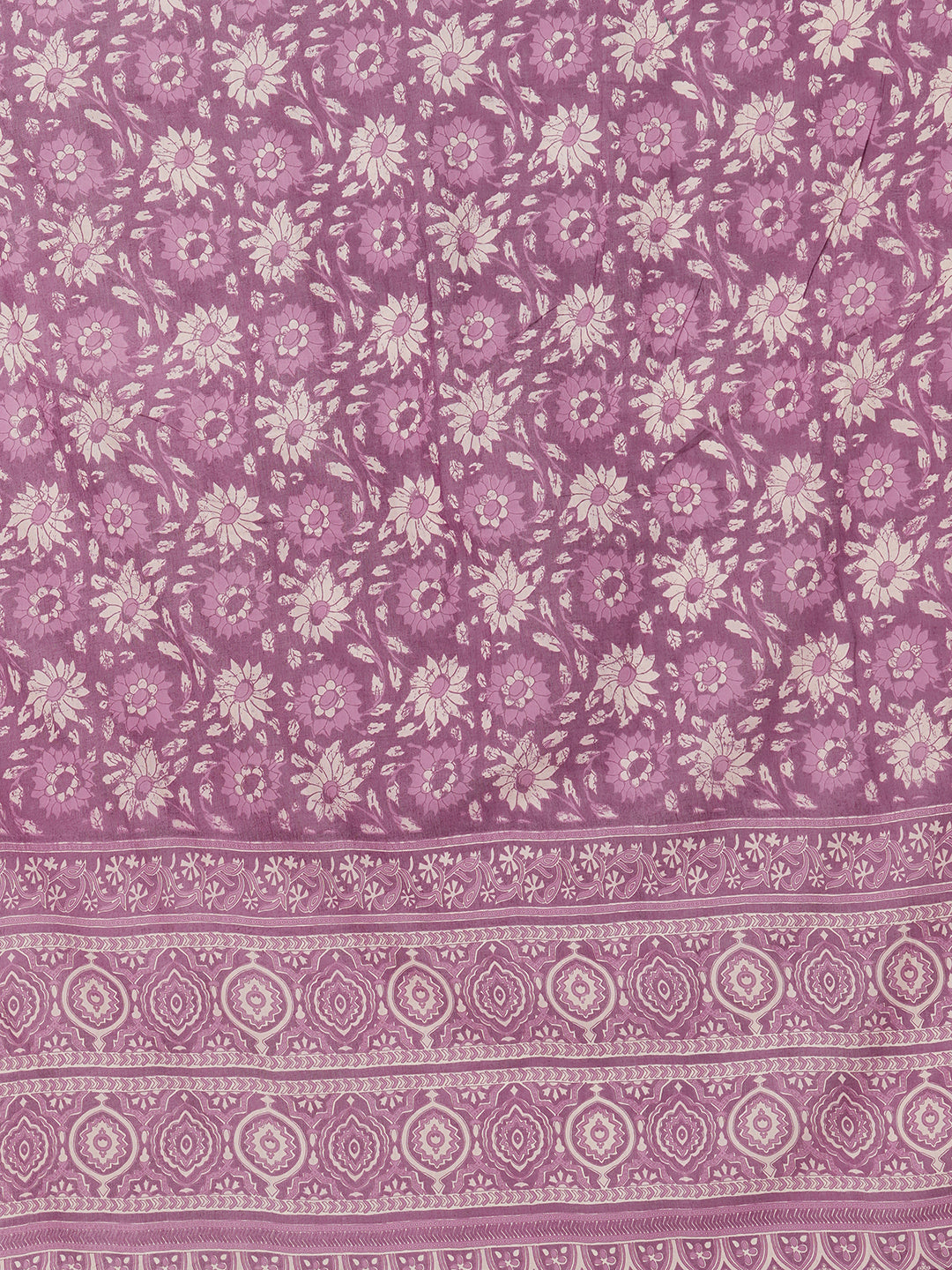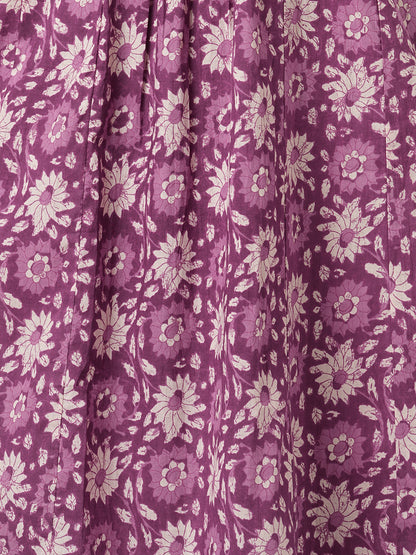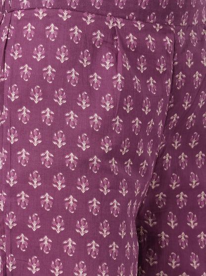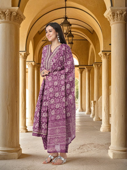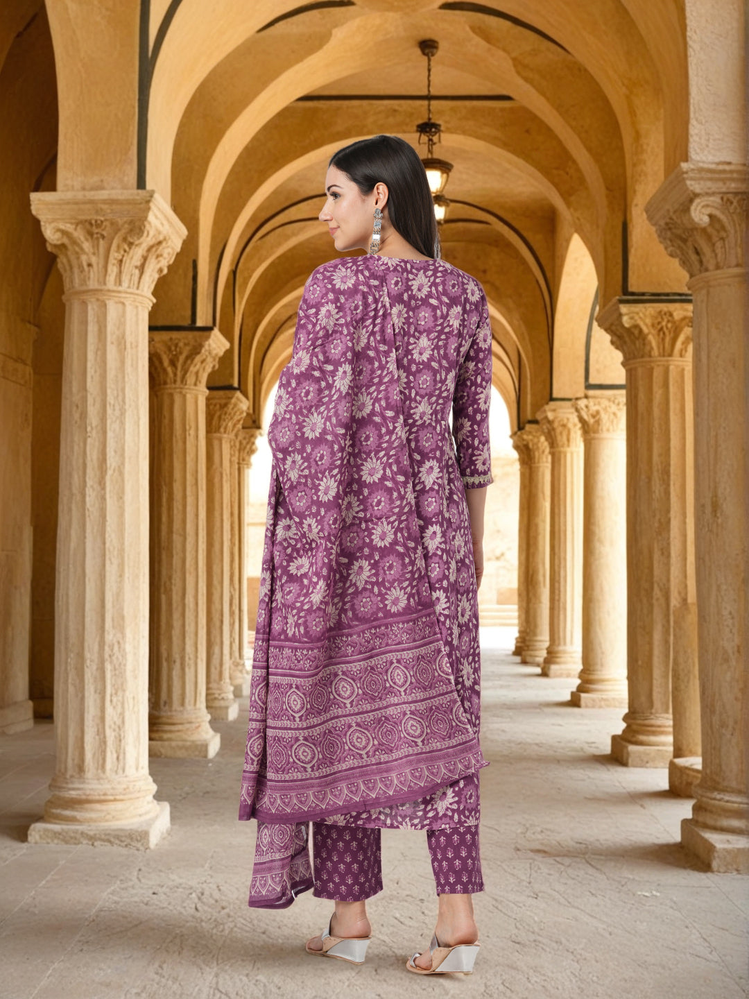 Floral Printed & Mirror Embroidered Anarkali Flared Kurta with Pant & Dupatta - Purple