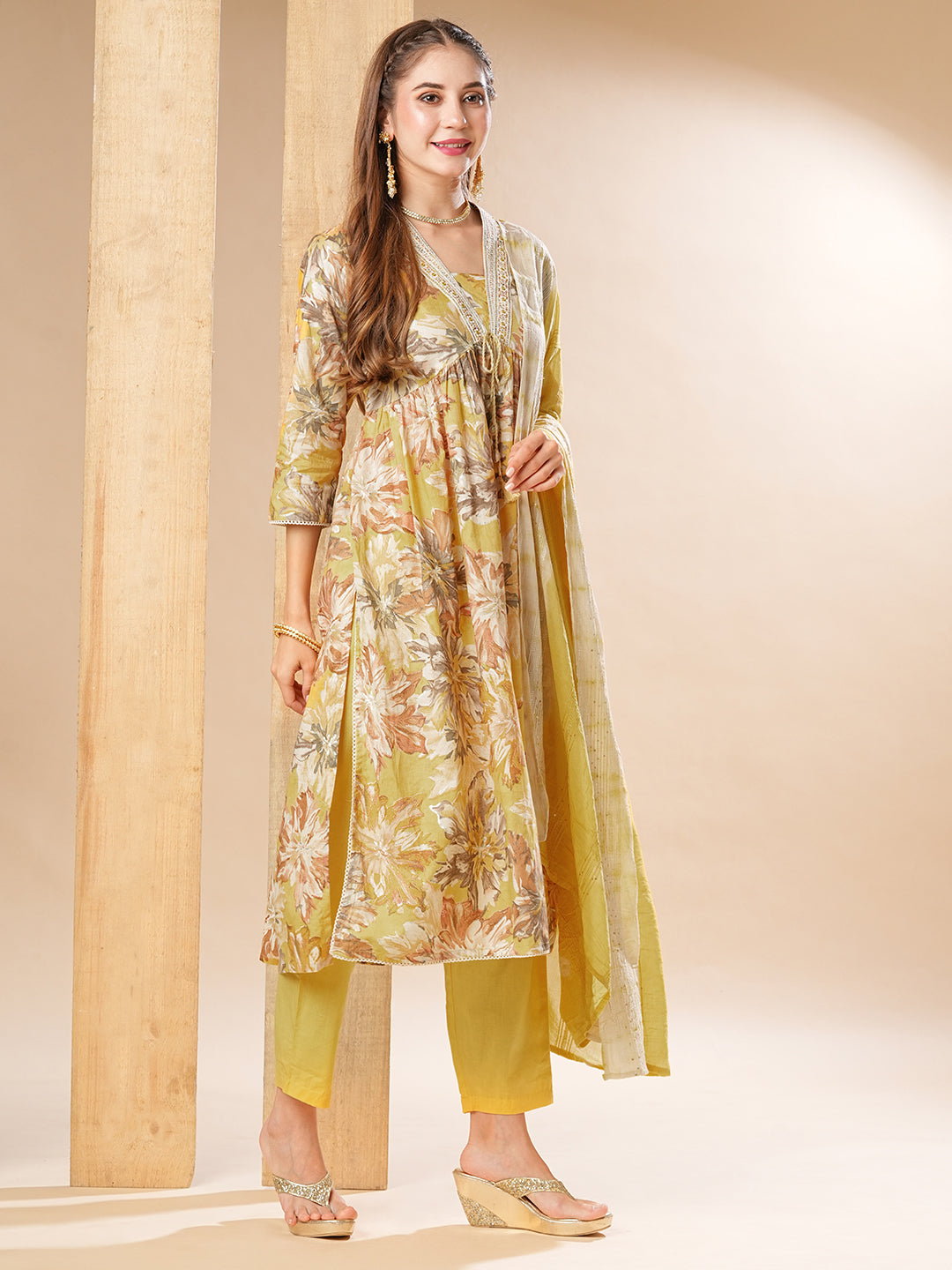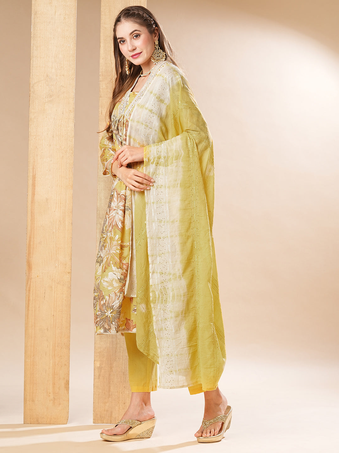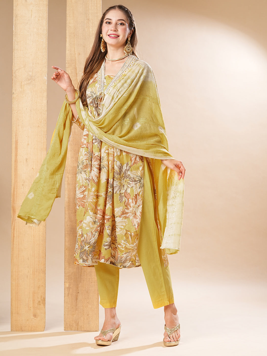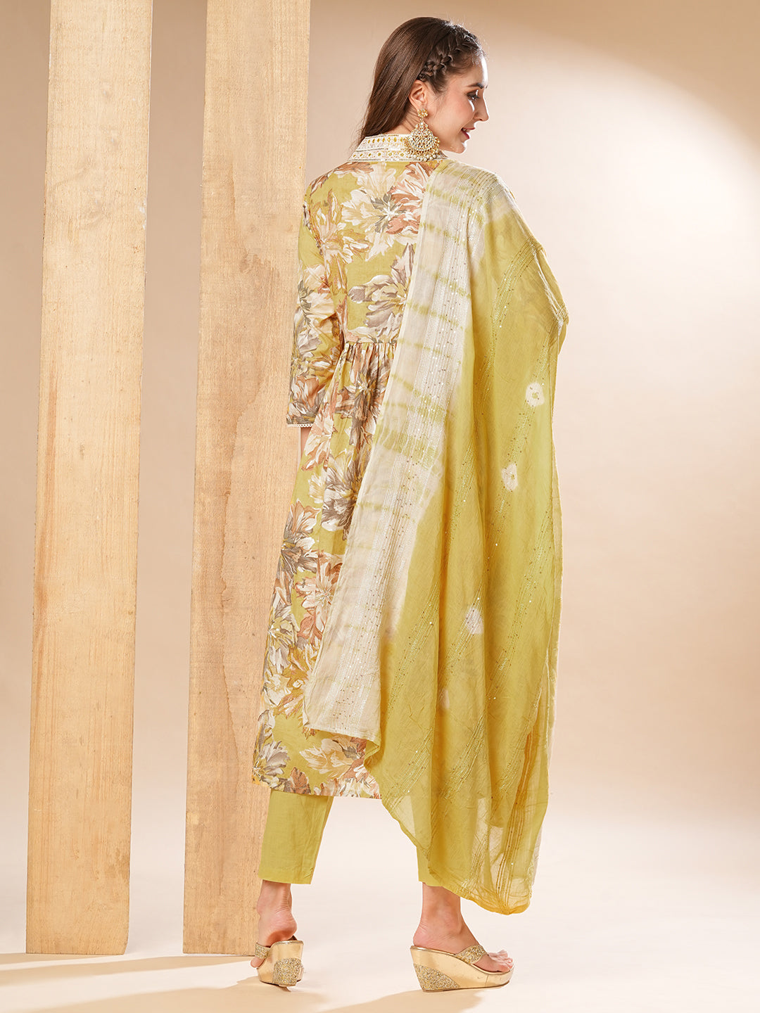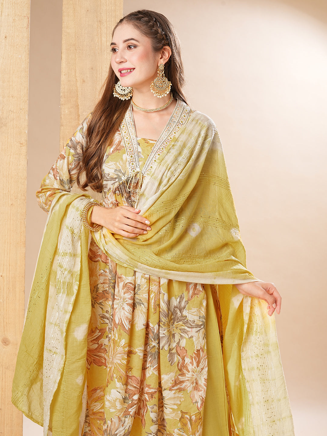 Floral Printed Mirror & Resham Embroidered Pleated Kurta with Pants & Dupatta - Yellow