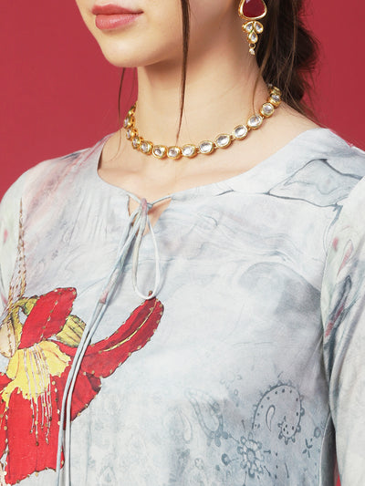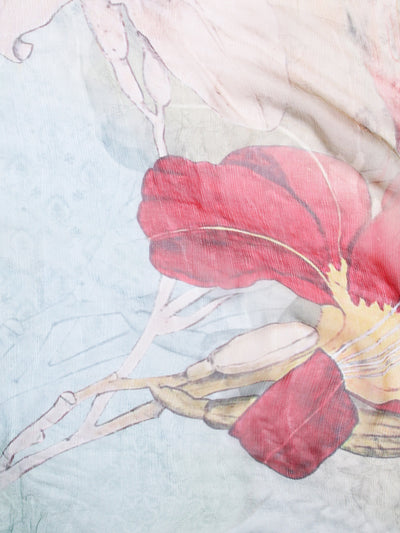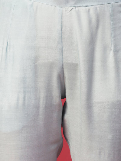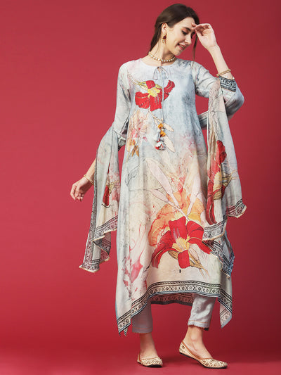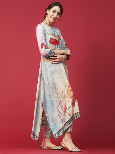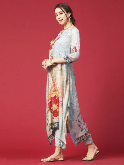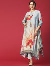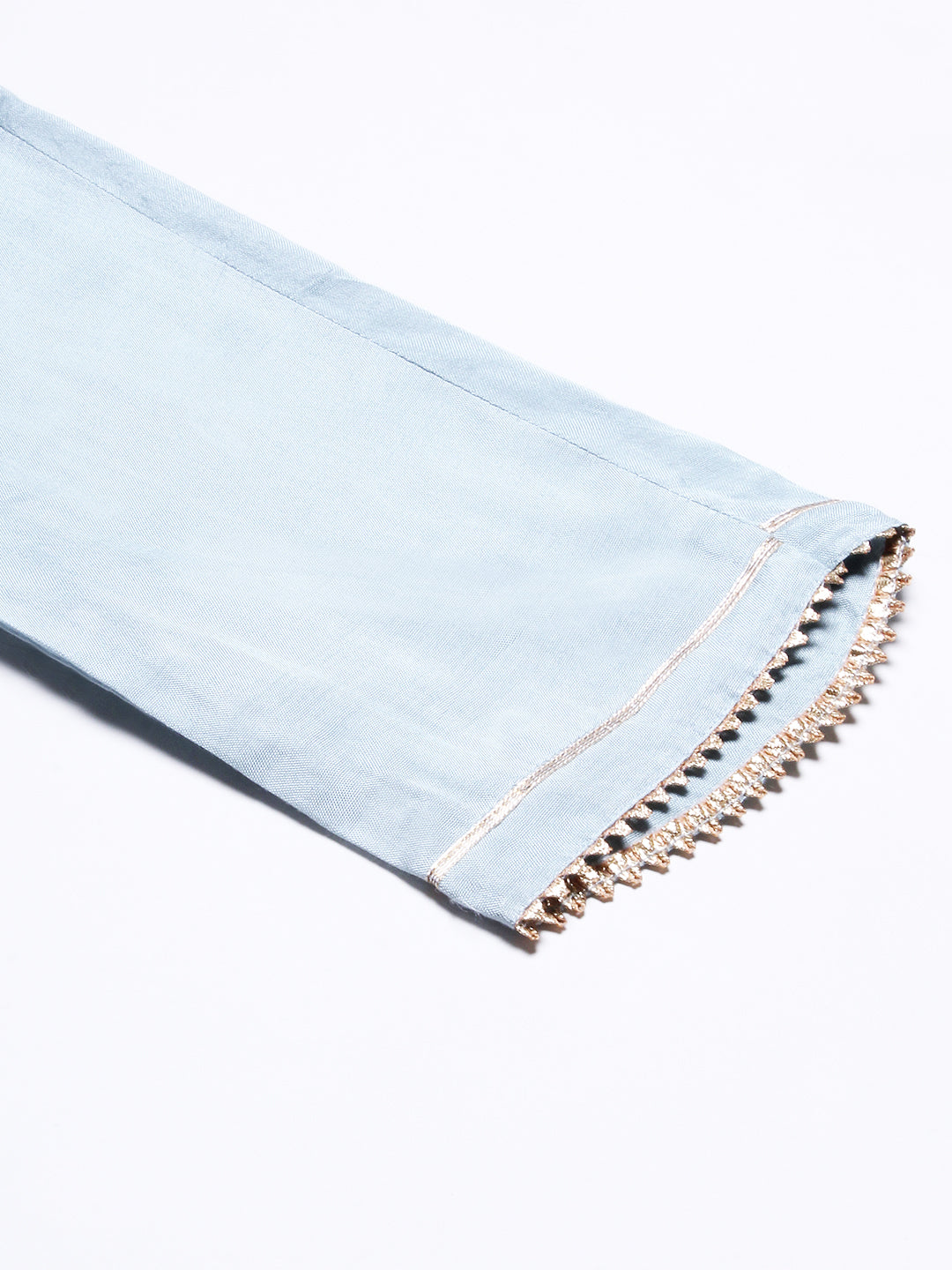 Floral Printed Mukaish Hot Fix Embroidered Kurta With Pants & Dupatta - Powder Blue & Multi
