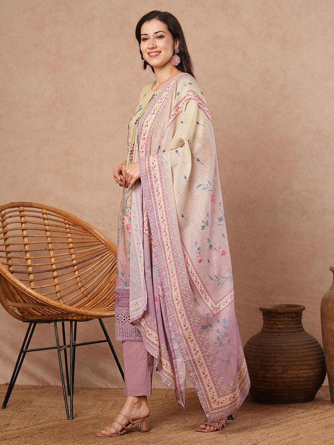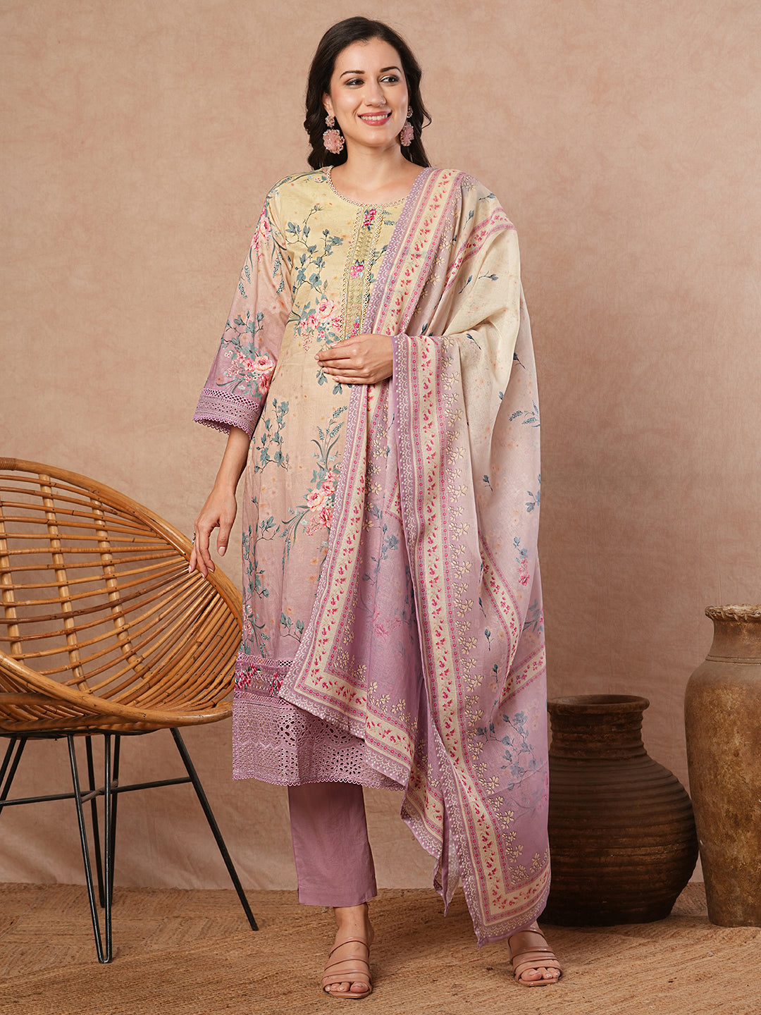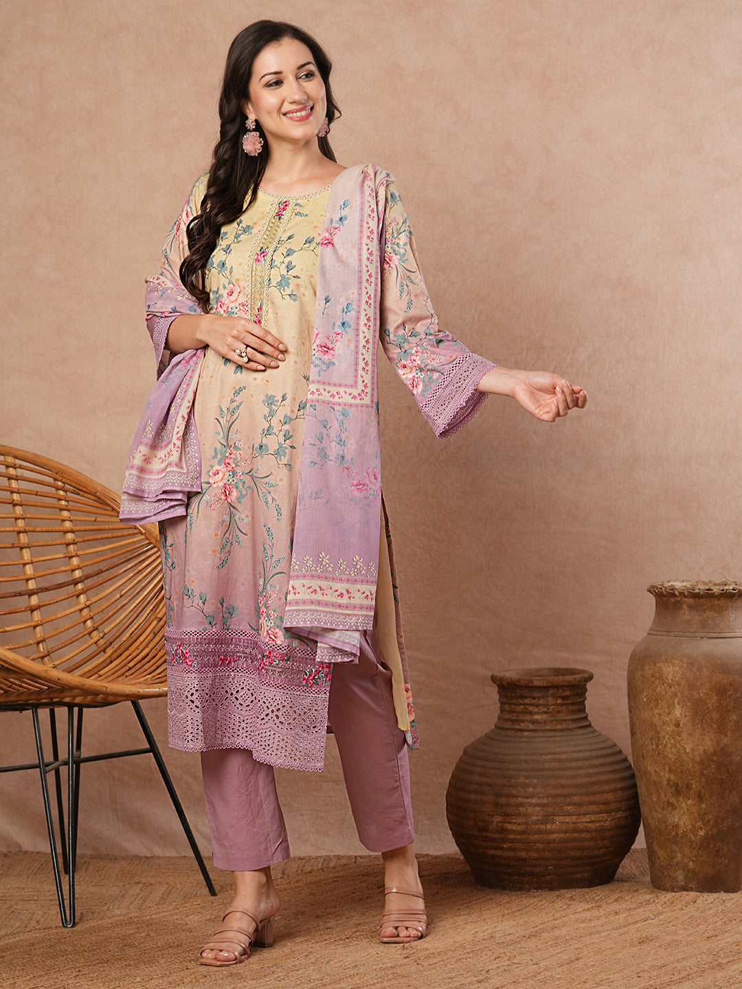 Floral Printed Schiffli Embroidered Straight Fit Kurta with Pant and Dupatta - Multi