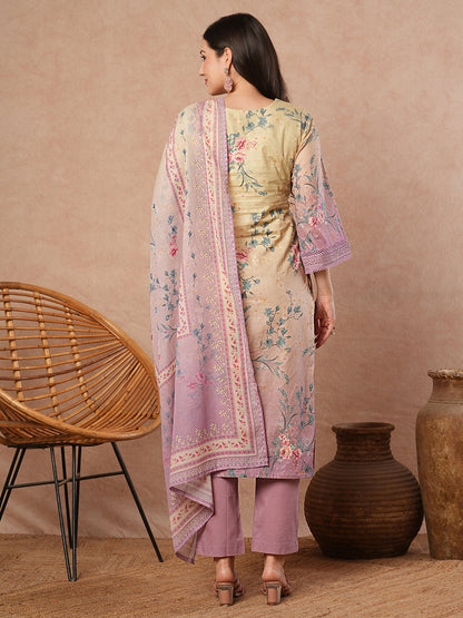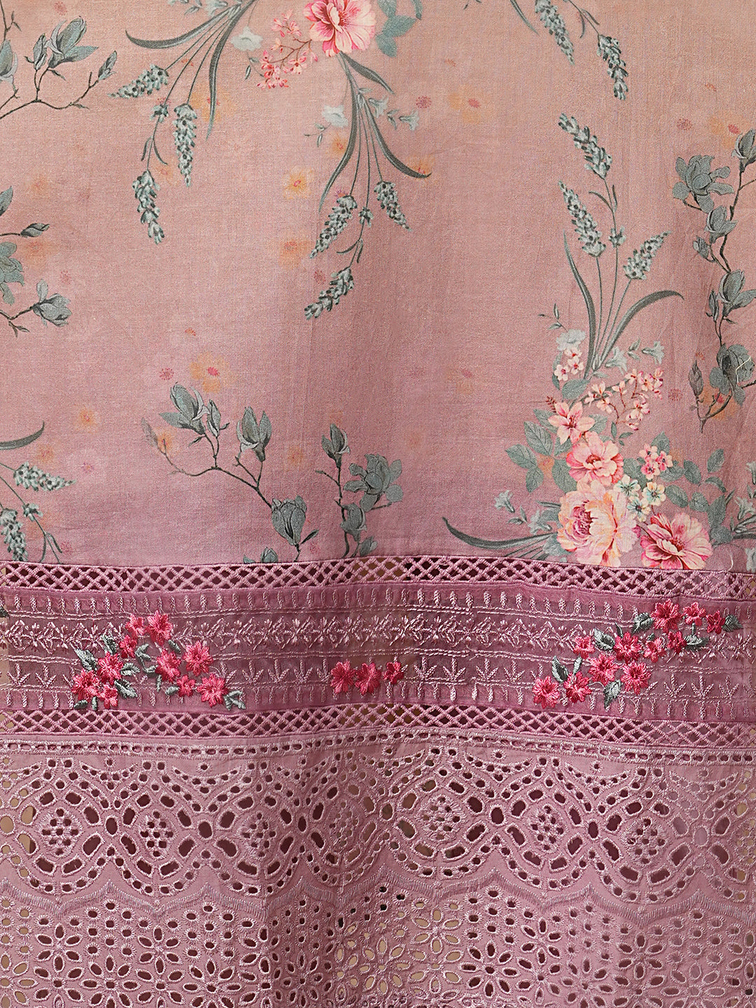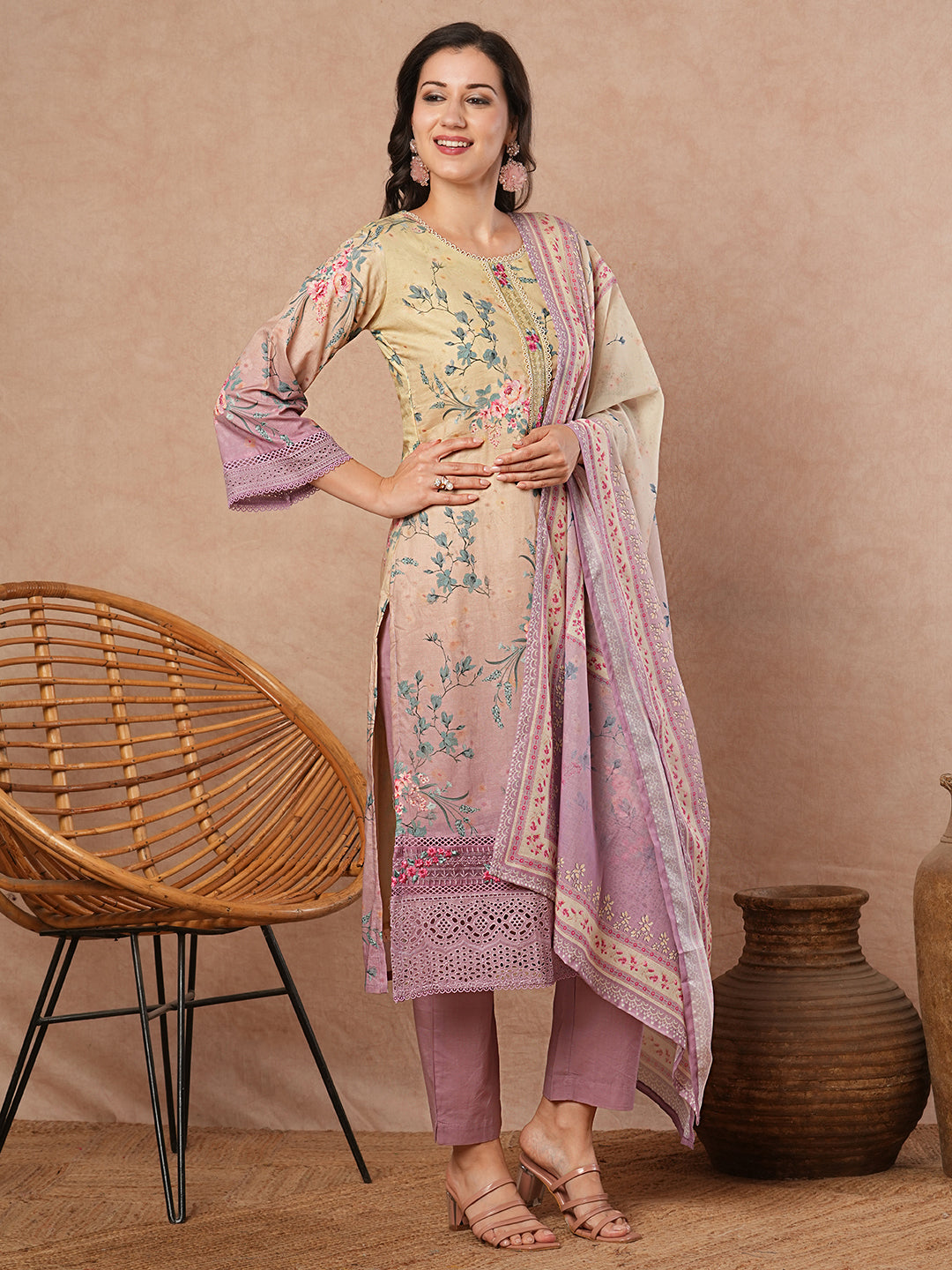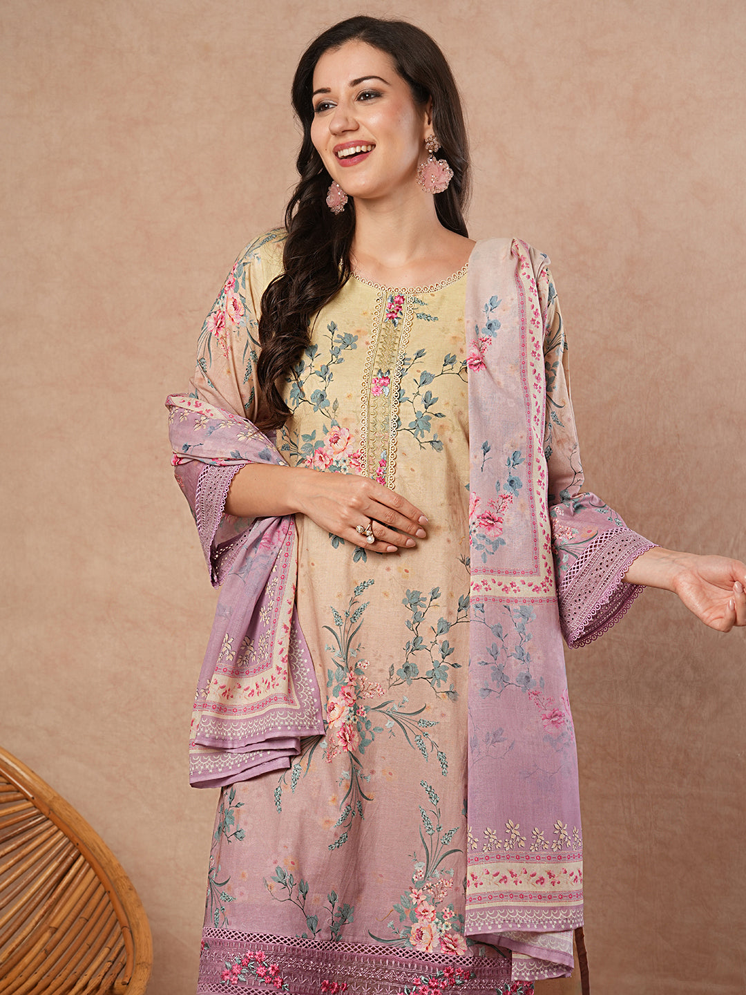Floral Printed Schiffli Embroidered Straight Fit Kurta with Pant and Dupatta - Multi