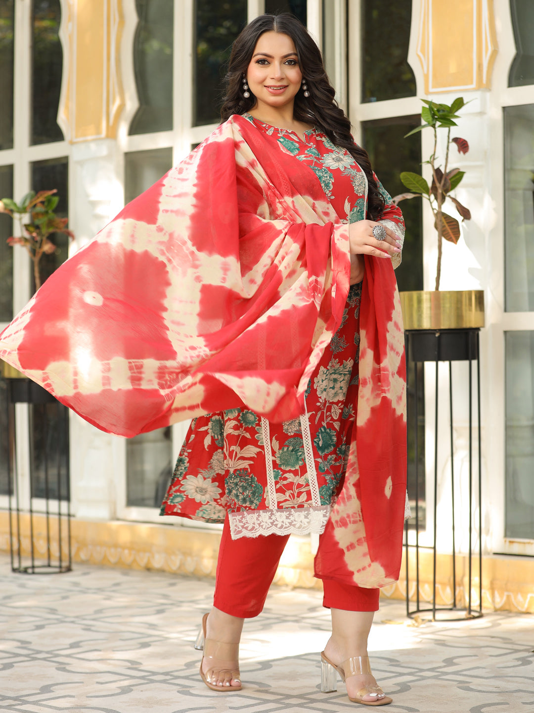Floral Printed Sequins & Resham Lace Embellished Kurta with Pants & Shibori Dupatta - Red