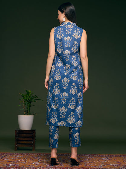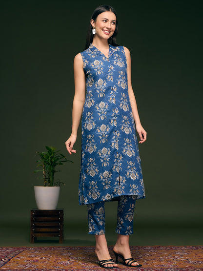 -Infuse artisanal elegance into your wardrobe with this Blue Floral Printed Straight Fit Co-ord Set. Tailored from breathable cotton flax, it features a sophisticated lapel collar and is paired with a coordinated pant for effortless style. Provided with Detachable Sleeves inside the Garment. The intricate Floral-inspired print adds a touch of heritage charm to this contemporary silhouette—perfect for chic daywear or relaxed gatherings.