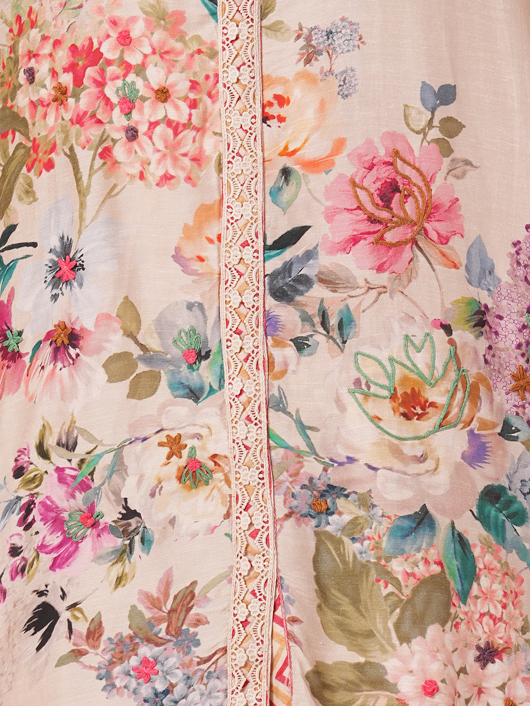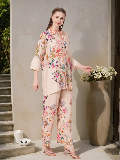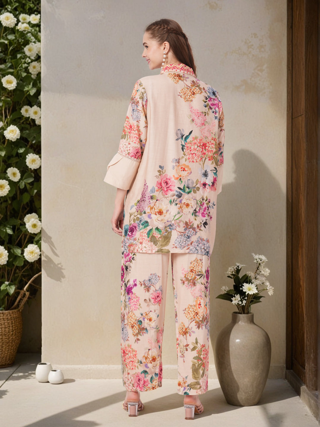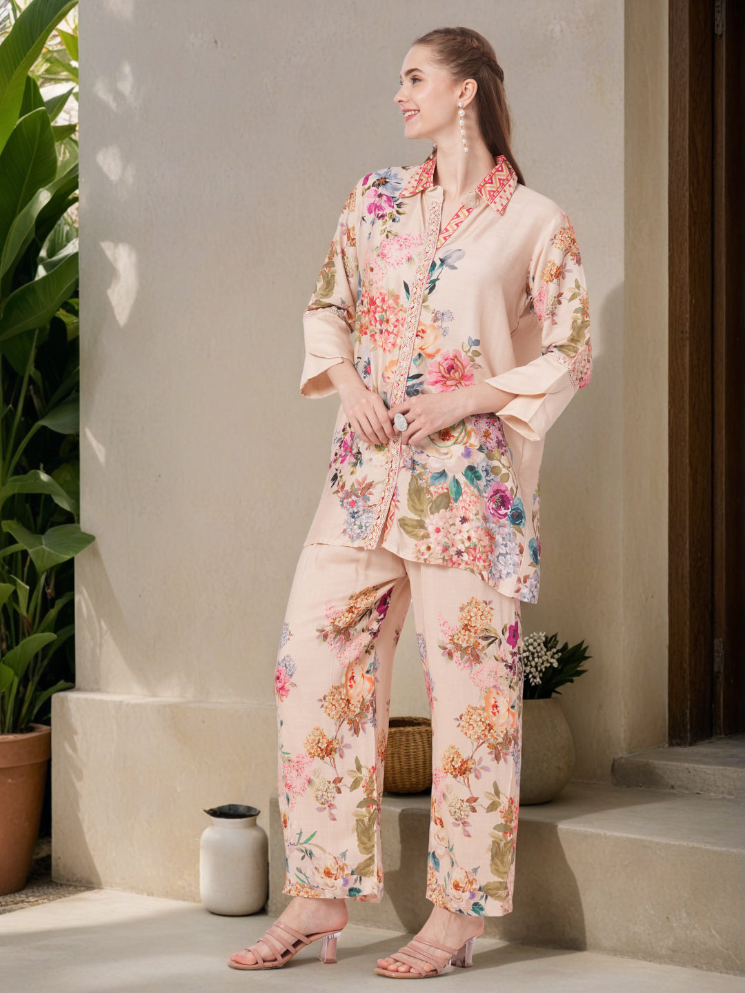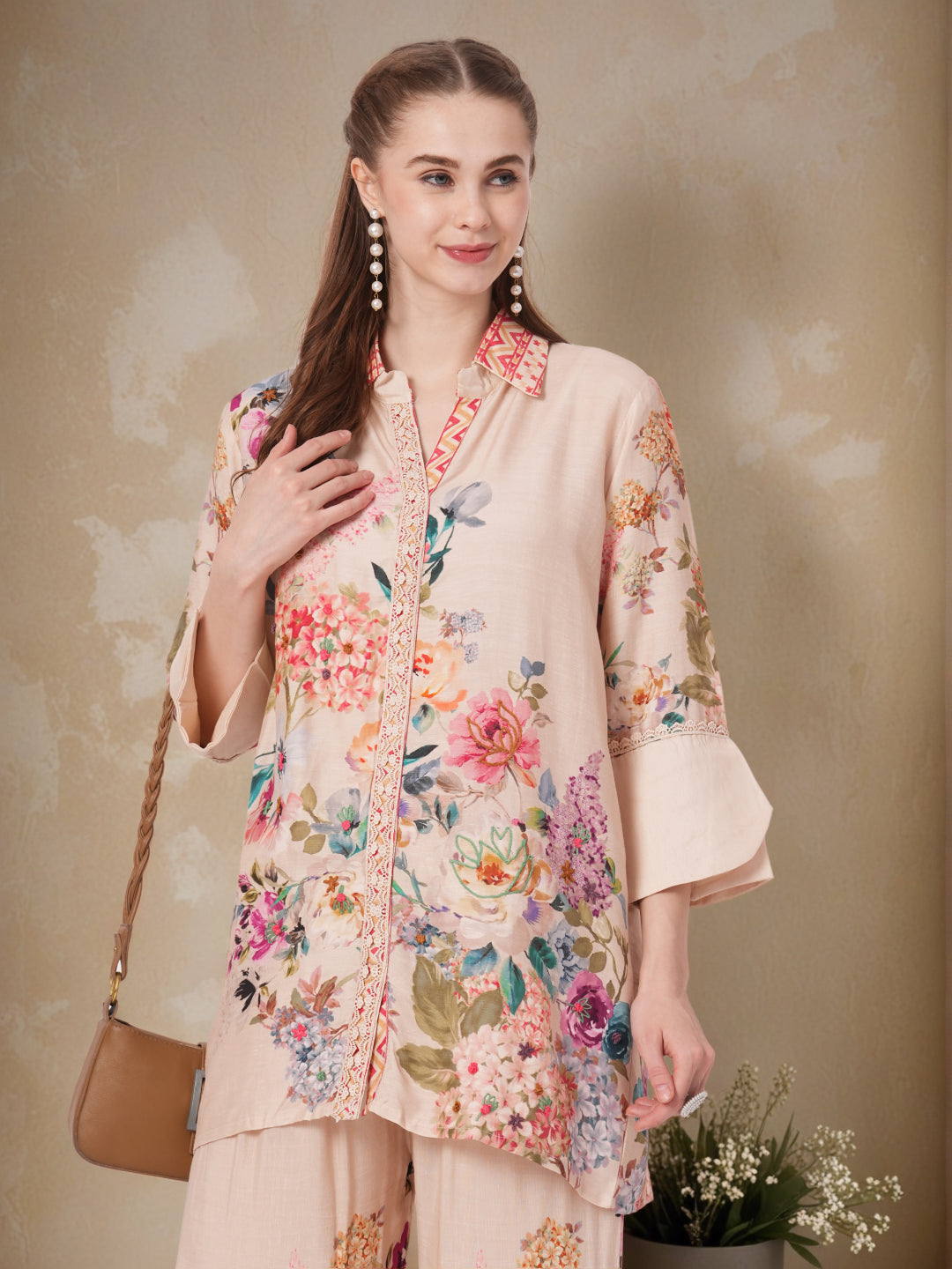 Elevate your style with this cream floral co-ord set in luxe muslin silk. Featuring a straight-fit shirt with a chic collar and delicate crochet lace detailing, it's paired with flowy printed palazzos for effortless elegance. Perfect for daytime charm or evening grace.