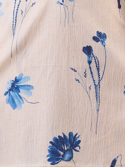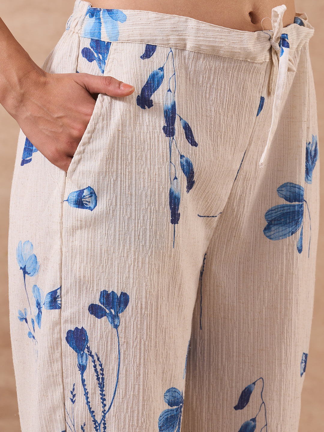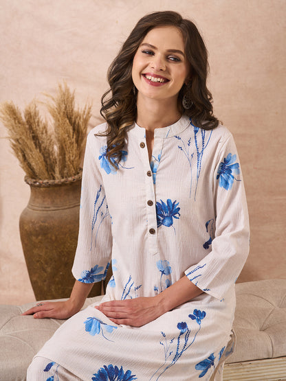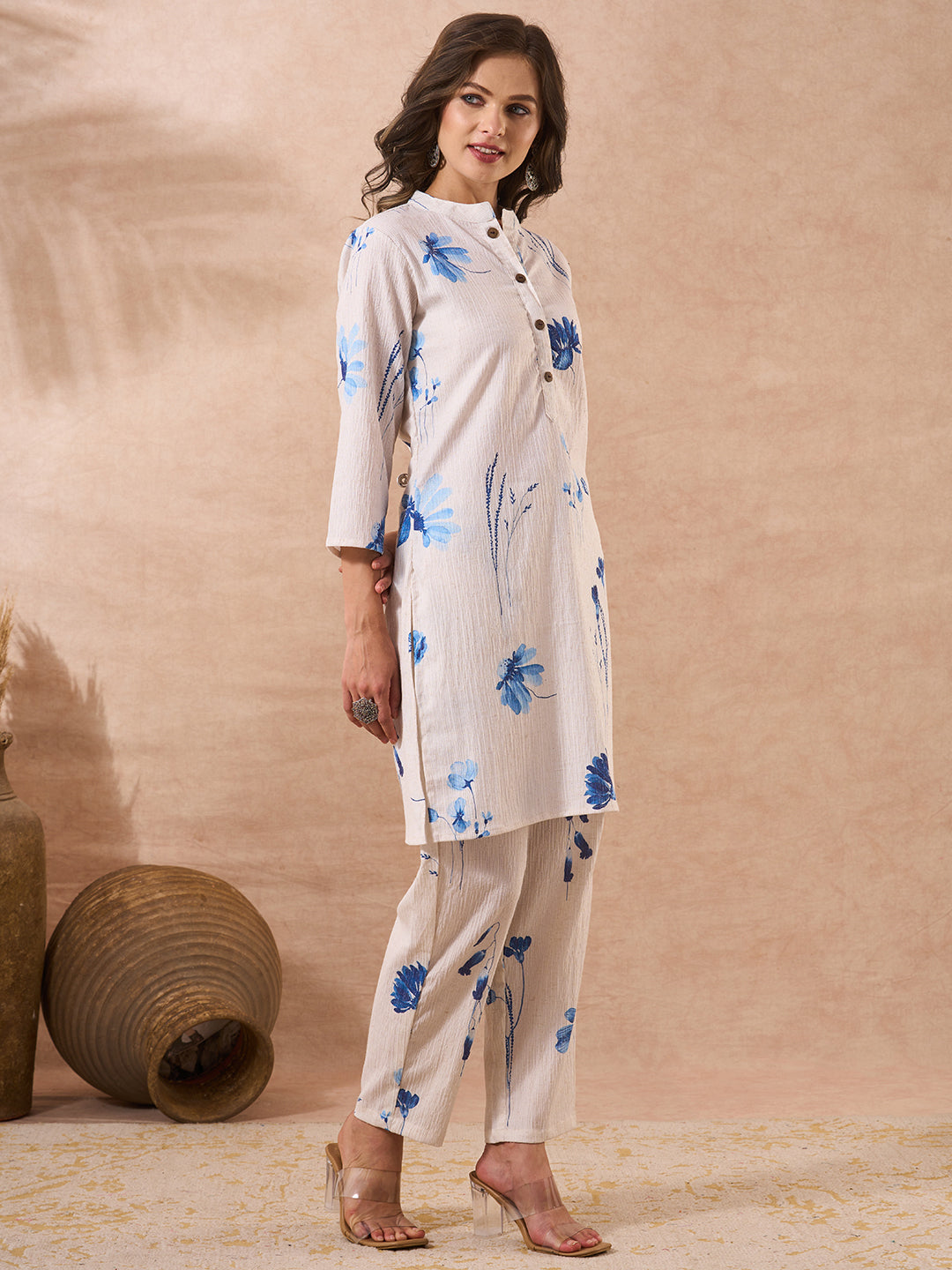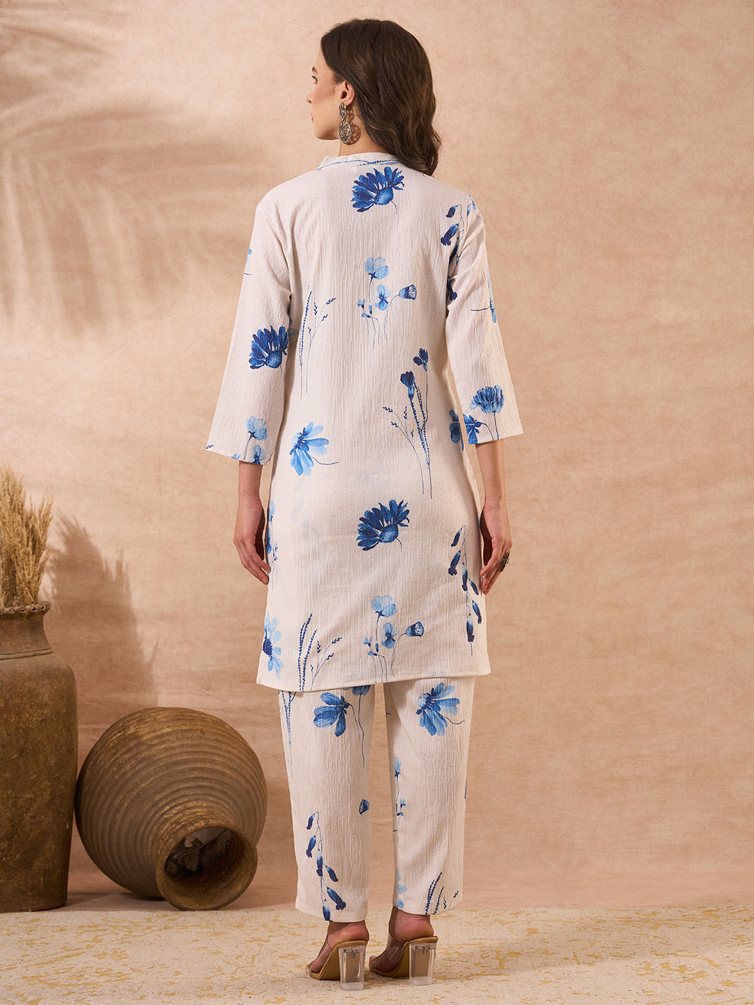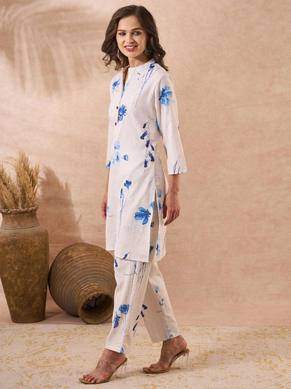 Floral Printed Straight Fit Cotton Crepe Co-ord Set - White