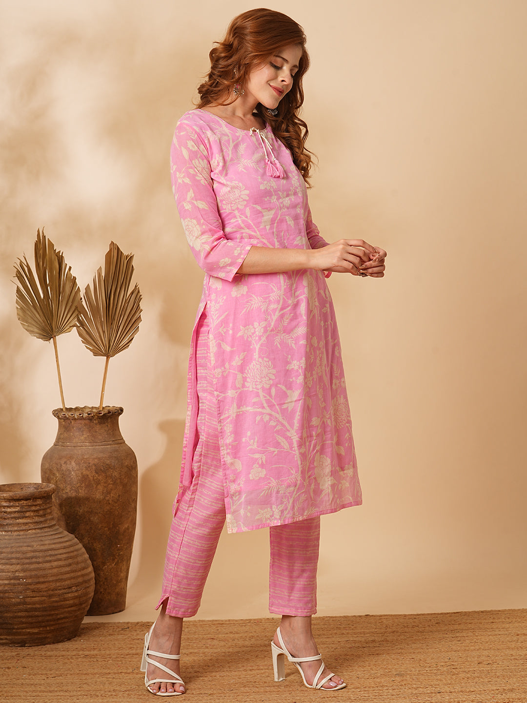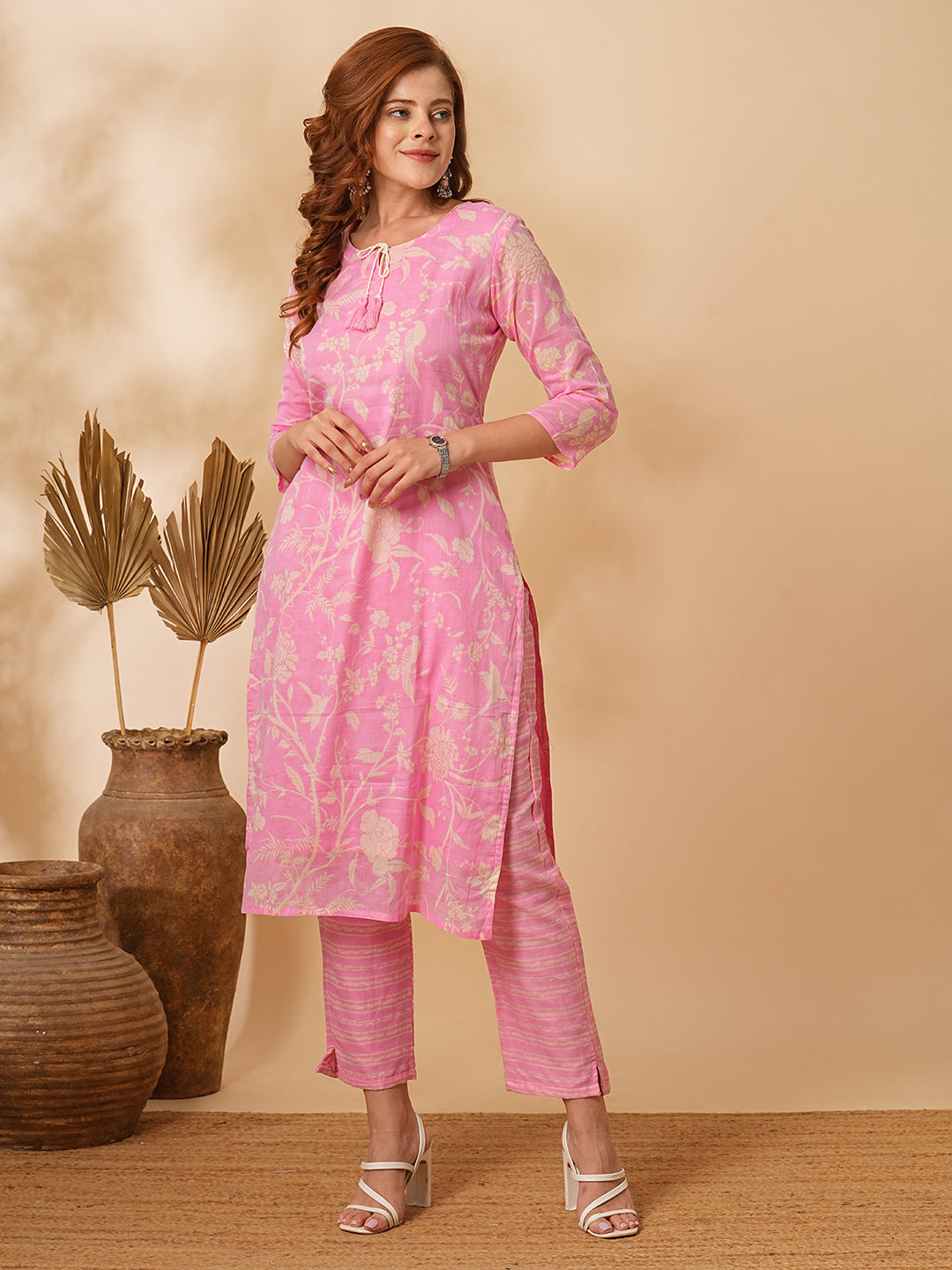 Floral Printed Straight Fit Kurta with Pant - Pink