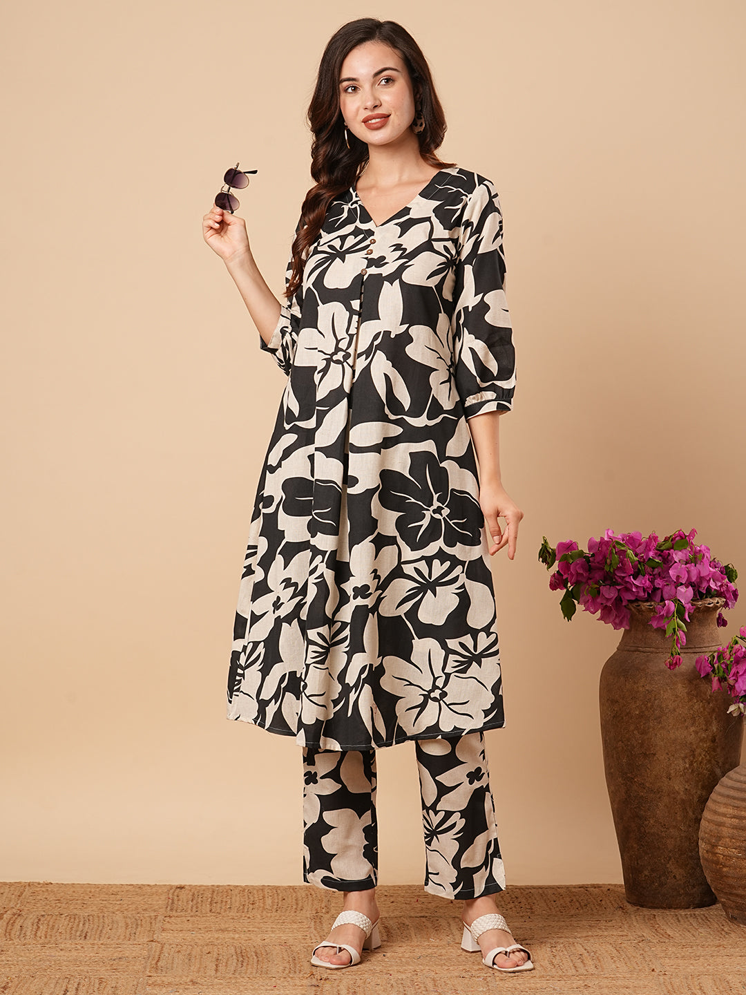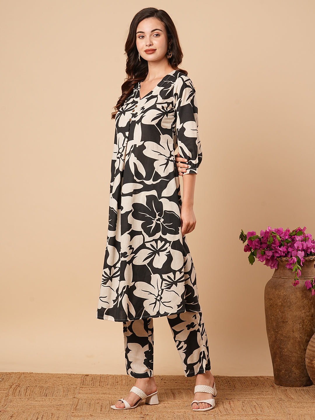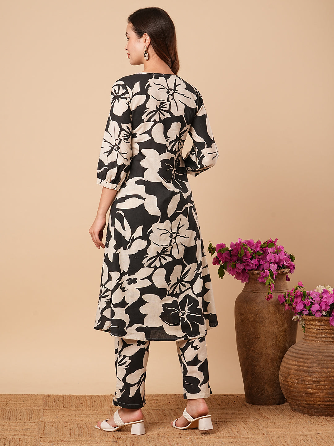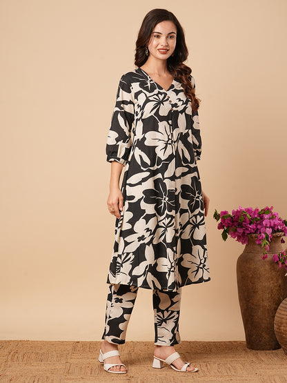 Floral Printed Wooden Buttoned A-line Kurta with Pants - Black & Off White