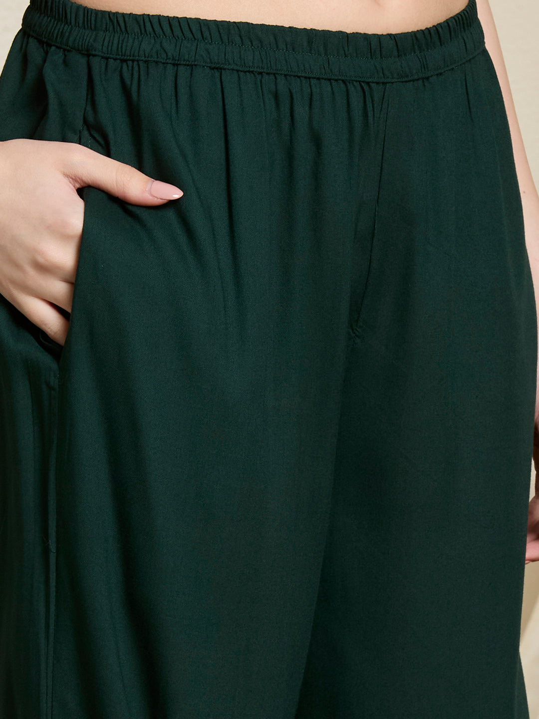 Refresh your ethnic style with this Green Floral Threadwork Co-ord Set, crafted in soft, breathable viscose rayon fabric. The straight-fit silhouette features a classic round neckline and intricate floral threadwork embroidery that adds a touch of elegance. Effortlessly stylish and comfortable — perfect for casual festivities or daytime outings.