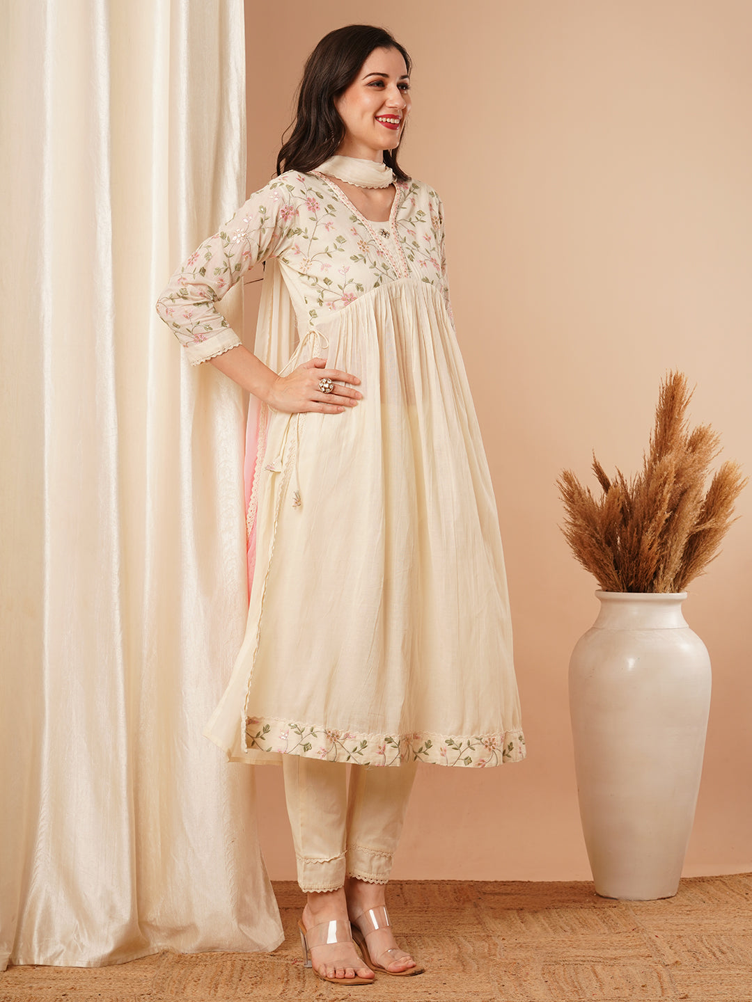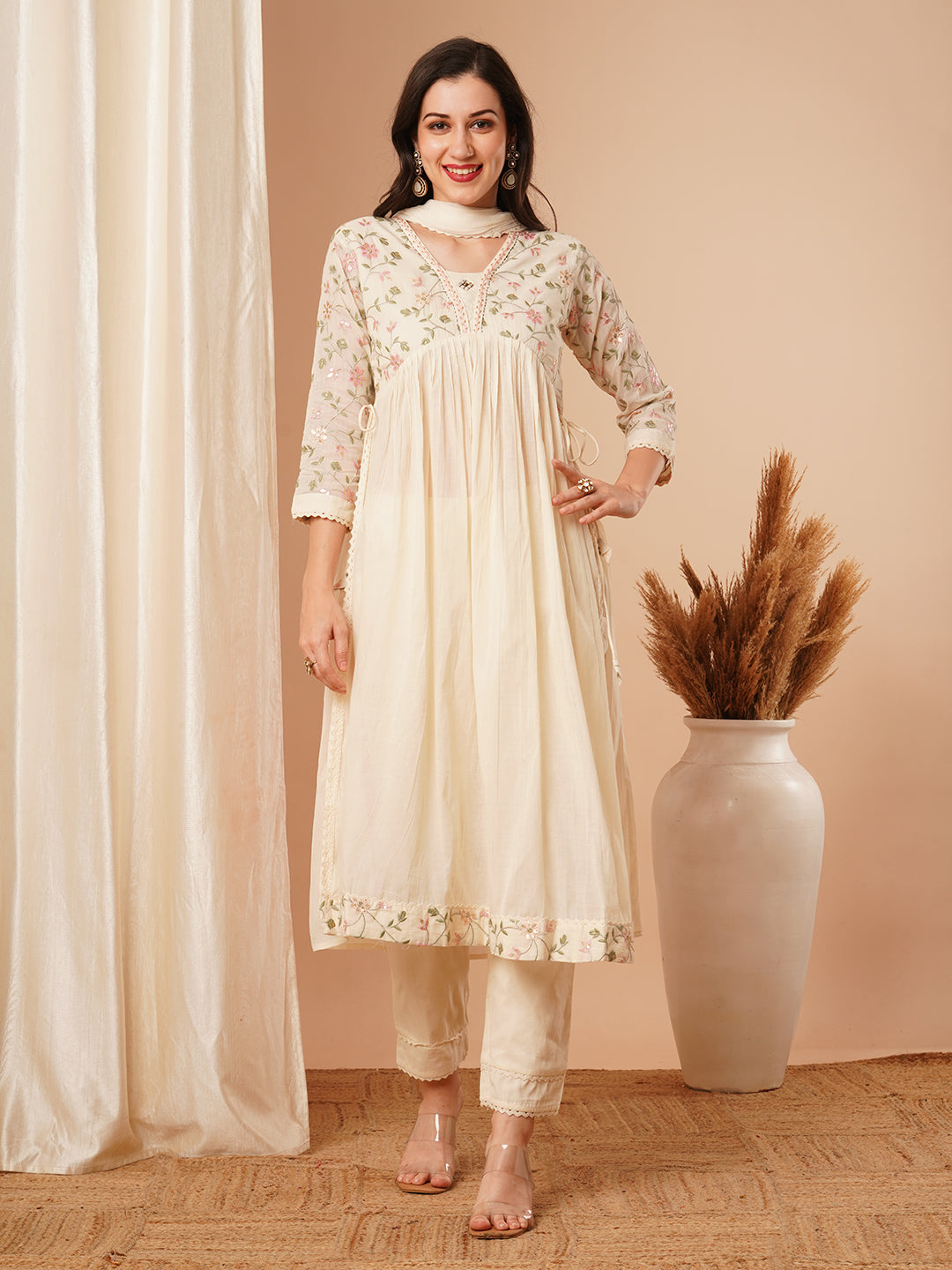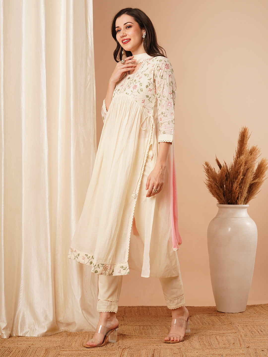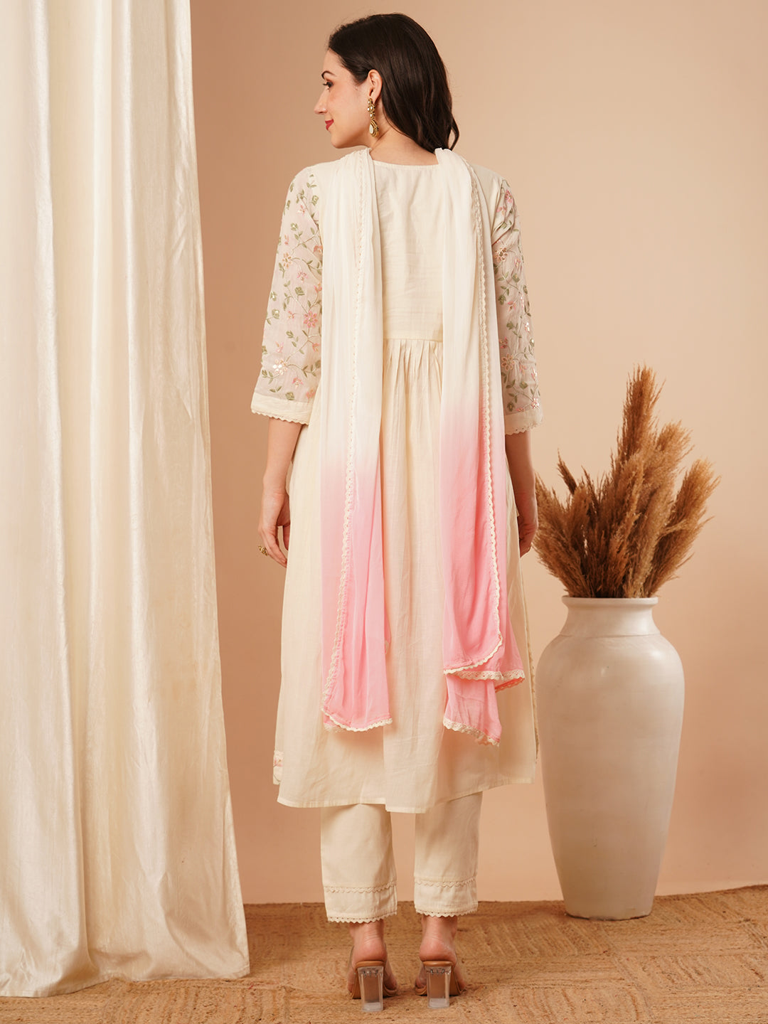Floral Zari Embroidered A-Line Pleated Kurta with Pant & Ombre Dupatta - Off White