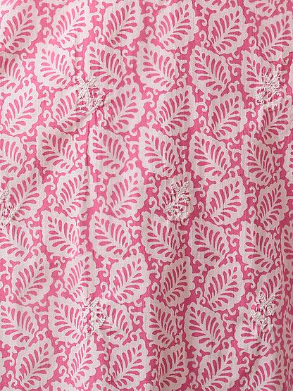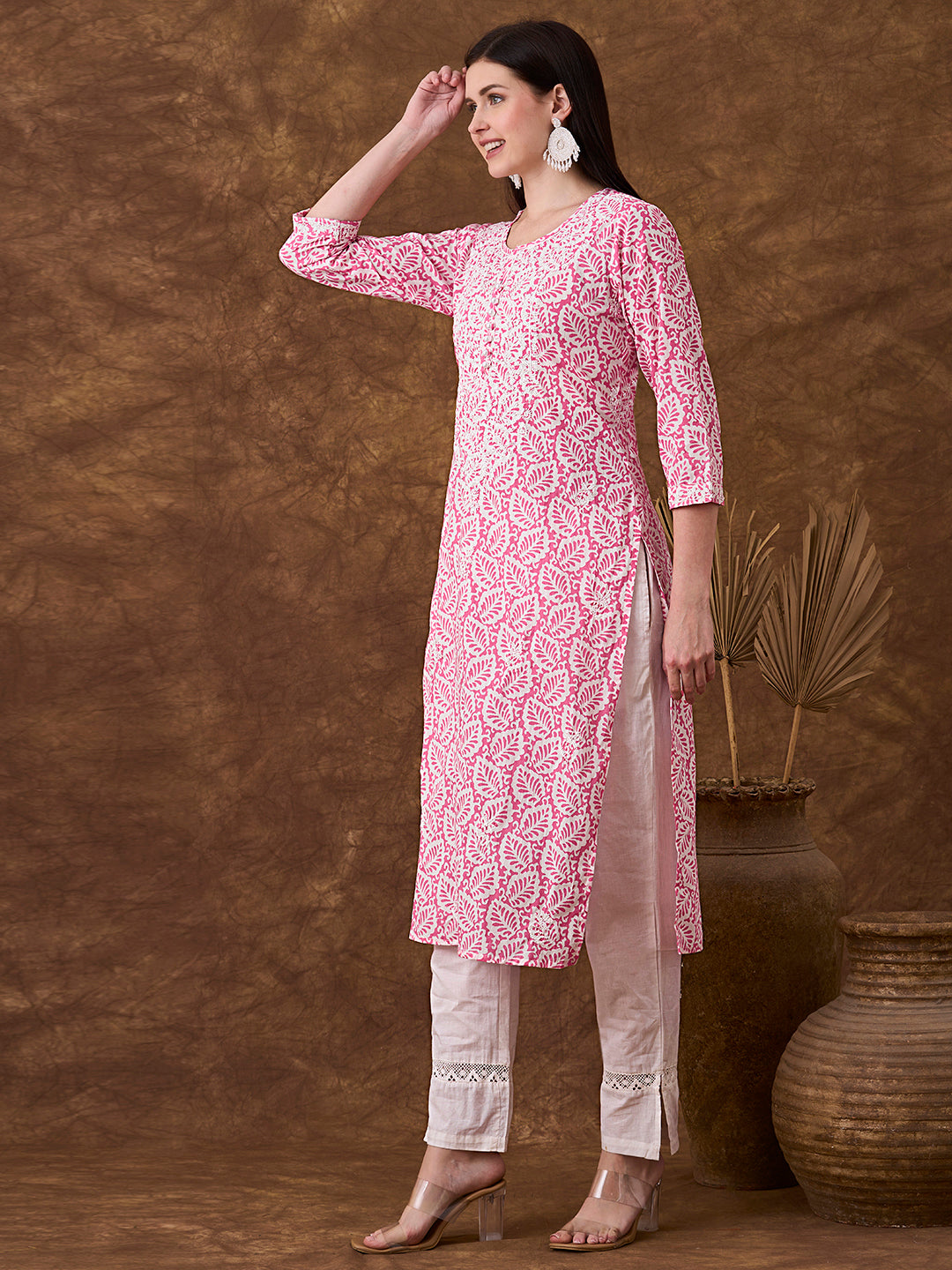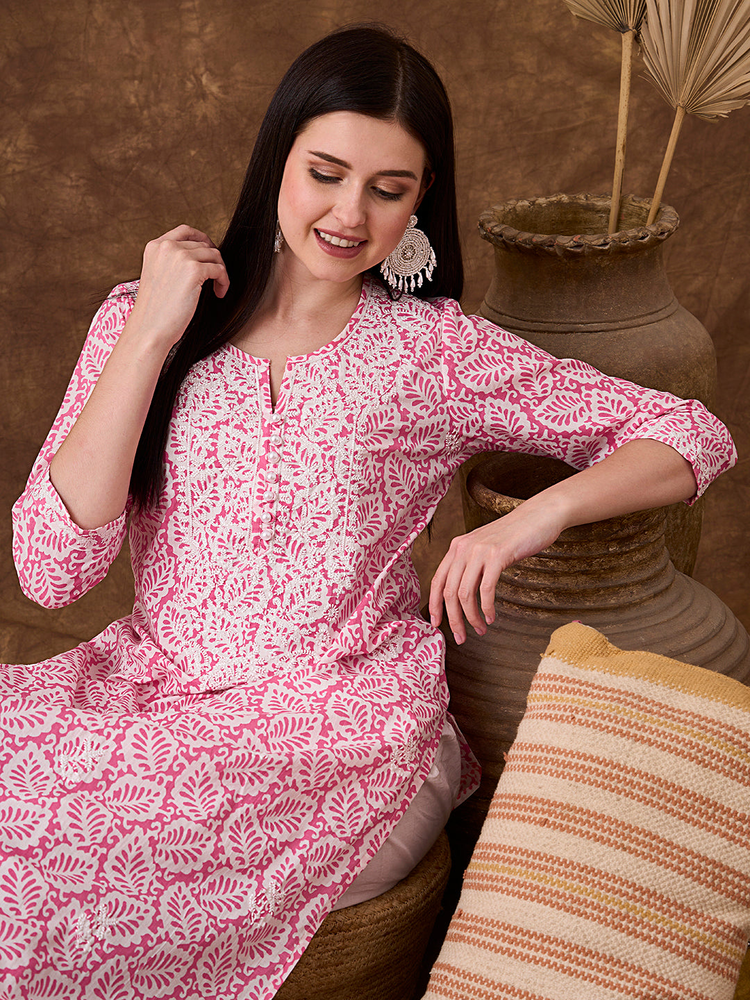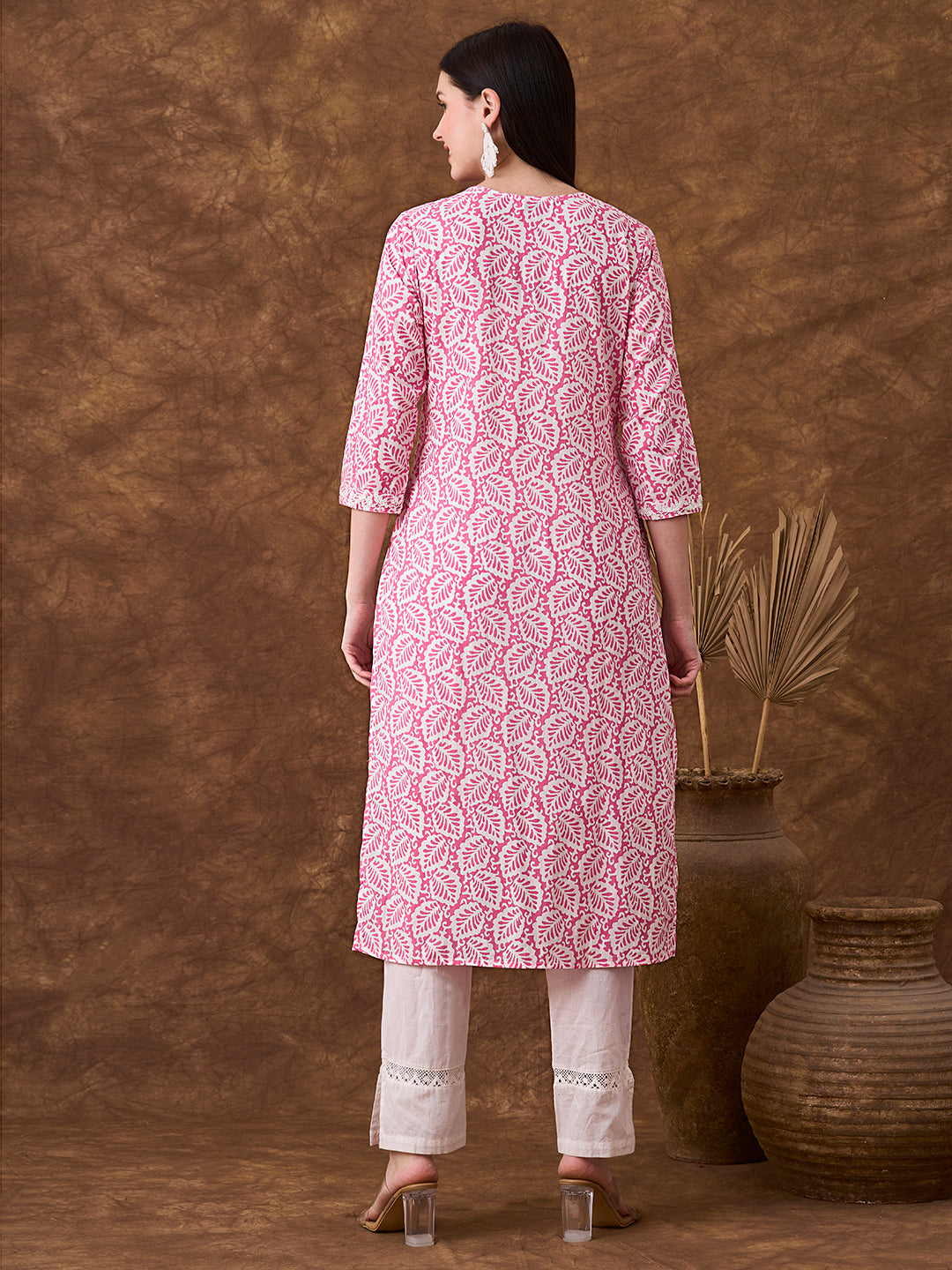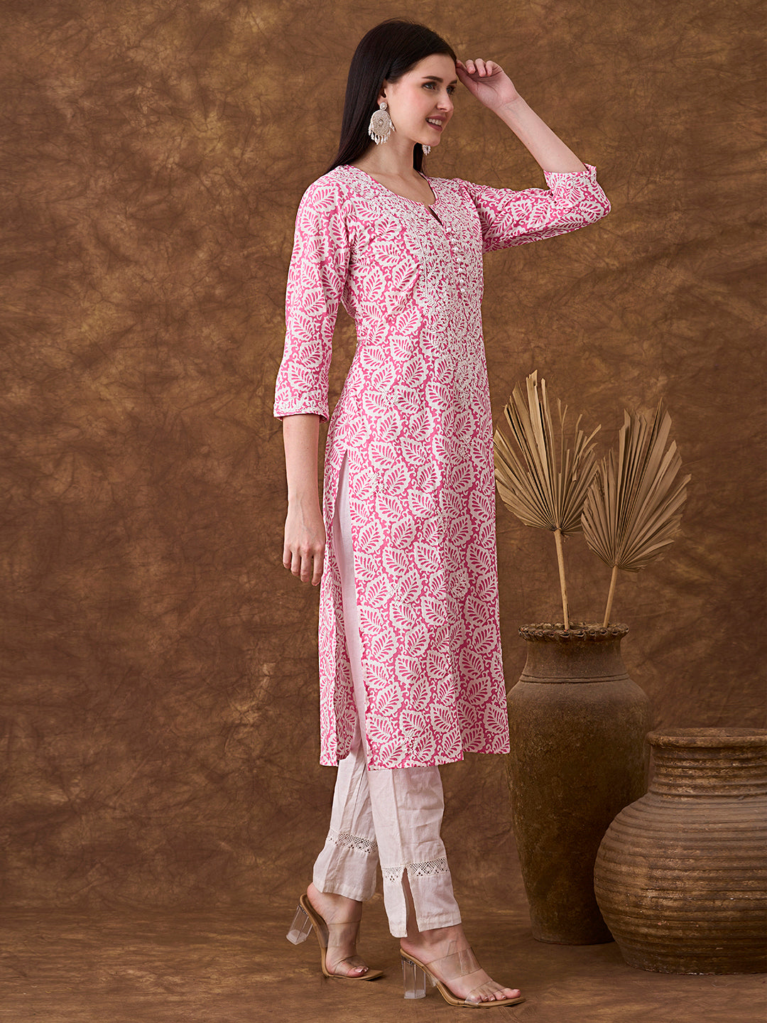 Ethnic Floral Printed Embroidered Straight Fit Kurta - Pink