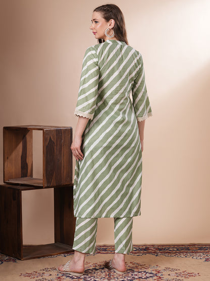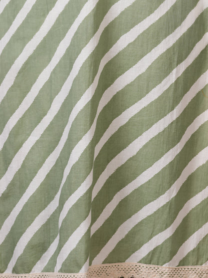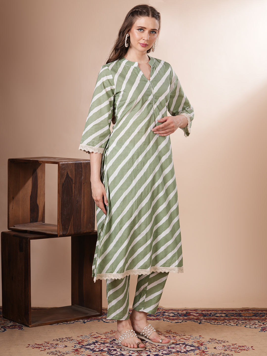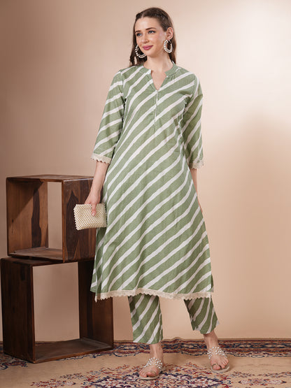 Embrace the vibrant spirit of Rajasthan with this exquisite Leheriya Printed A-Line Co-ord Set in refreshing green. Crafted from soft cotton fabric, the ensemble features an eye-catching tie-dye pattern inspired by the traditional Leheriya technique—a signature of Jaipur's rich textile heritage .The kurta boasts a flattering A-line silhouette, adorned with delicate crochet lace detailing along the neckline and sleeves, adding a touch of artisanal elegance. Its V-neckline enhances the graceful flow of the piece, while the flared sleeves offer a relaxed yet refined look. Paired with matching printed pants, this set is perfect for festive occasions or casual gatherings, exuding timeless charm and cultural flair.