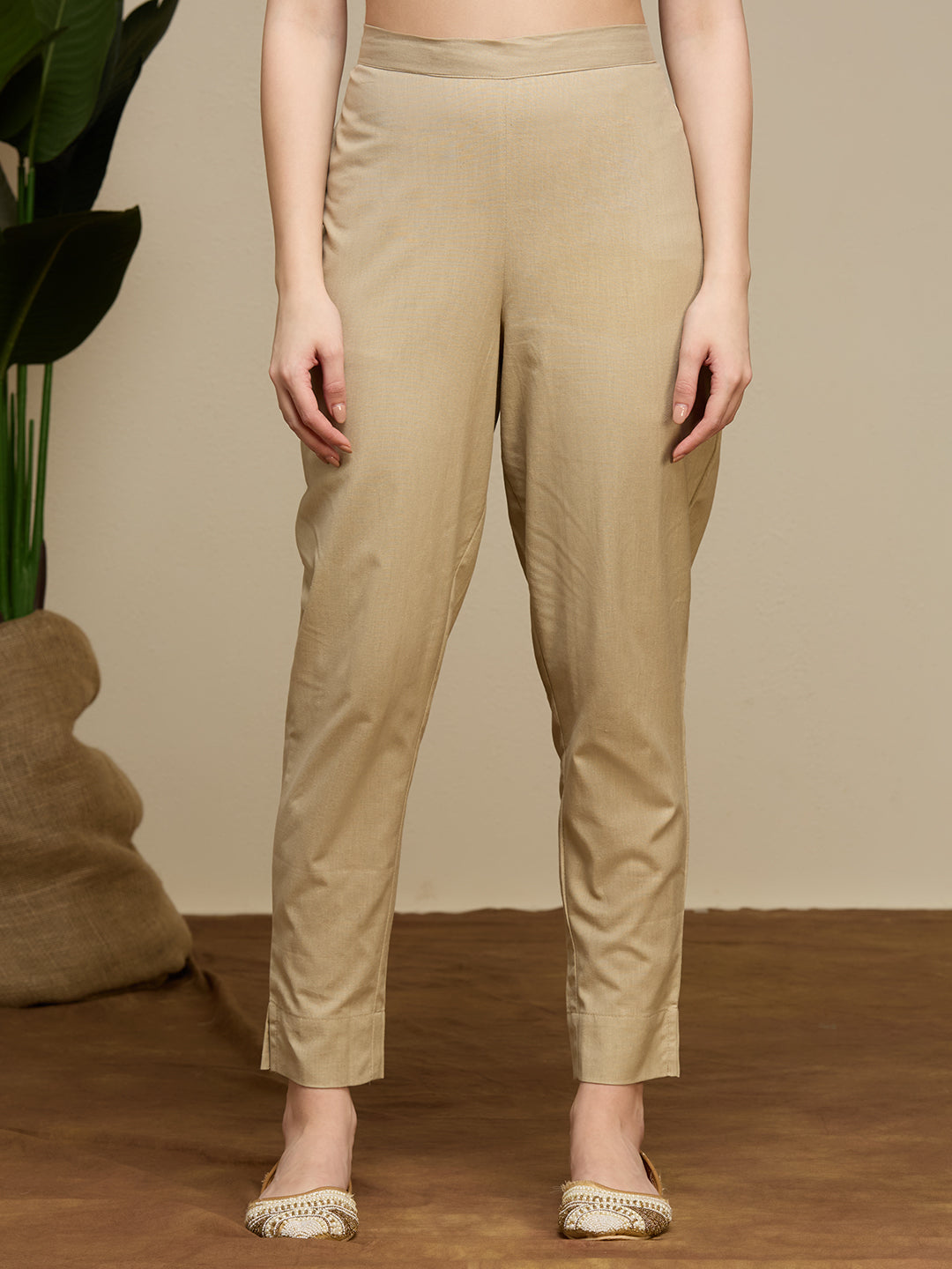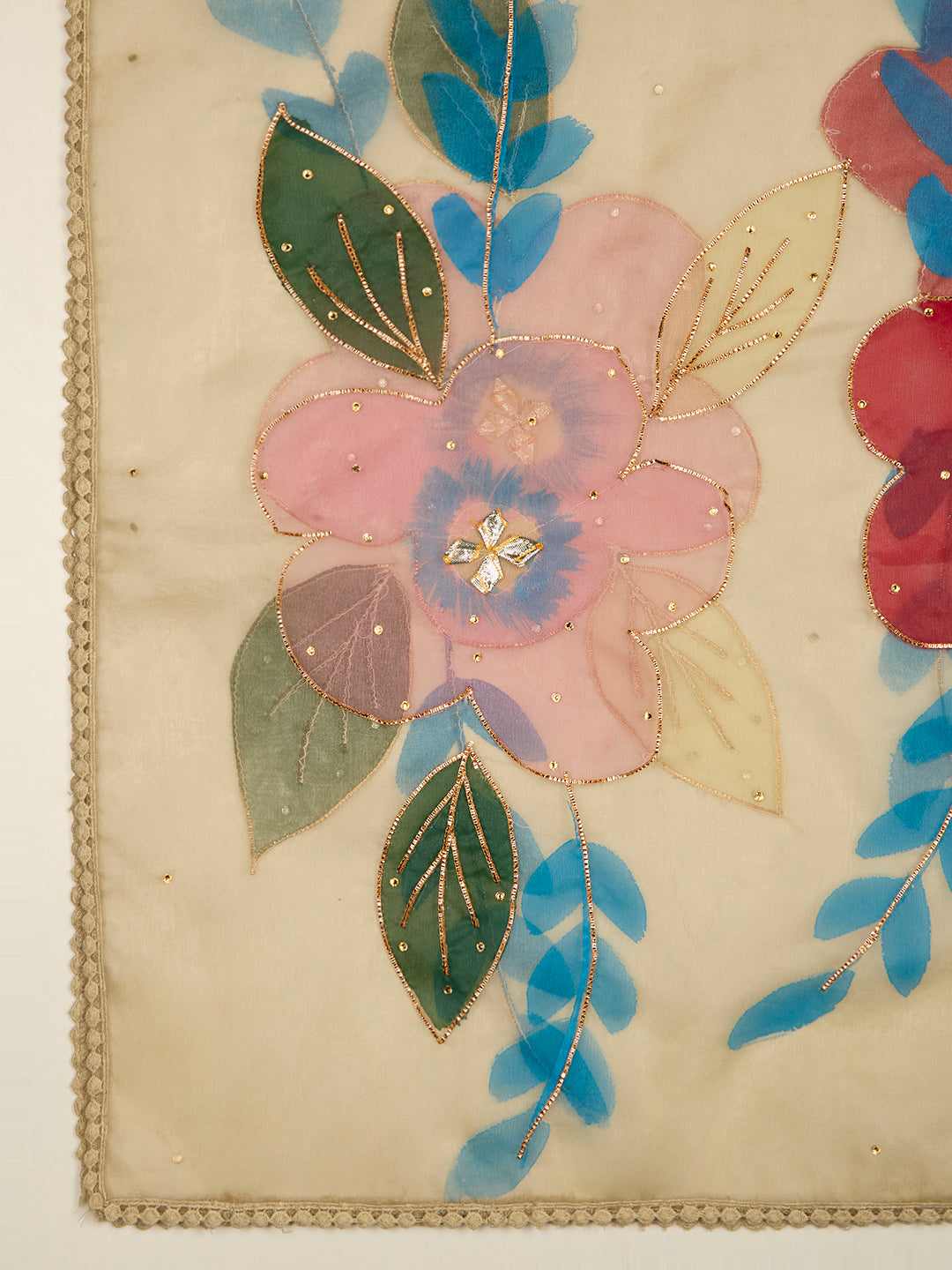Grace your celebrations in this Beige Lurex Striped Floral Embroidered Anarkali Set, crafted in breathable cotton with delicate embroidery and a flattering V-neckline. Paired with solid pants and a stunning hand-painted organza dupatta, this ensemble blends timeless elegance with artistic charm.