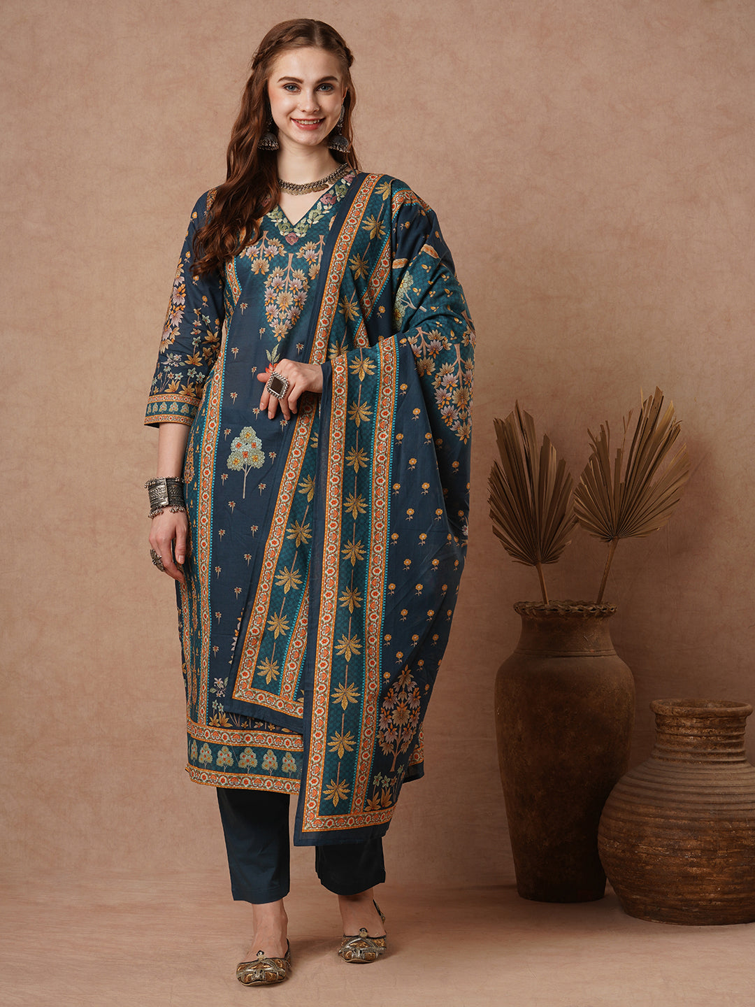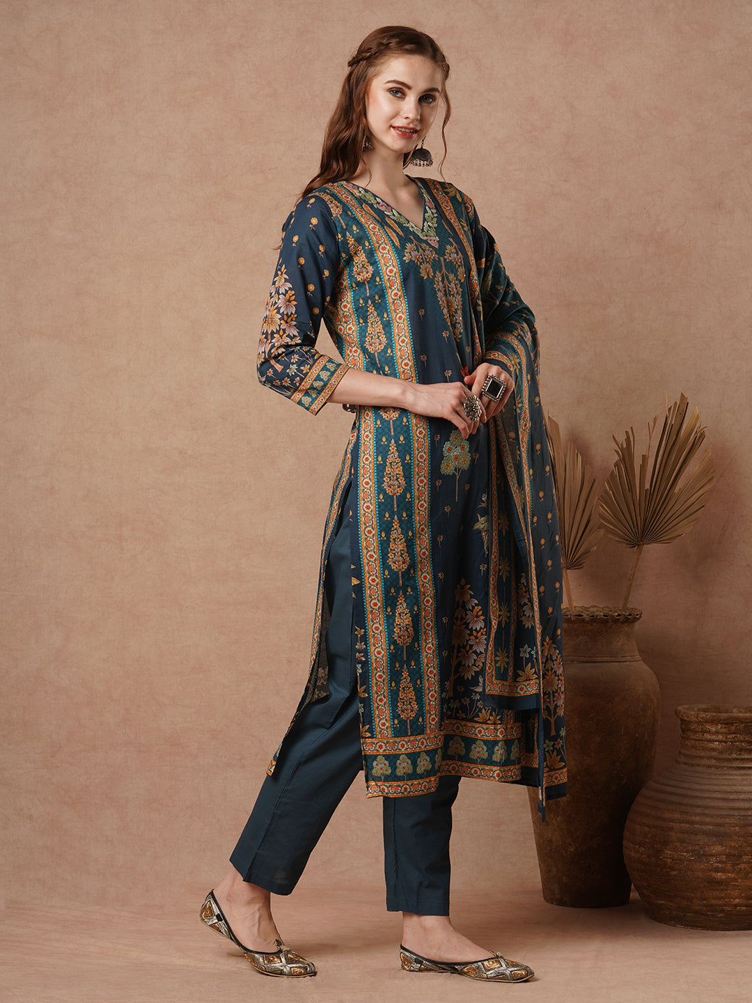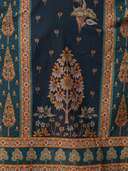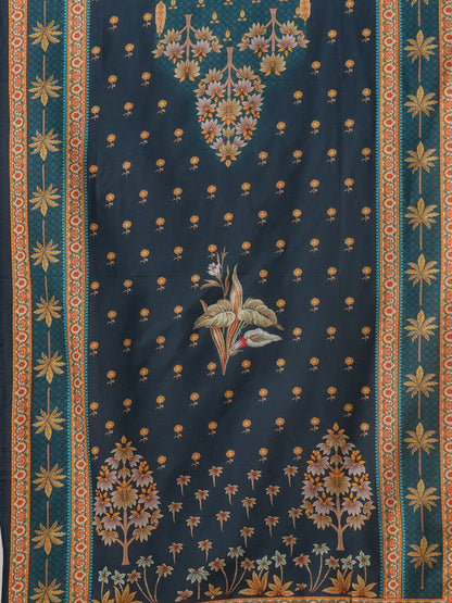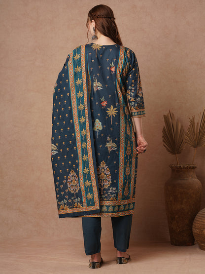 Mughal Floral Printed & Resham Hand Embroidered Straight Kurta with Pant & Dupatta - Teal Blue