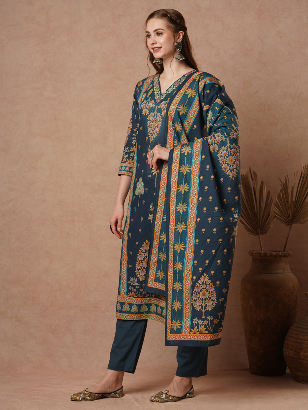 Elevate your everyday style with this elegant straight-fit kurta, beautifully adorned with delicate floral prints on the front. The intricate thread hand embroidery adds a touch of artisanal charm, enhancing its overall appeal. Designed for both comfort and sophistication, the kurta is paired with a solid-colored bottom that balances the ensemble with effortless grace. Completing the look is a printed dupatta that perfectly complements the design elements of the kurta, adding a splash of charm and harmony to the outfit. Ideal for daily wear, this ensemble effortlessly combines style, comfort, and tradition for a graceful look throughout the day.
