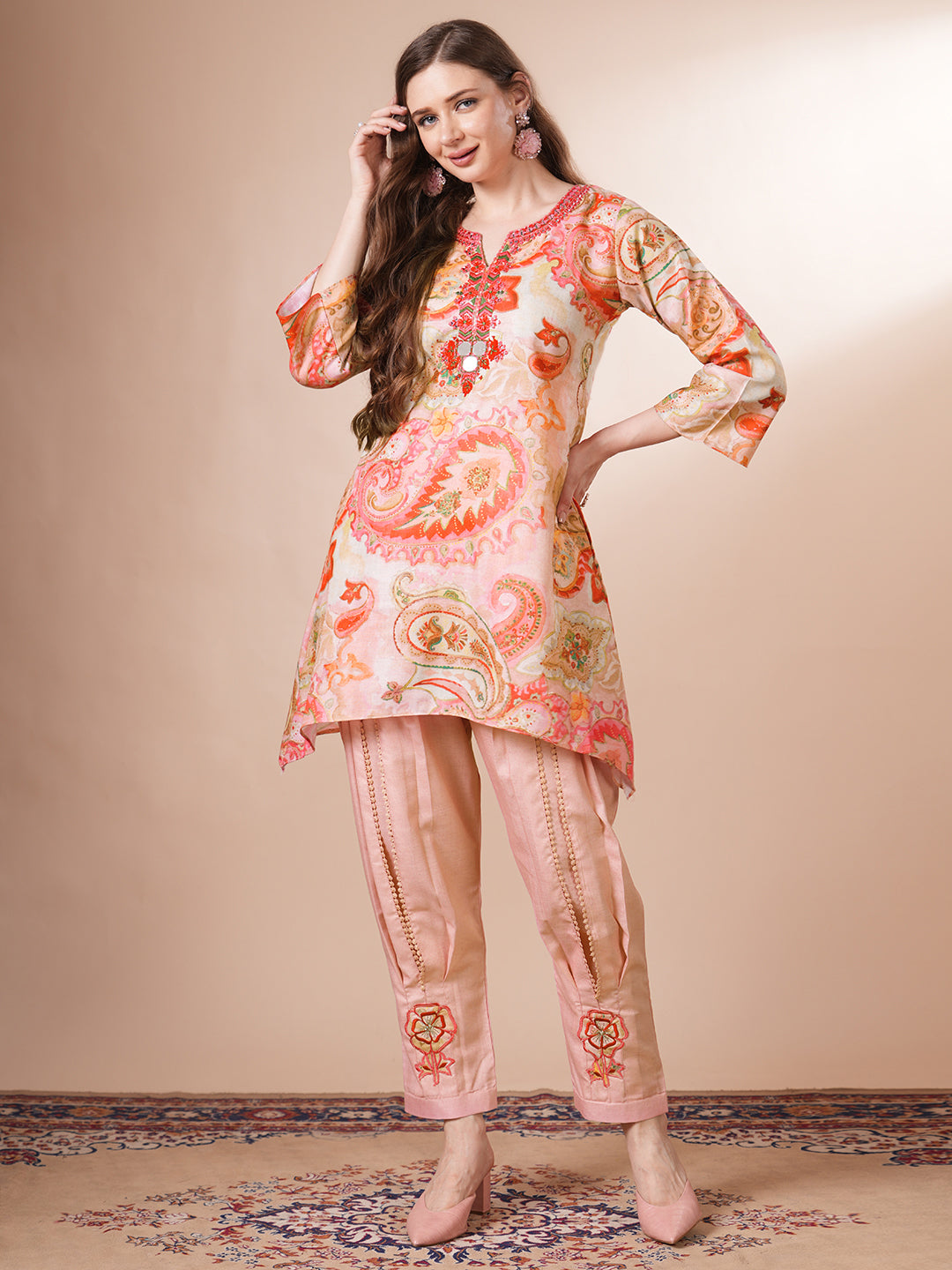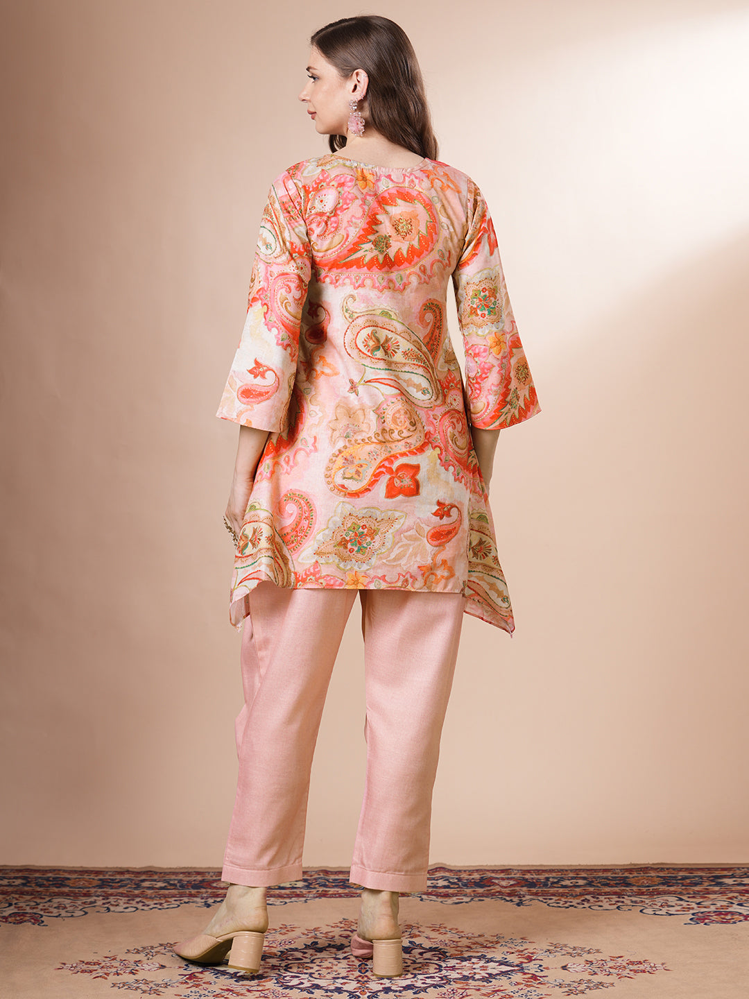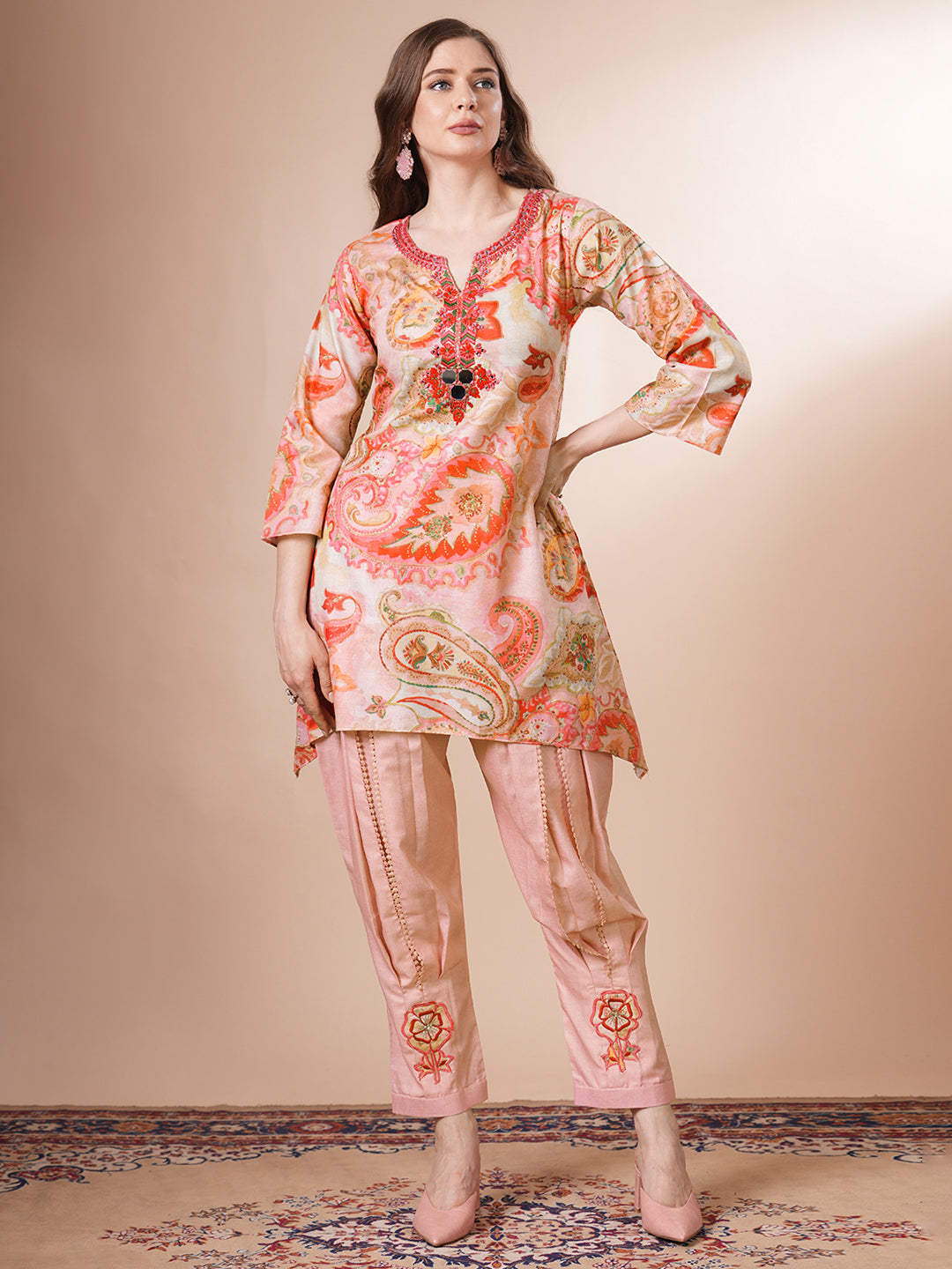 Paisley Printed Embroidered A-Line Kurta with Pant - Peach