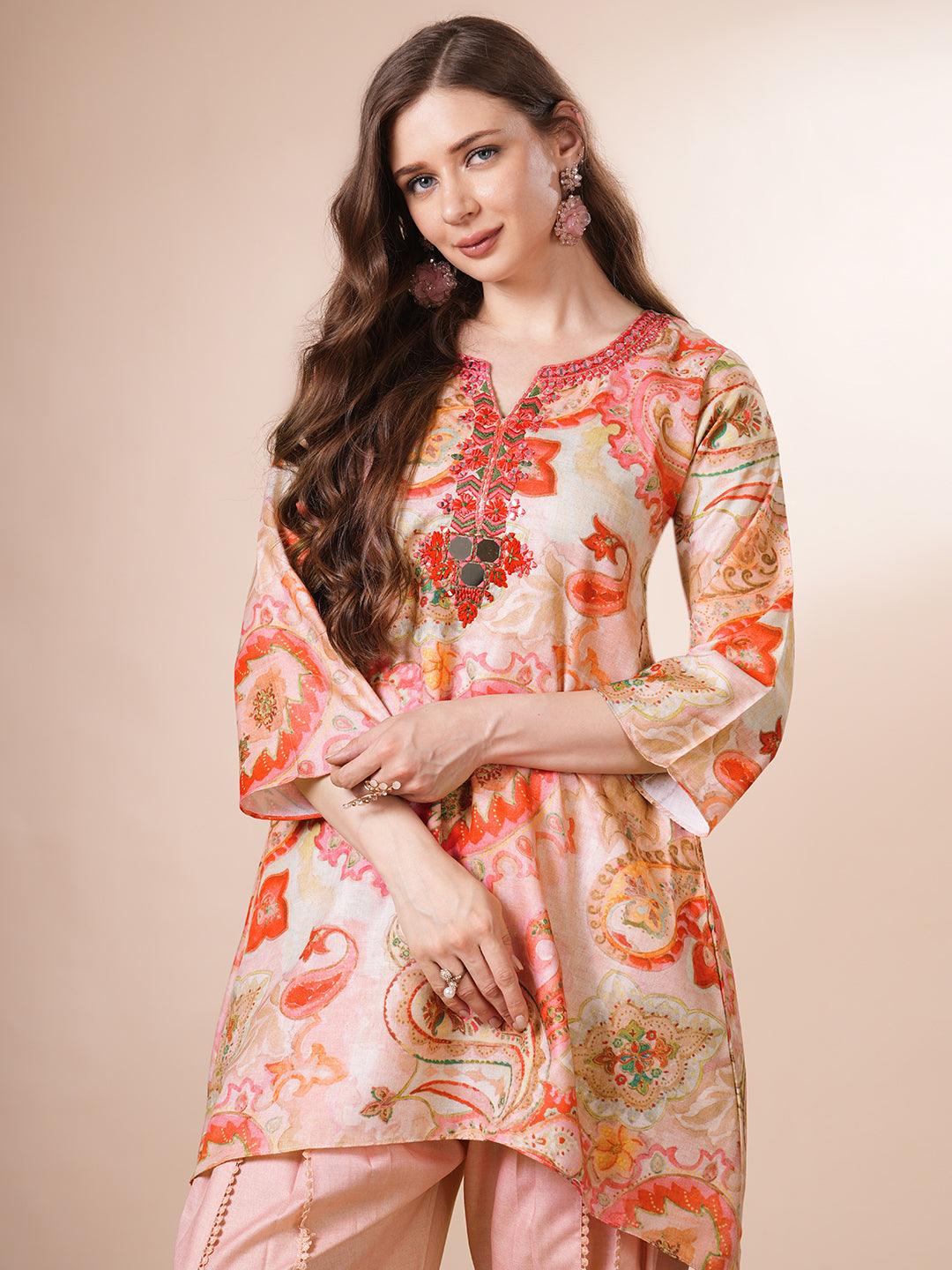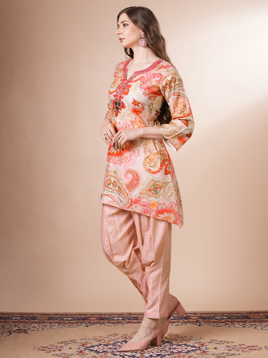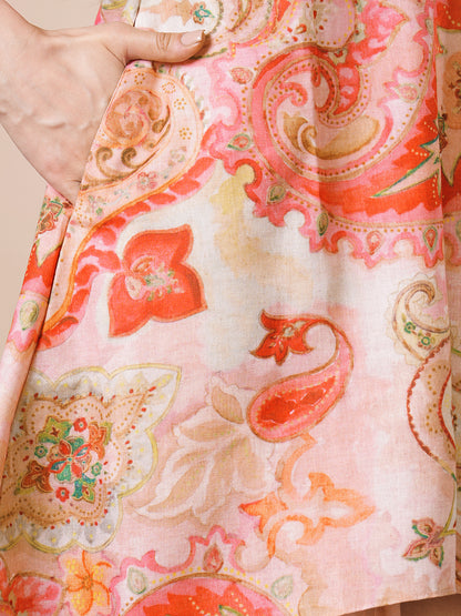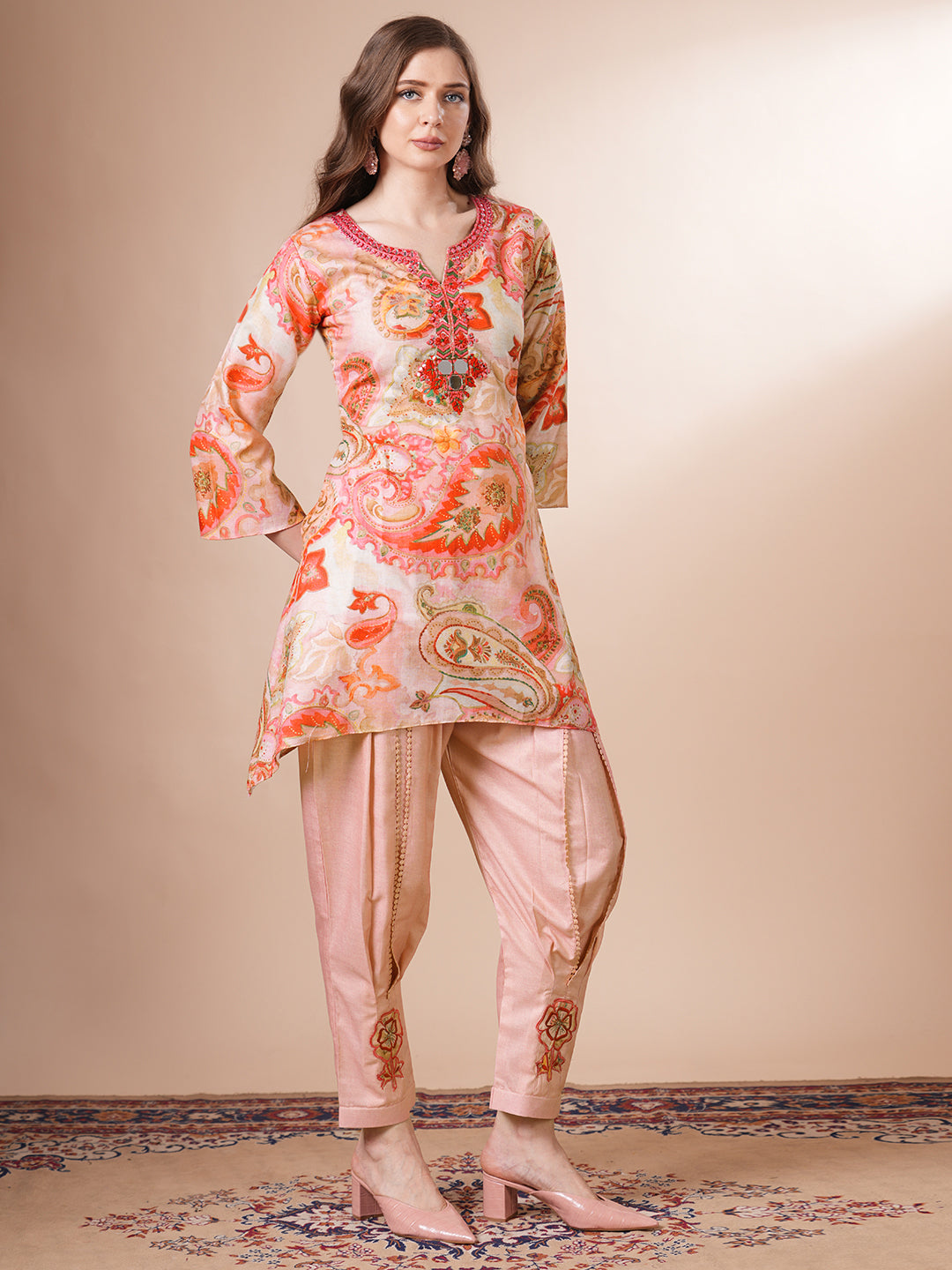 Paisley Printed Embroidered A-Line Kurta with Pant - Peach