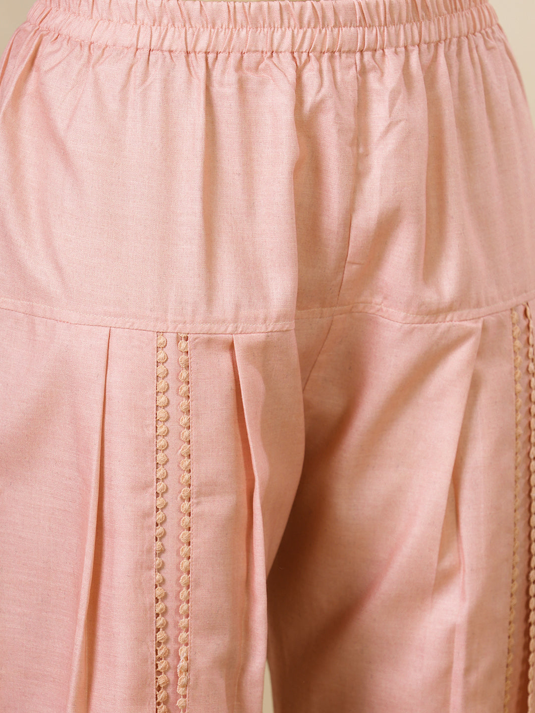 Elevate your ethnic charm with this peach Paisley Printed Embroidered A-Line Kurta set. Featuring a graceful round neckline, the kurta is adorned with delicate crochet lace detailing, intricate mirror embroidery, and elegant threadwork on the yoke. Paired with pleated pants for a refined silhouette, this ensemble blends timeless tradition with modern flair—perfect for festive occasions or elegant daywear