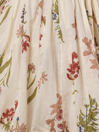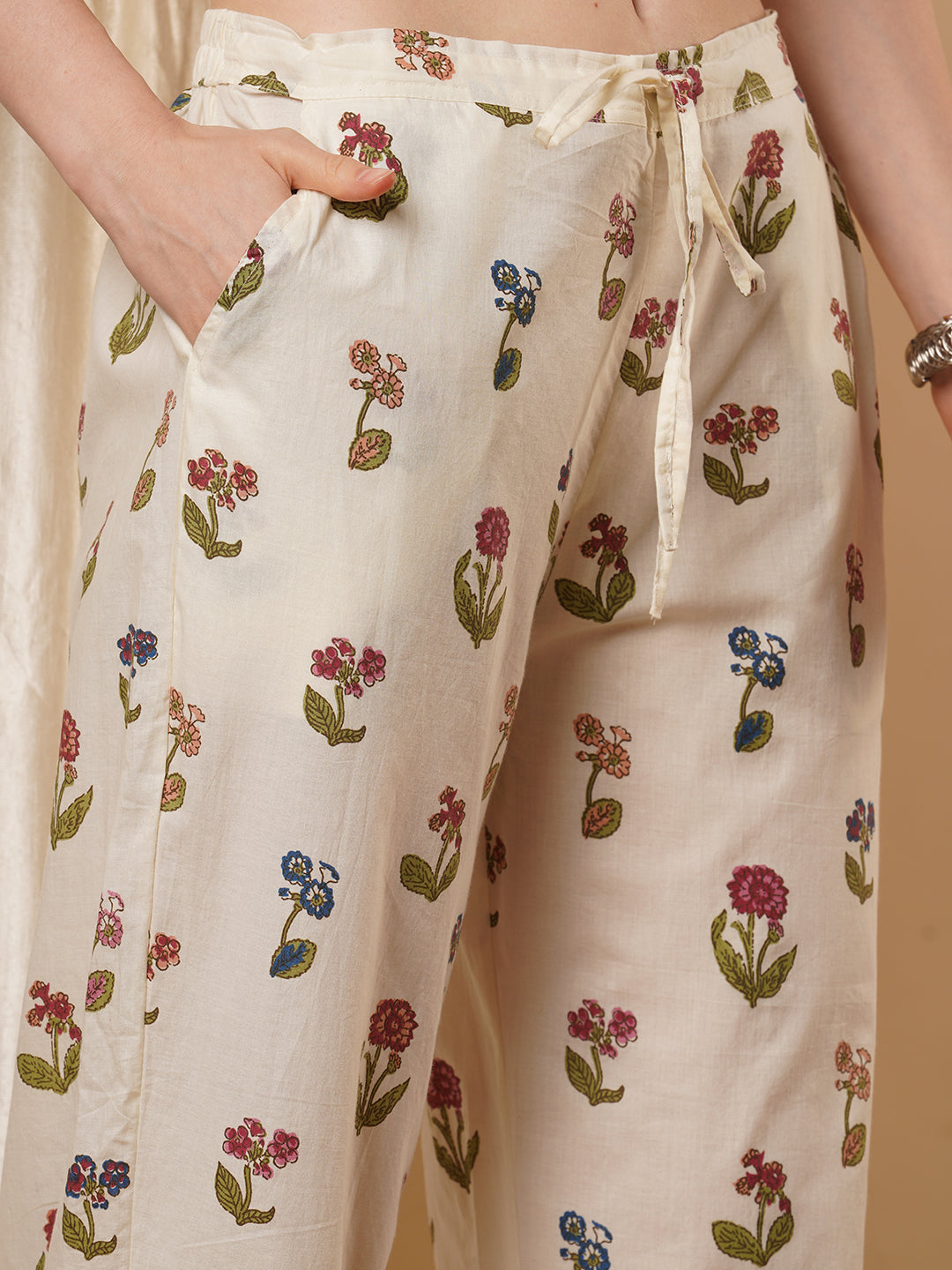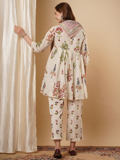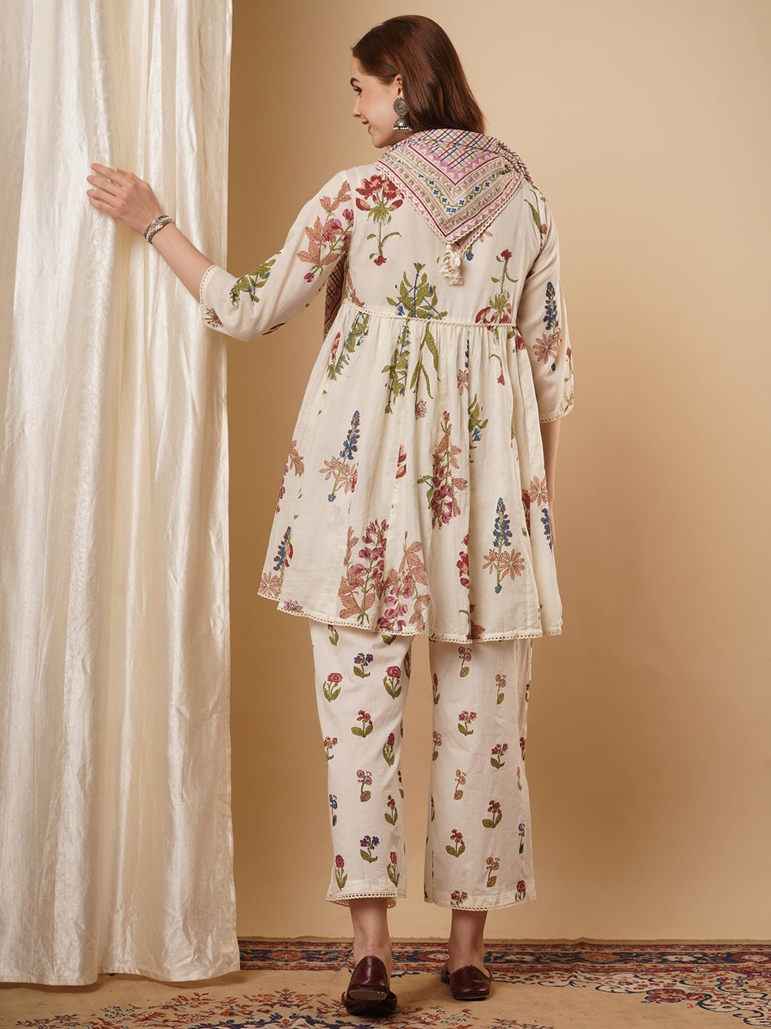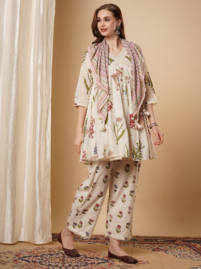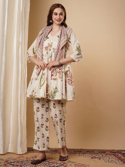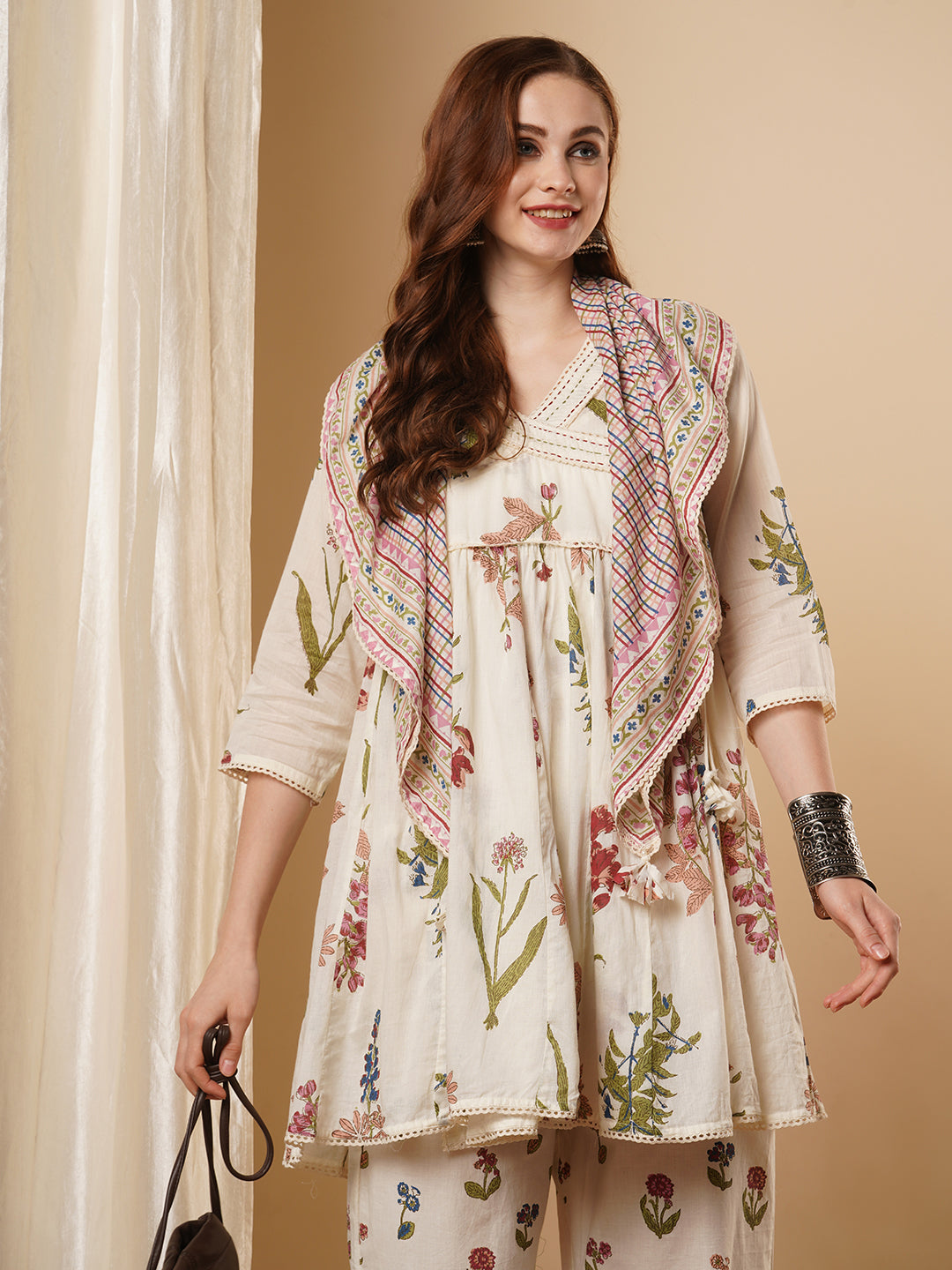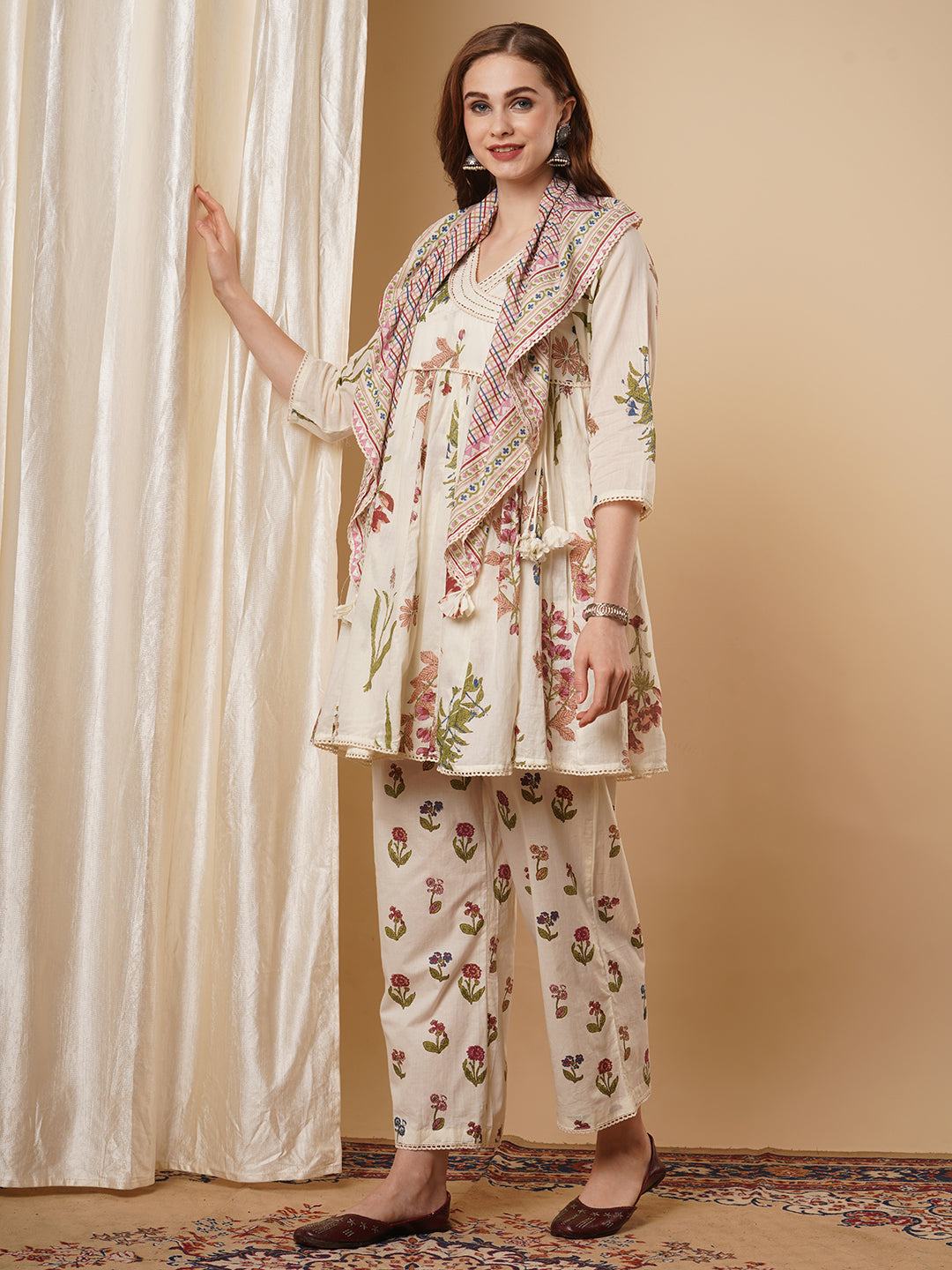 Quirky Floral Printed A-Line Pleated Kurta with Pant & Stole - Off White