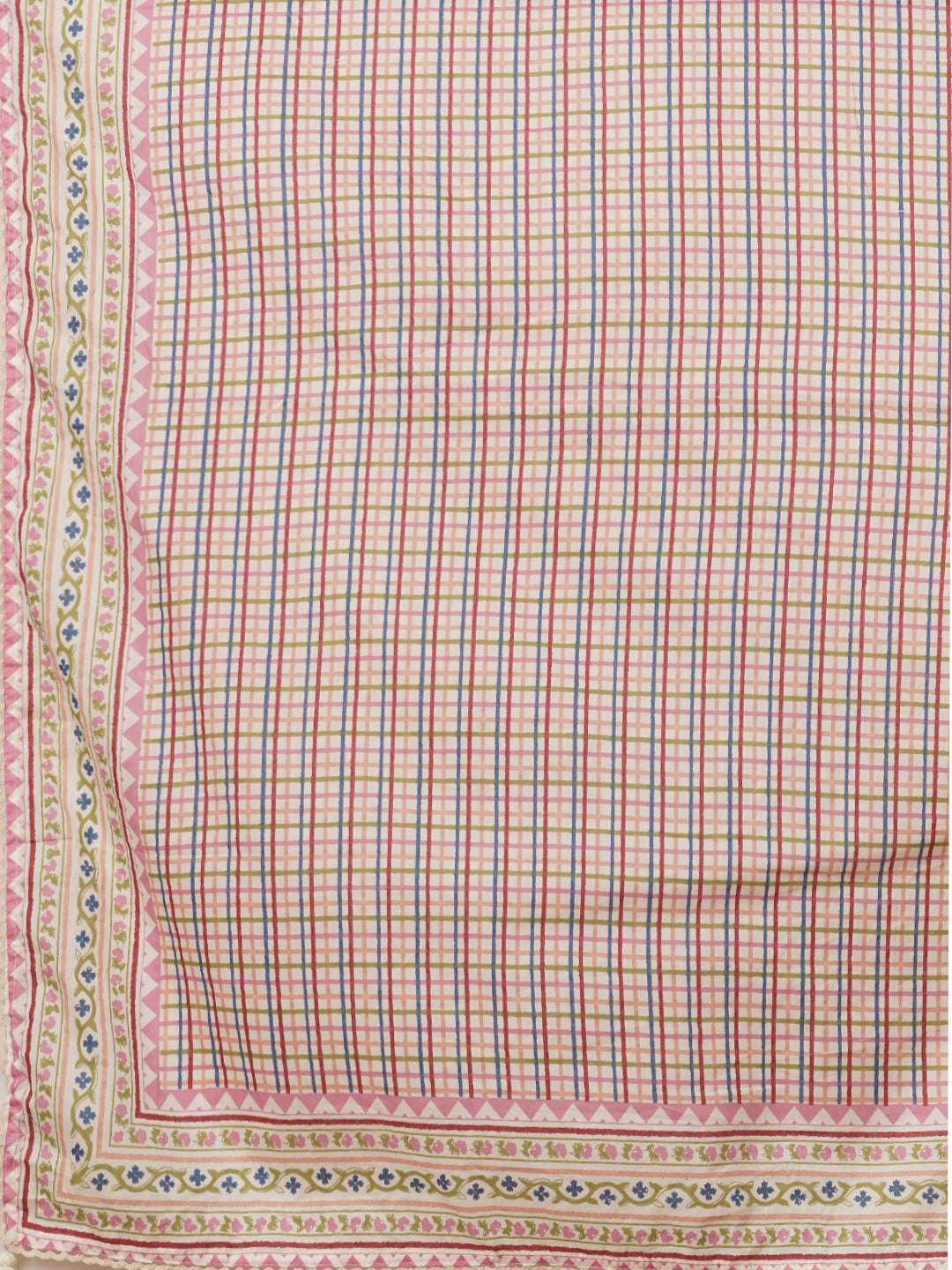 This off-white cotton blend kurta features an intricate mix of floral and ethnic prints with playful sequins and threadwork for a refined, yet quirky look. The A-line, pleated design creates a flattering silhouette, while the V-neckline and three-quarter sleeves add a timeless, chic touch. Paired with a matching pant, the partially elasticated waistband ensures comfort throughout the day. The off-white pure cotton Stole with lace detailing completes the set, making it perfect for both office wear and casual outings.