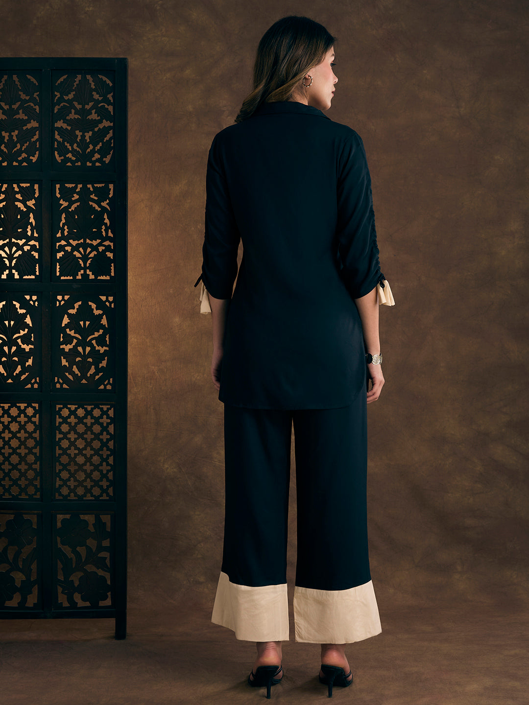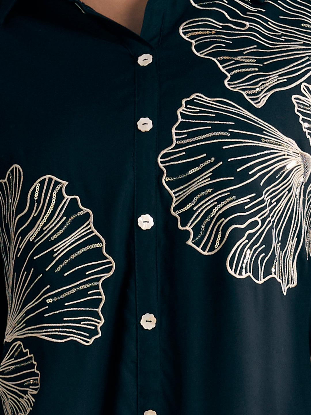 Crafted from soft viscose rayon, the set features a shirt collar top adorned with abstract floral embroidery, elevated by delicate threadwork and subtle sequin highlights for a luxe shimmer. Paired with straight-fit bottoms for a sleek finish, it’s the perfect blend of comfort and couture. Ideal for festive evenings, celebrations, and power-style dressing with a glamorous twist