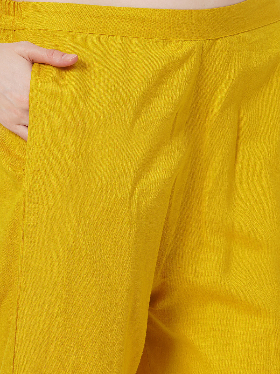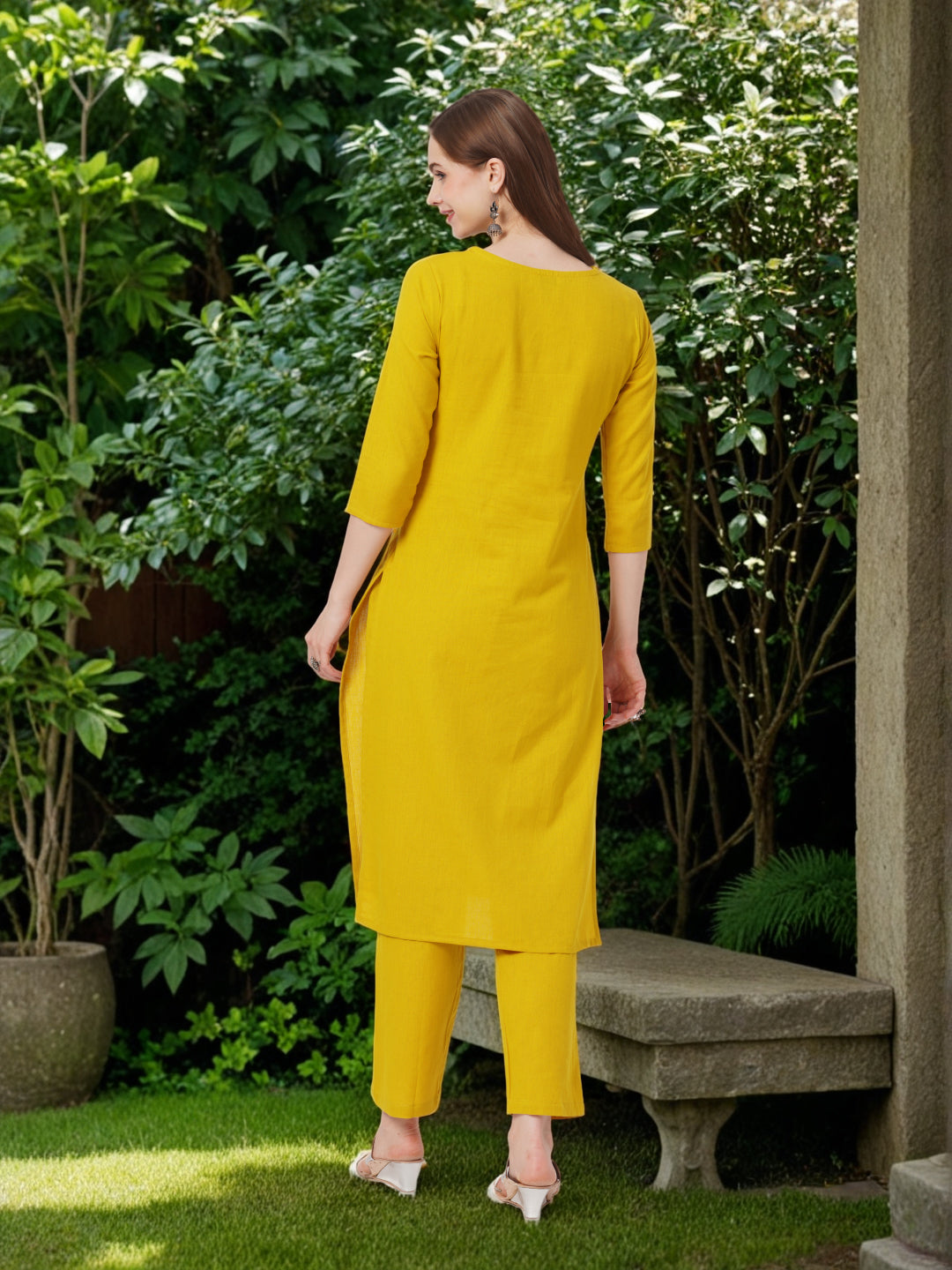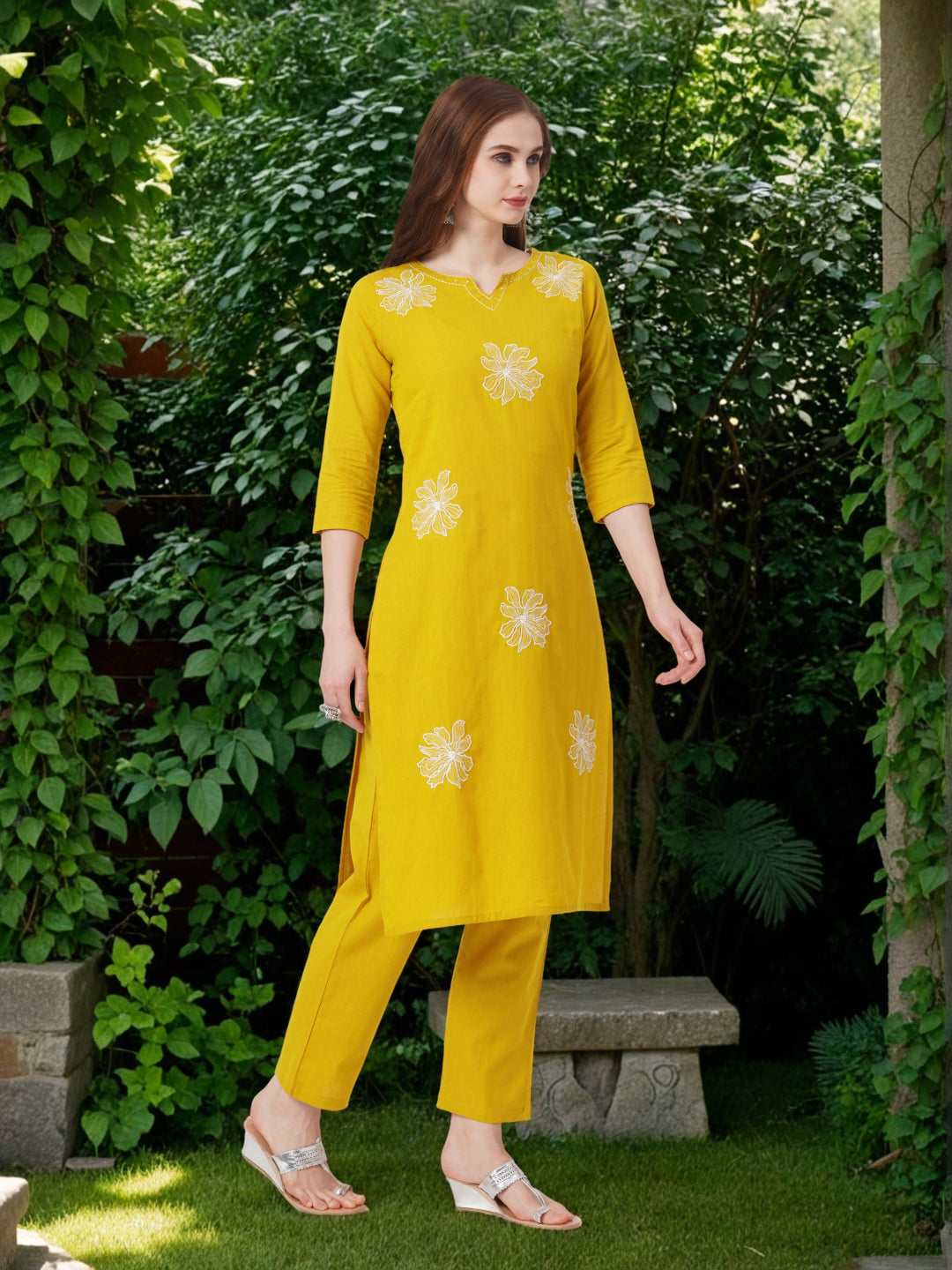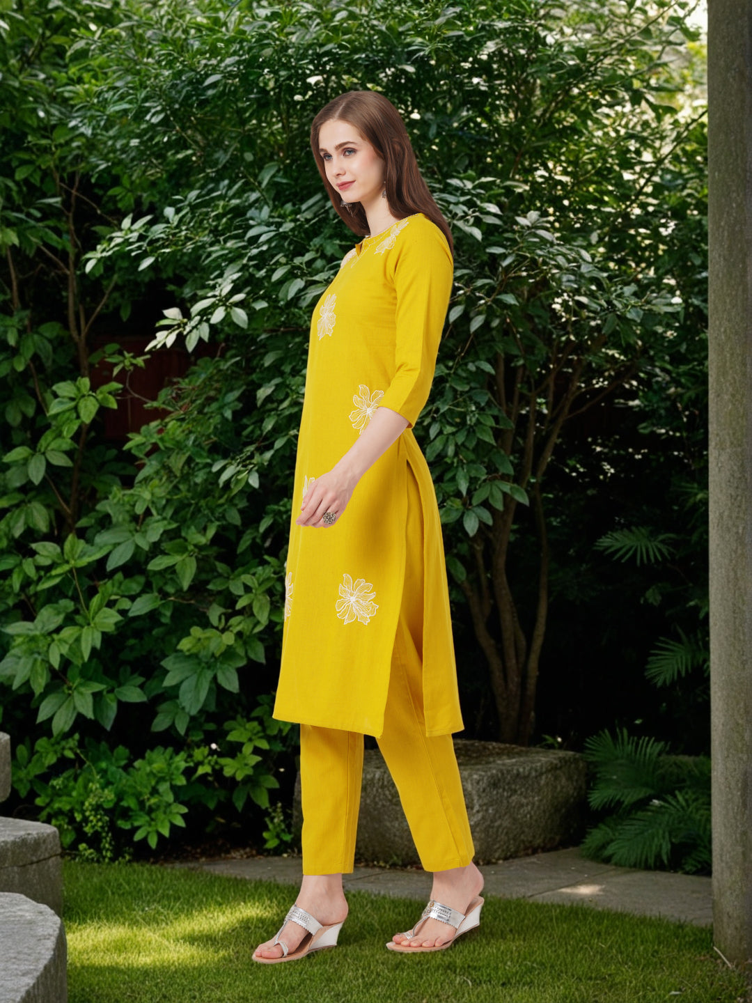 Add a touch of refined charm to your wardrobe with this Yellow Solid Abstract Floral Embroidered Co-ord Set, crafted from breathable and textured cotton flax fabric. The straight-fit silhouette lends a sleek, modern appeal, while the round neckline is adorned with intricate threadwork and delicate abstract floral embroidery that brings a handcrafted elegance to the look. Designed for both comfort and style, the set includes coordinated bottoms that ensure a polished, put-together feel. Perfect for casual outings, office wear, or daytime events, this co-ord set effortlessly blends simplicity with sophistication. A versatile piece that makes understated style truly stand out.