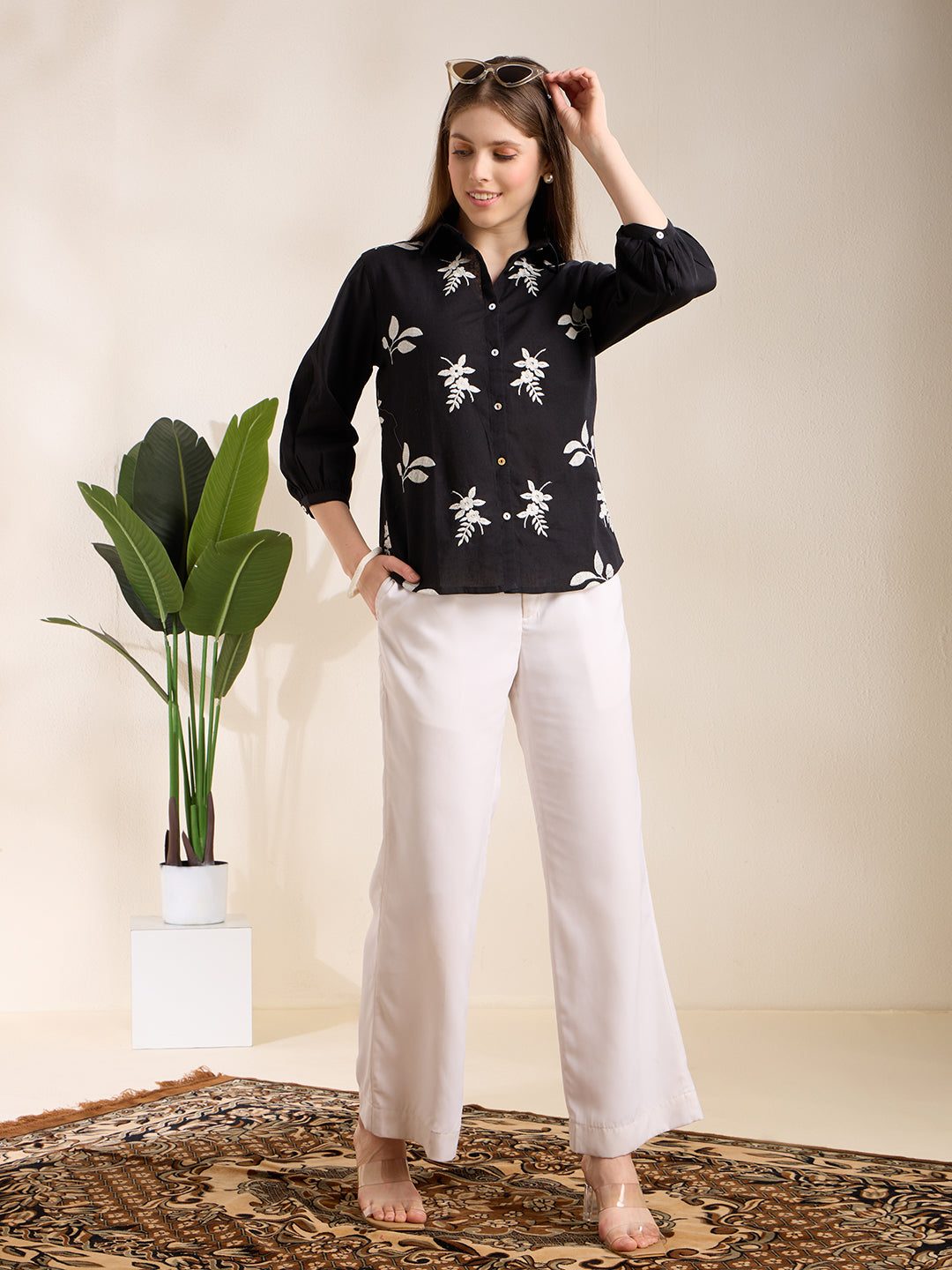 Step into effortless elegance with this Black Solid Abstract Floral Straight-Fit Shirt, crafted from breathable cotton flax fabric. Designed with a smart shirt collar and detailed thread work on the front, it blends subtle artistry with everyday style. Finished with chic puff sleeves, this piece adds a refined yet contemporary touch to your wardrobe—perfect for work, brunch, or a polished casual look.