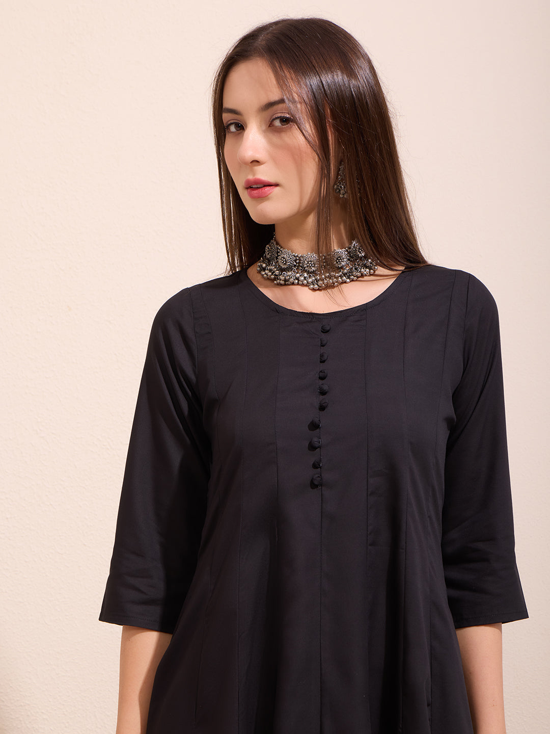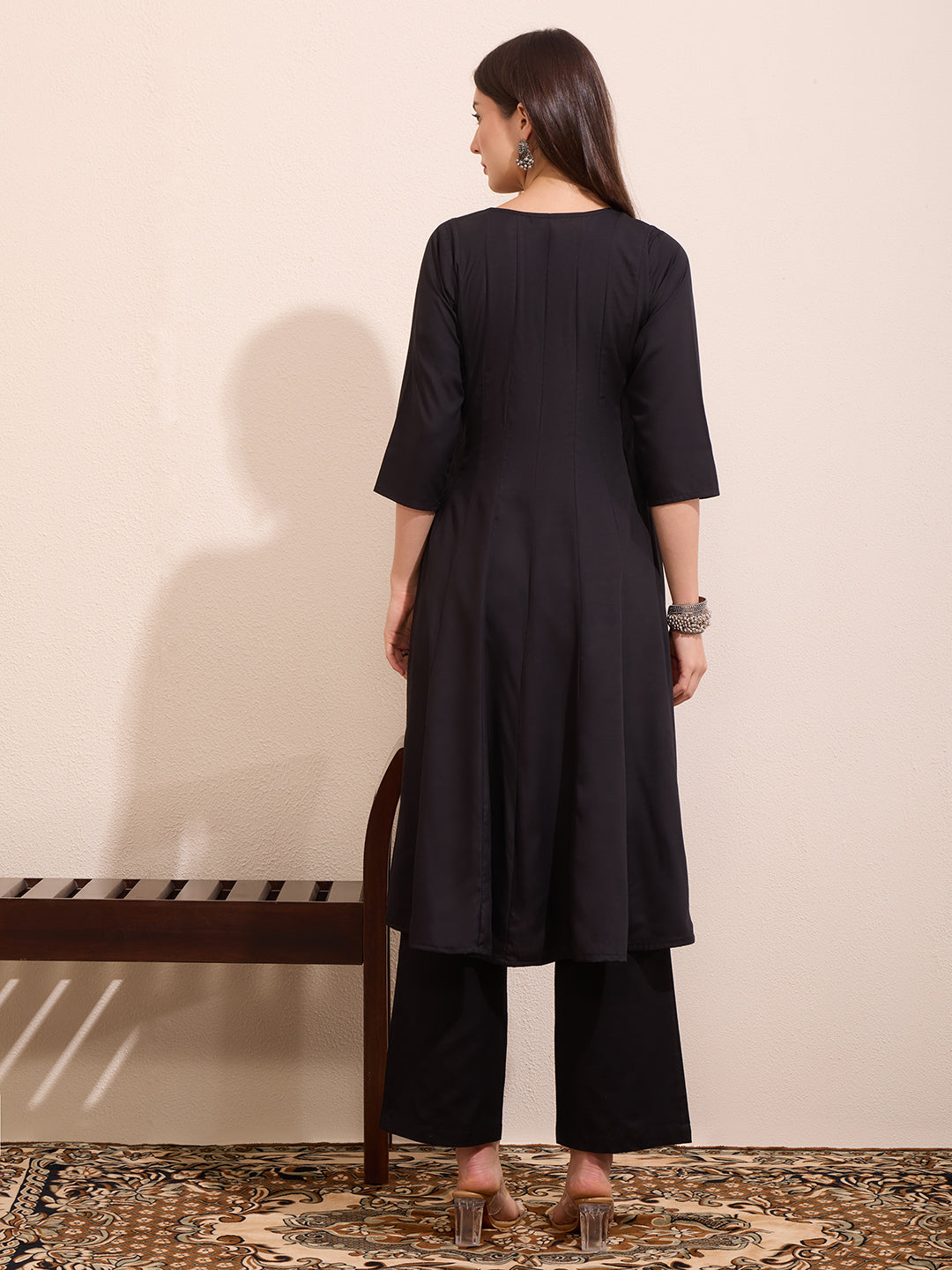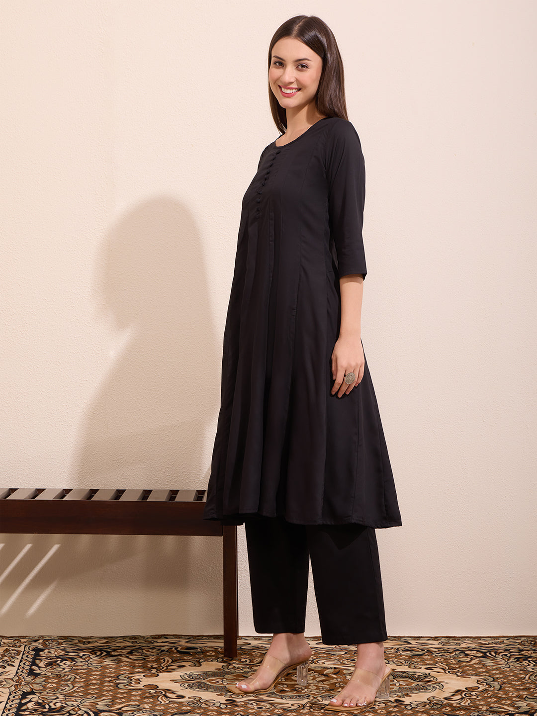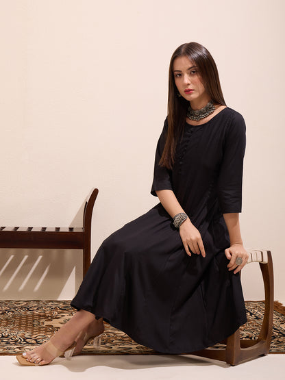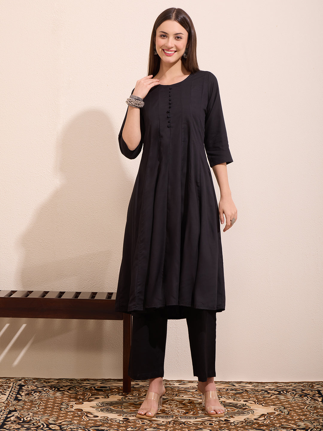 Elevate your ethnic style with this elegant Solid Black Anarkali Flared Kurta, crafted from soft viscose rayon for a luxurious drape and all-day comfort. Featuring a classic round neckline and a beautifully flared silhouette, this timeless piece blends grace with modern minimalism — perfect for festive occasions or evening outings.