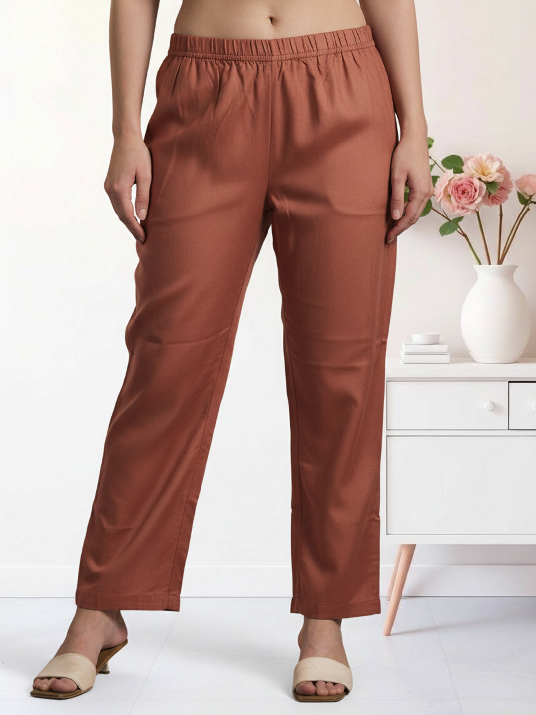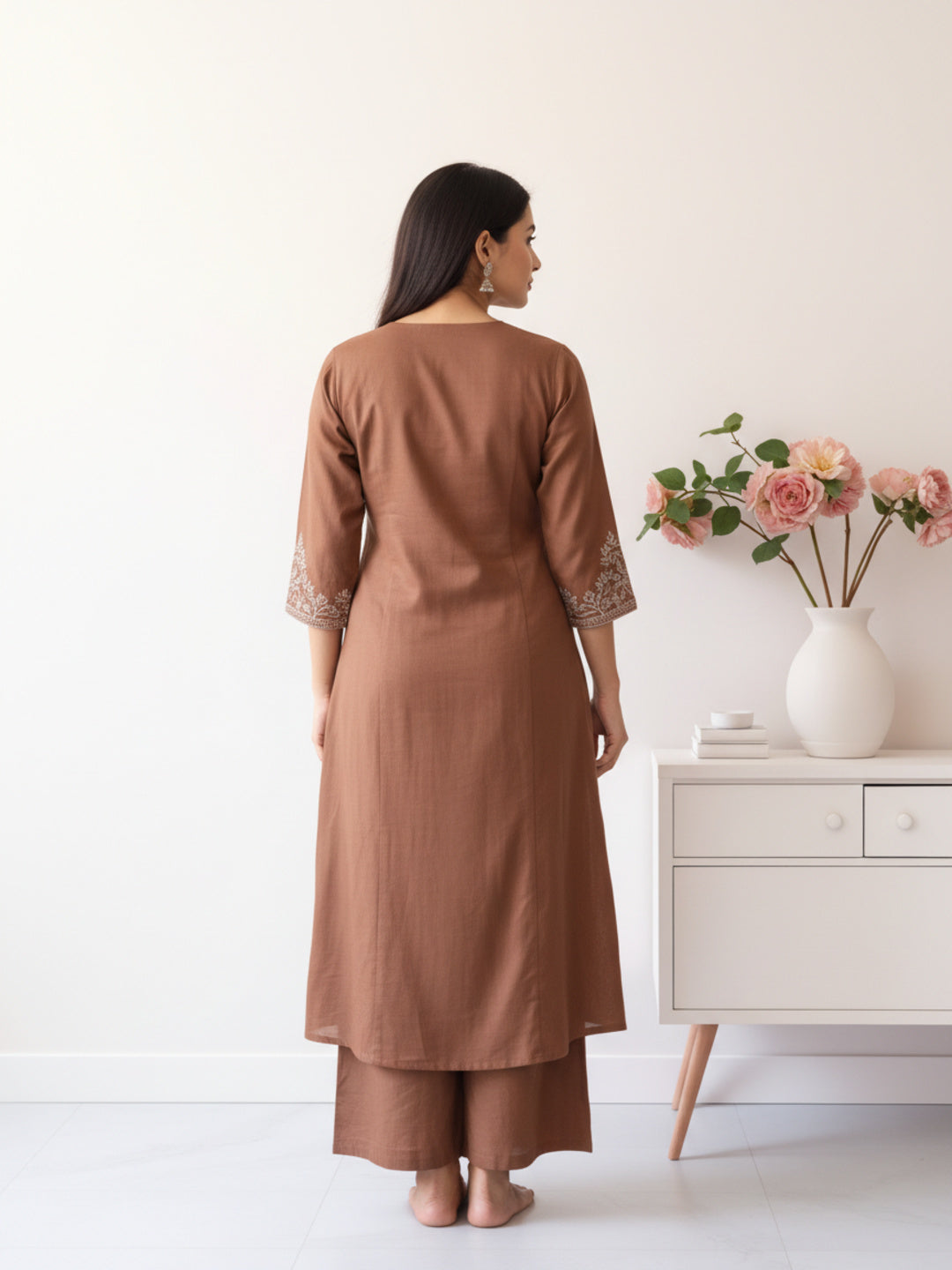 An elegant and sophisticated occasion-wear set featuring a mauve solid paneled A-line modal kurta with a round neckline, highlighted by antique silver zari embroidery on the yoke and cuffs, soft gathers at the waistline, paired with coordinated solid trousers for a graceful and timeless look.