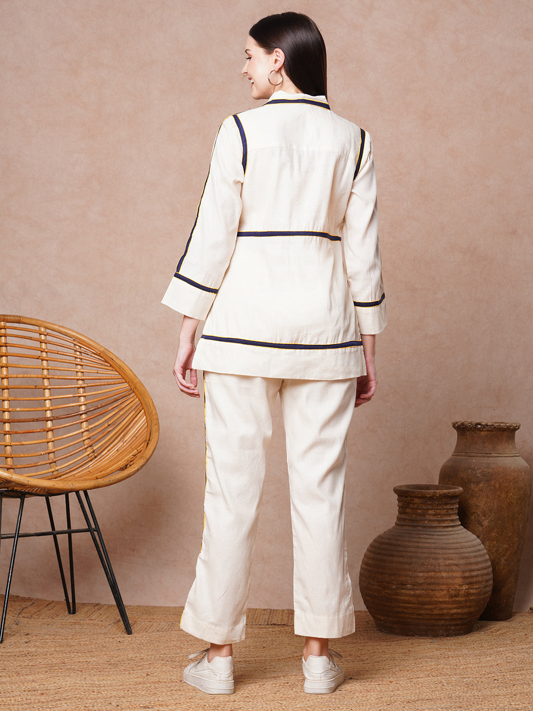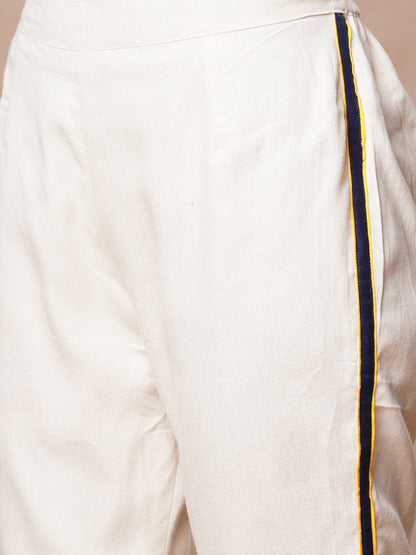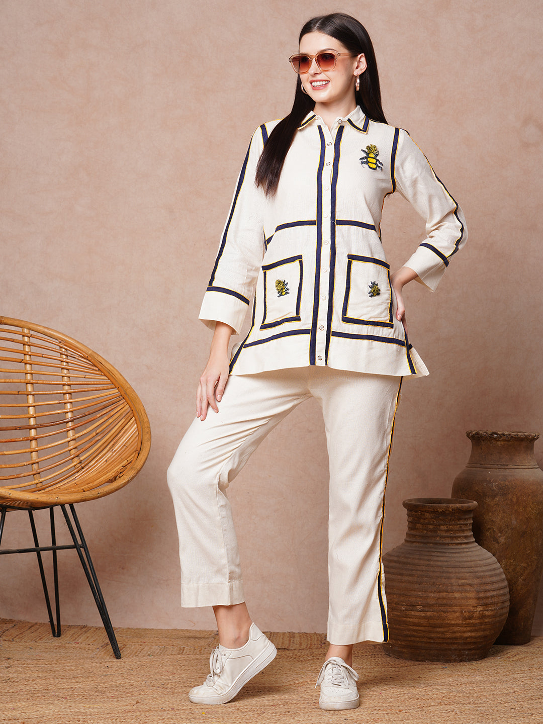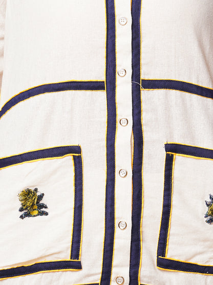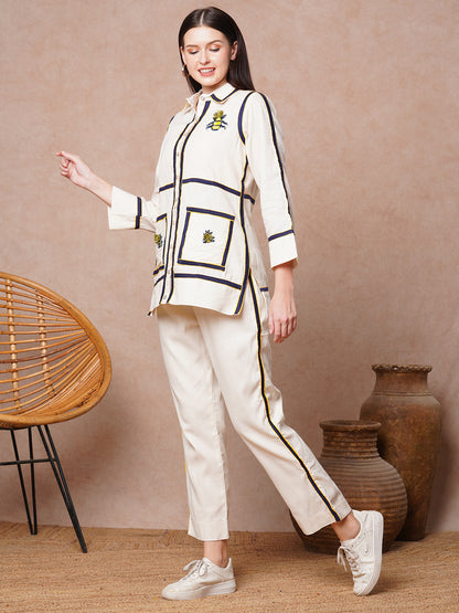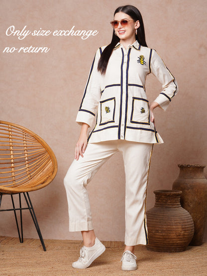 Solid Checks Patchwork Embroidered Straight Fit Co-ord Set - Off White