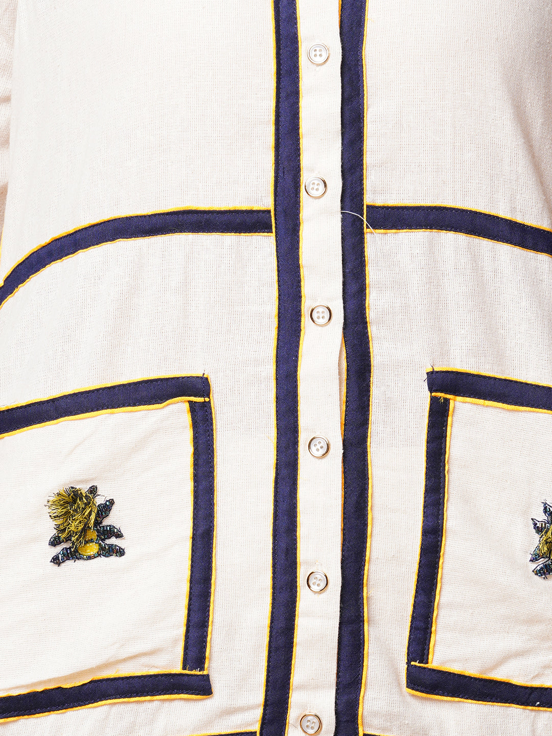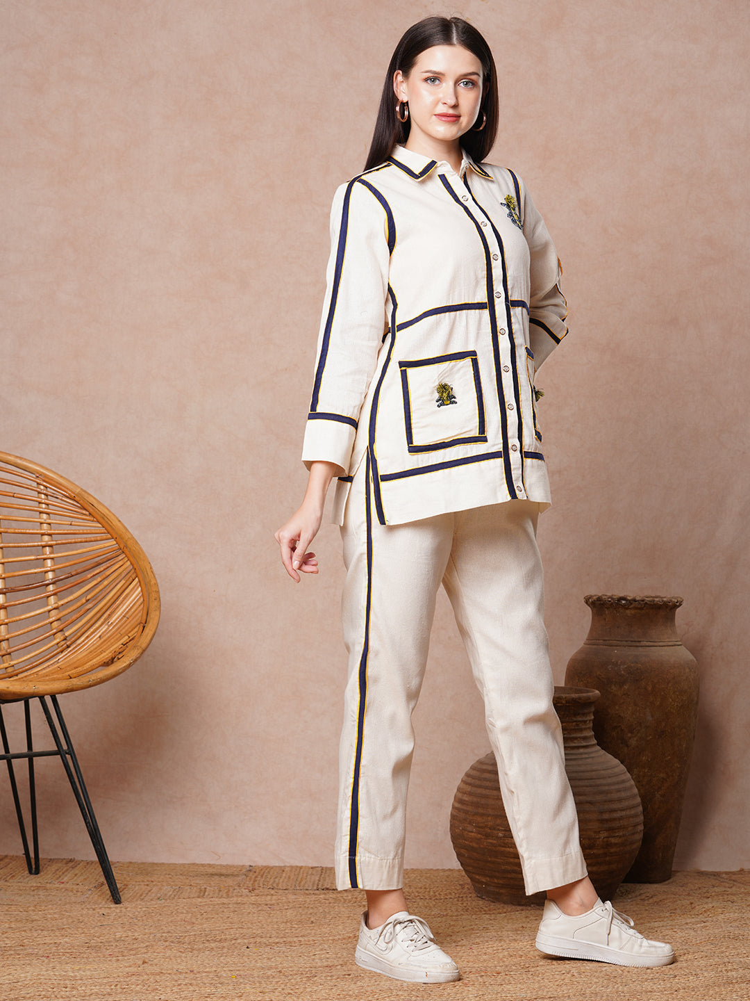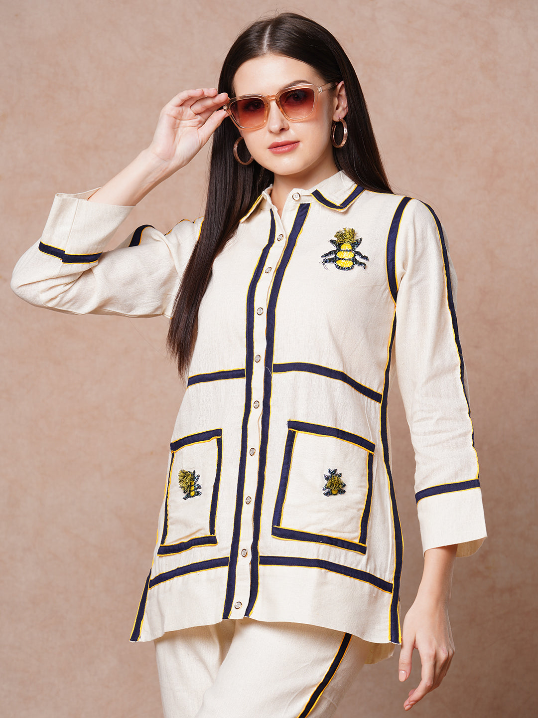 This straight fit shirt with checks patchwork and floral beadwork at front with shirt collar and paired with solid pant is an ideal fit to add a touch of sophistication to your wardrobe.