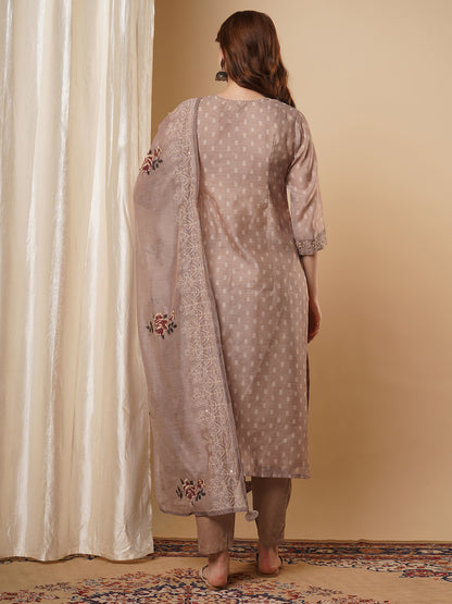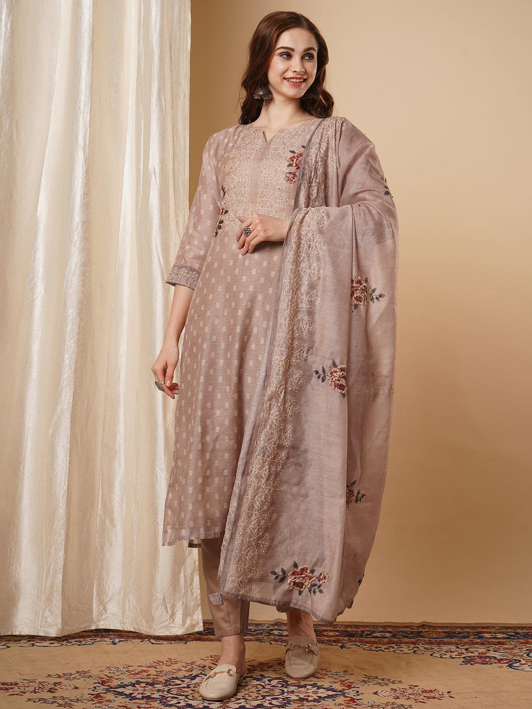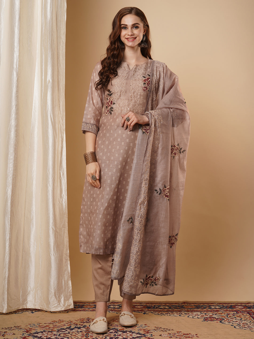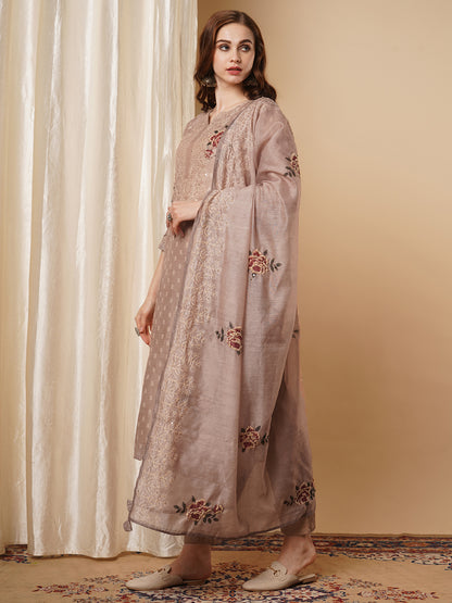 Grace meets whimsy in this Solid Rose Printed & Hand Embroidered Dobby Chanderi Kurta Set in elegant Camel Brown. Crafted from lightweight chanderi fabric, the kurta features delicate sequin and threadwork embroidery showcasing floral and graceful Rose Motifs. Paired with a solid pant and a matching floral-embroidered dupatta, this set brings together tradition and artistry with effortless sophistication.