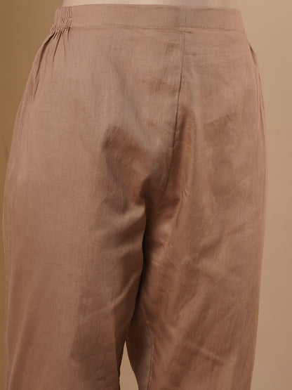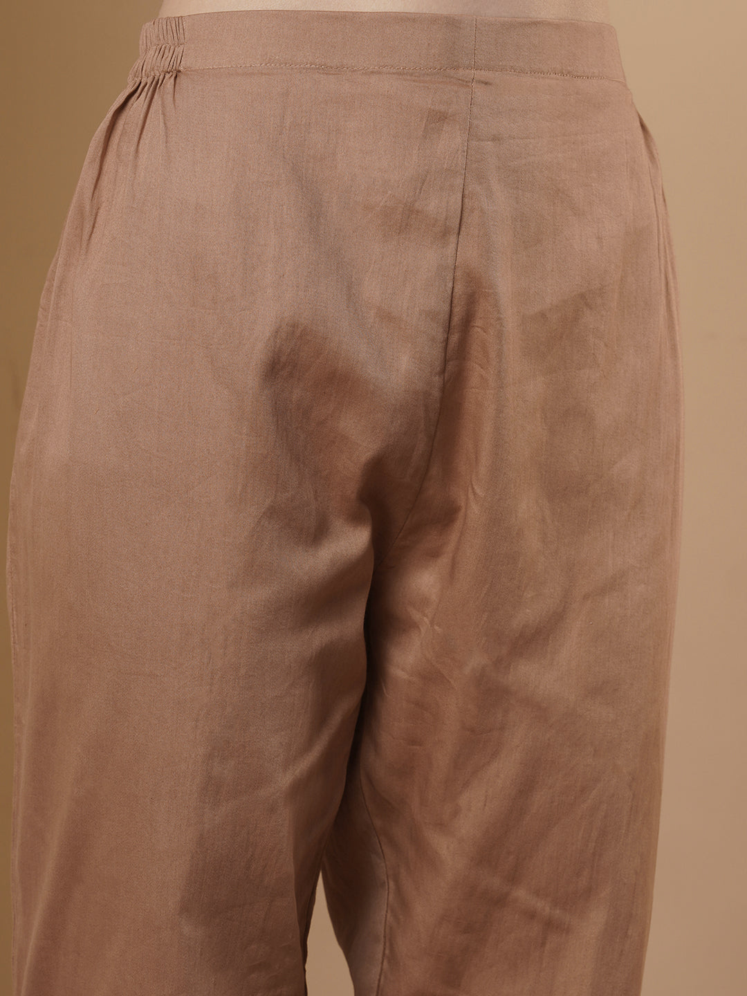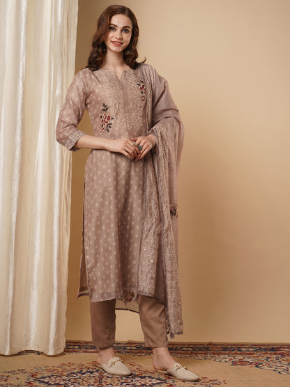 Solid Dobby Rose Printed & Hand Embroidered Straight Fit Kurta Set - Camel Brown