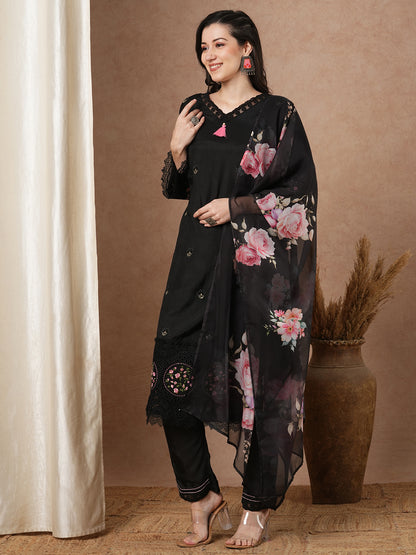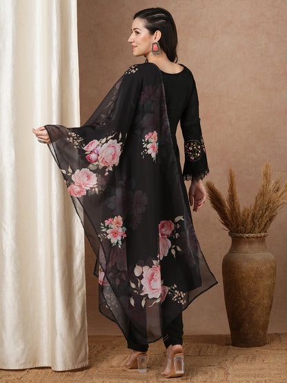 Solid Embroidered Straight Fit Kurta with Pant and Printed Dupatta - Black
