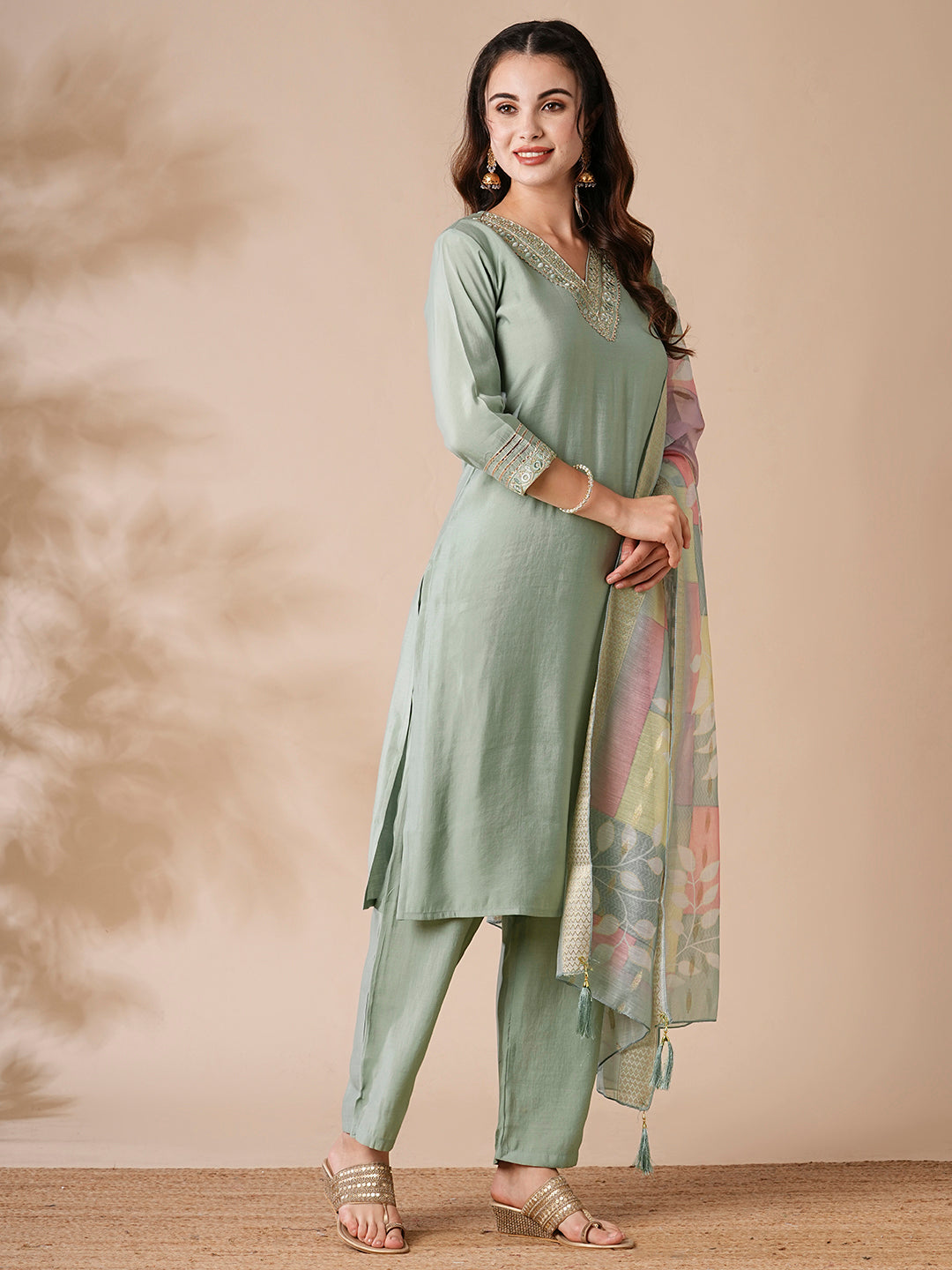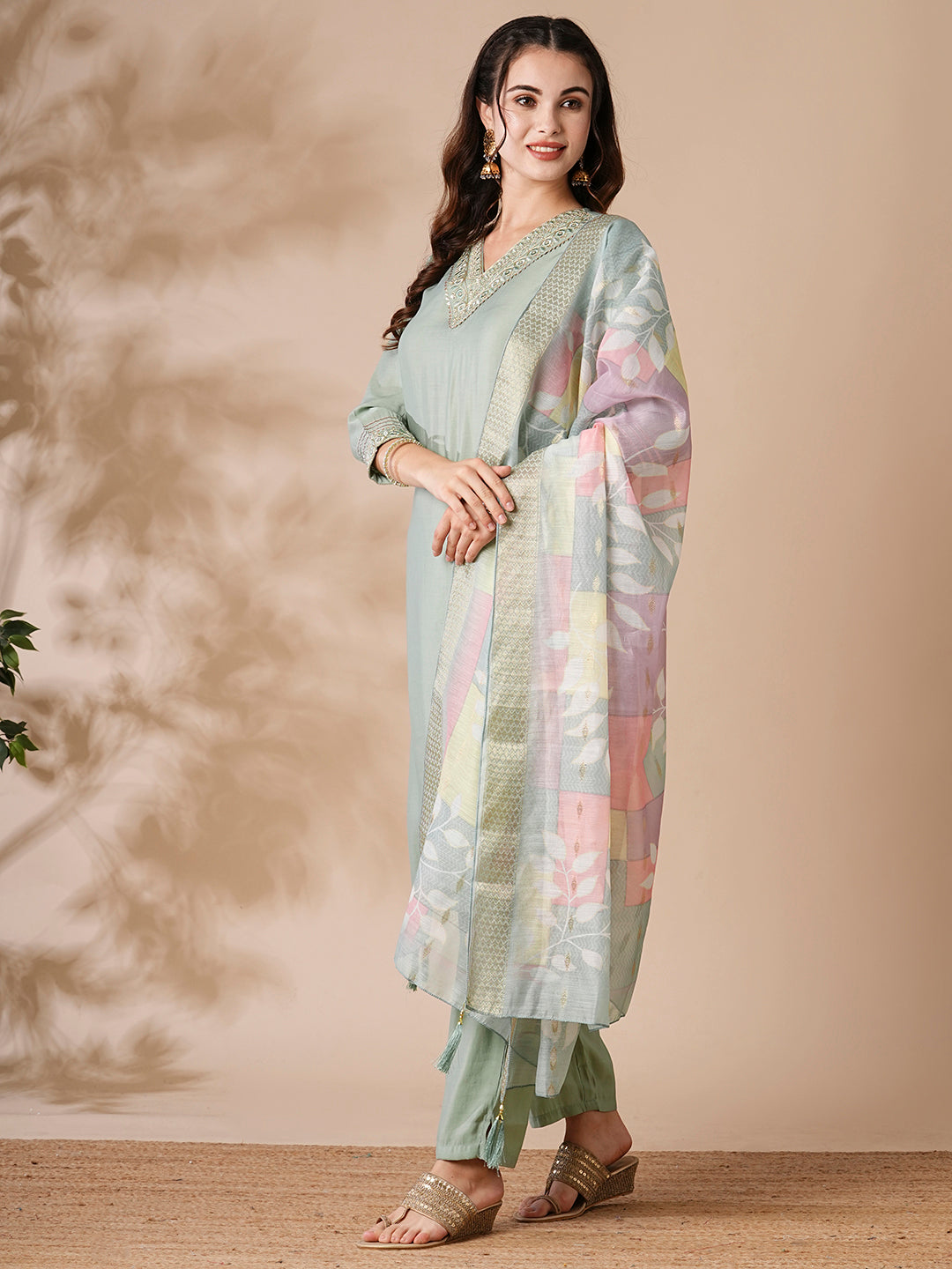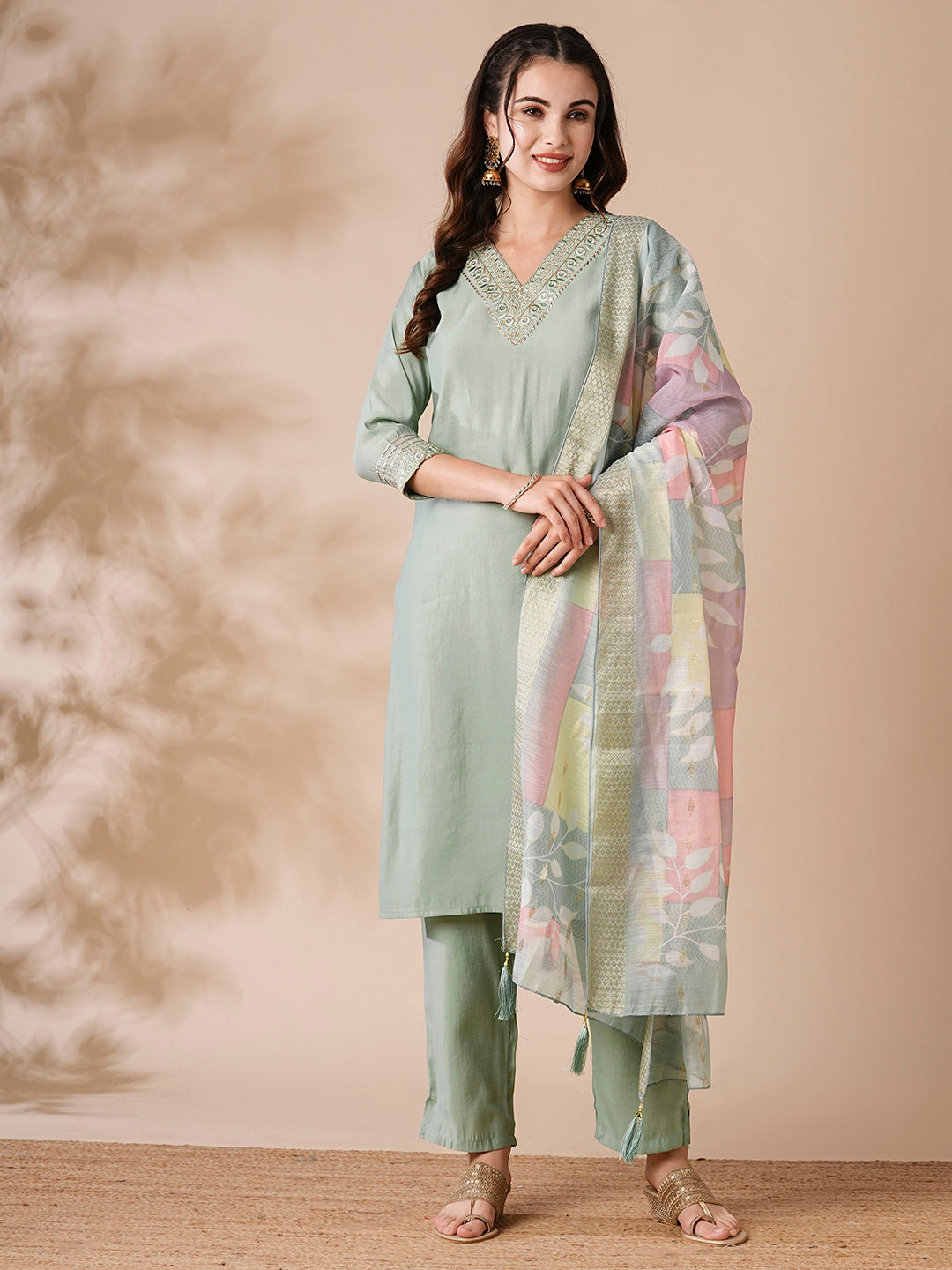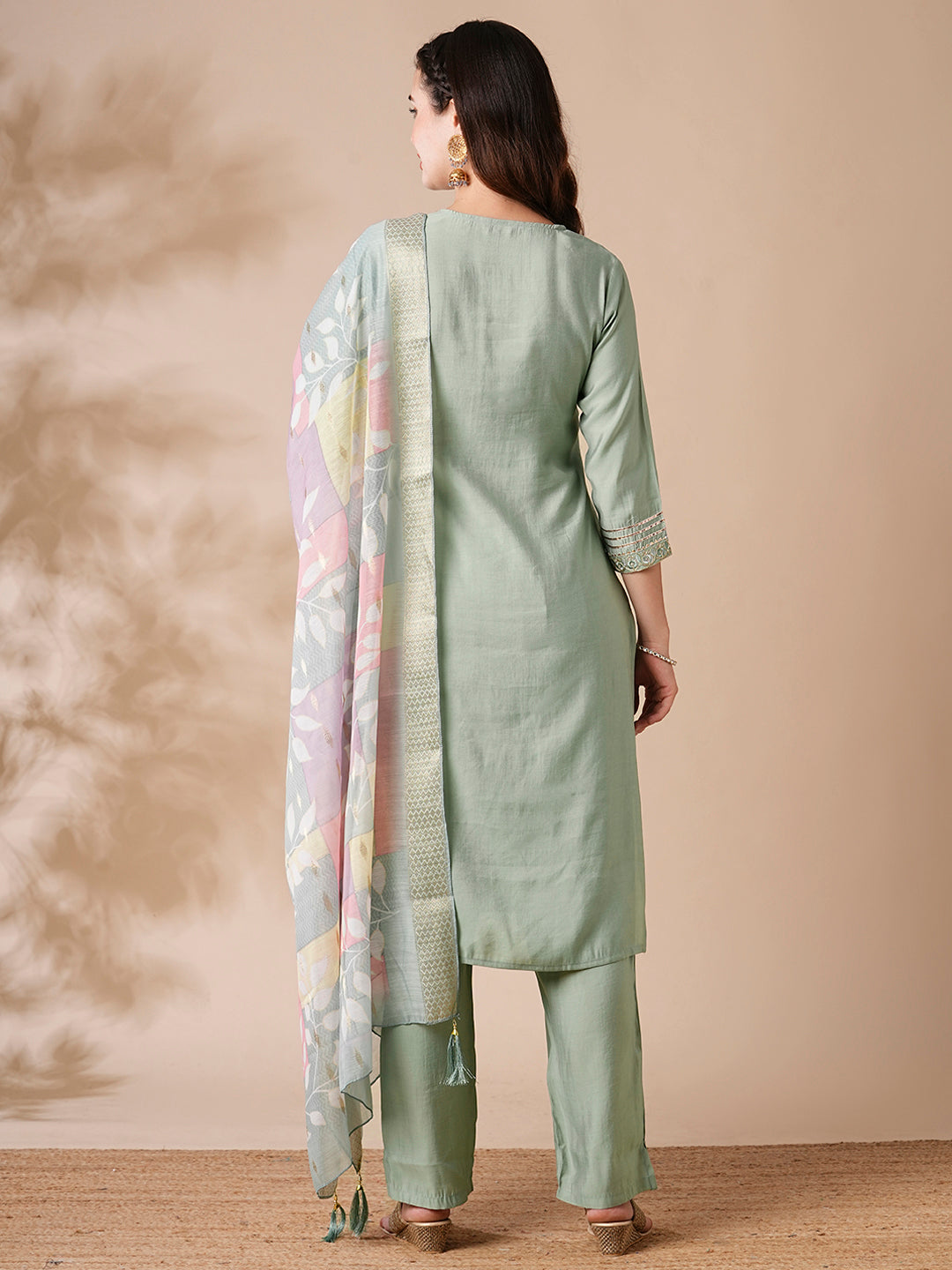Solid Embroidered Straight Kurta with Pant & Printed Woven Dupatta - Mint Green