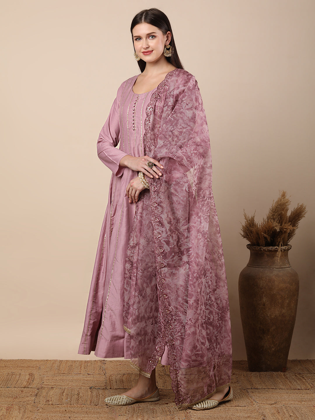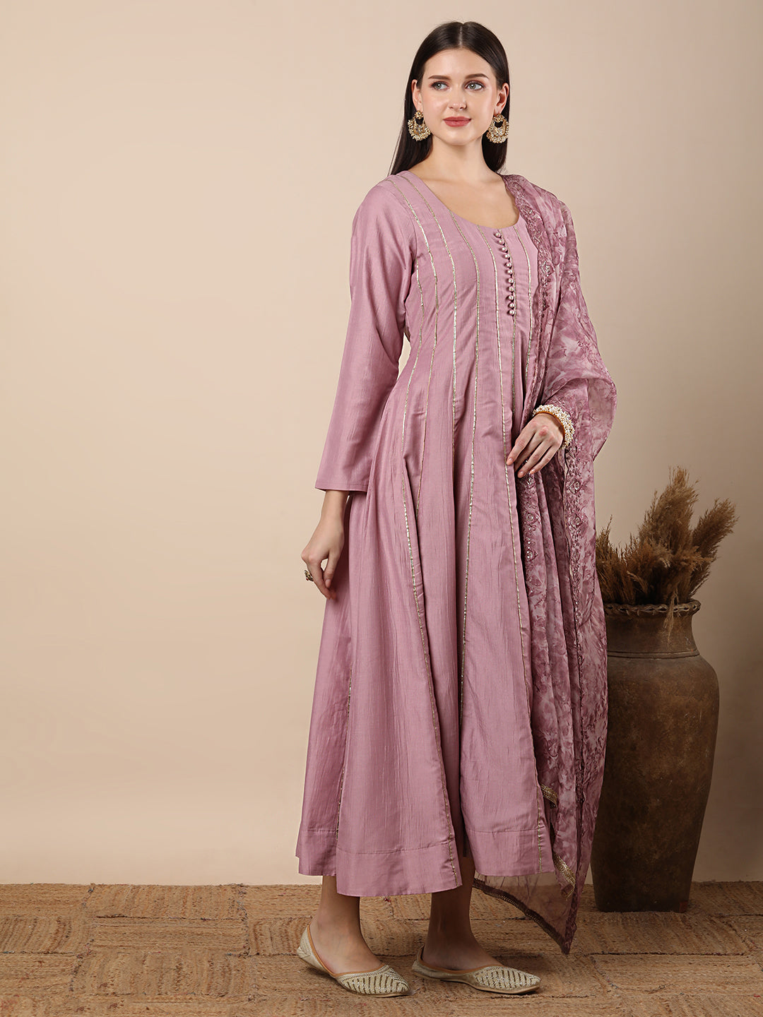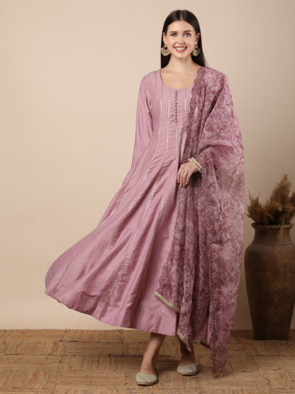 Solid Ethnic Anarkali Flared Maxi Dress with Printed & Embroidered Dupatta - Lavender