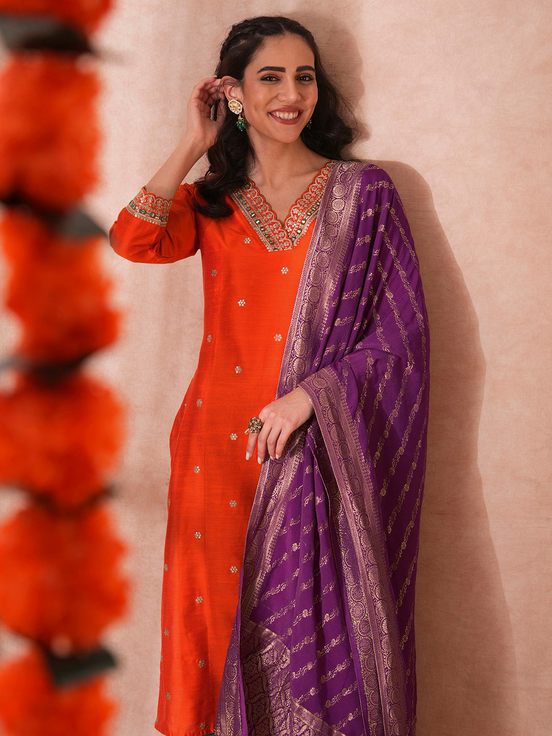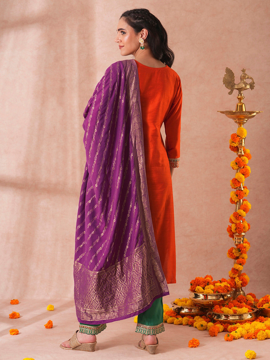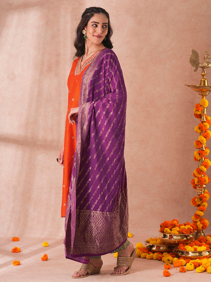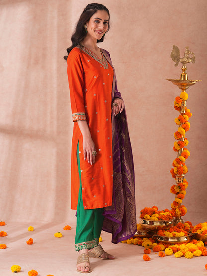 Solid Ethnic Embroidered Straight Kurta with Pant & Dupatta - Orange