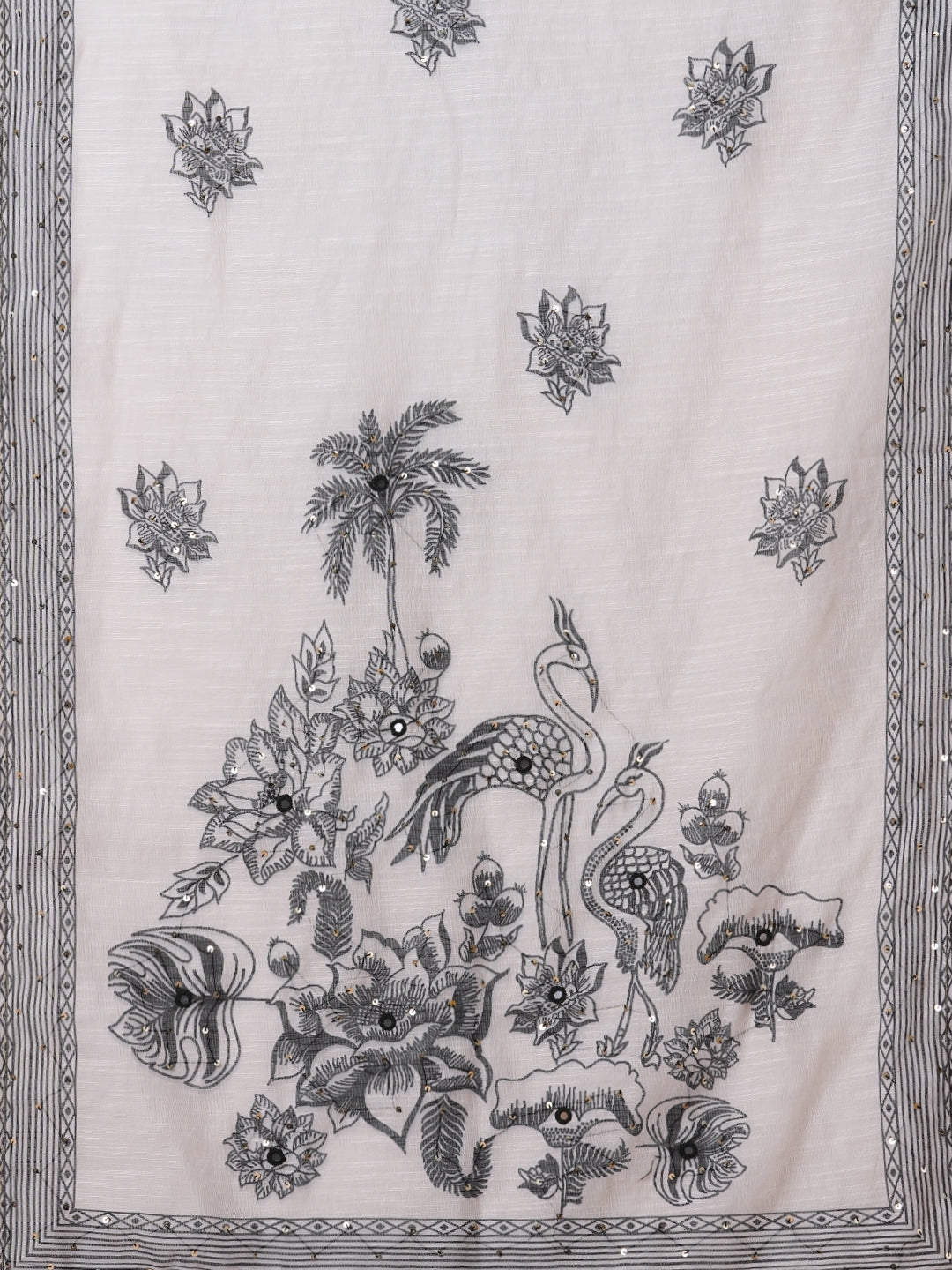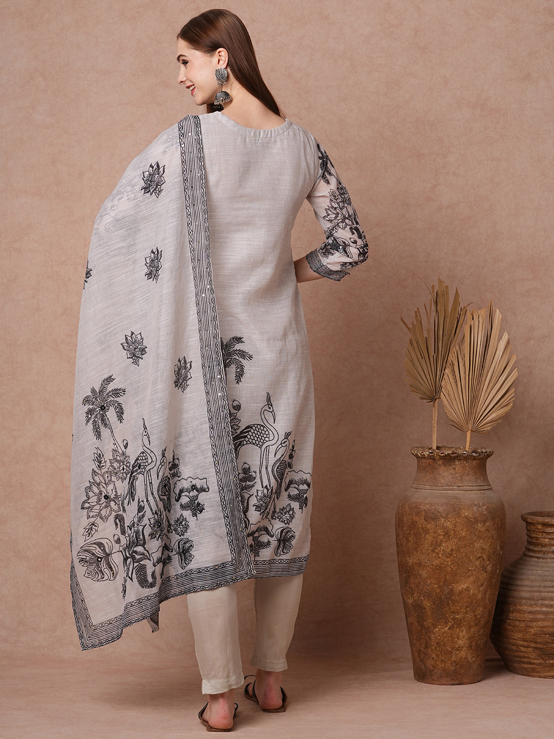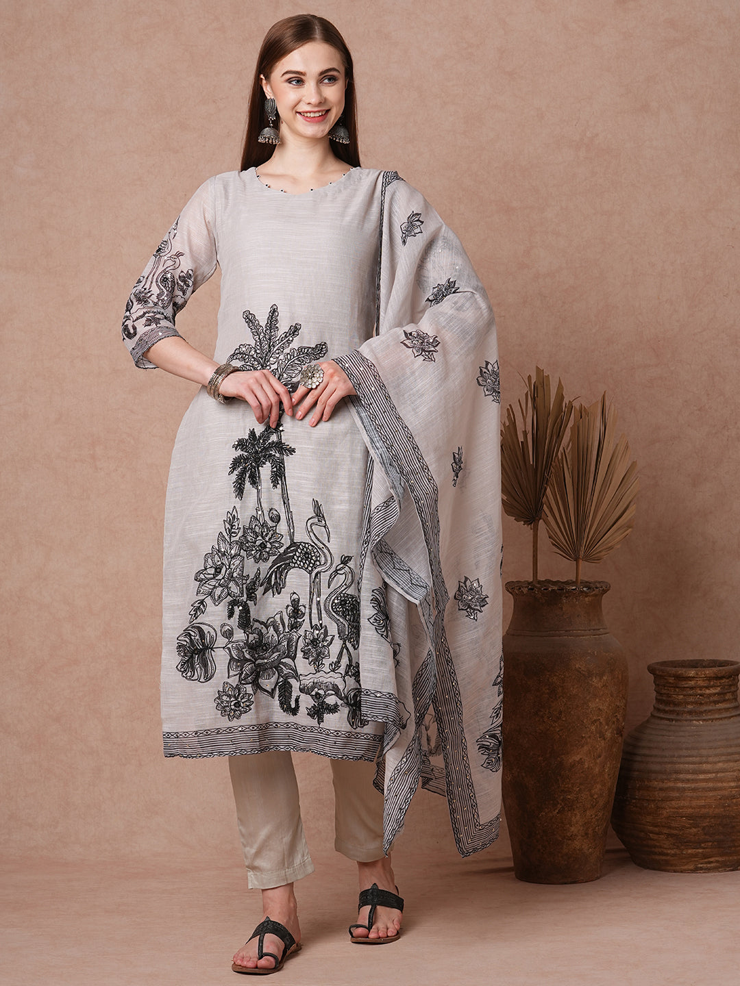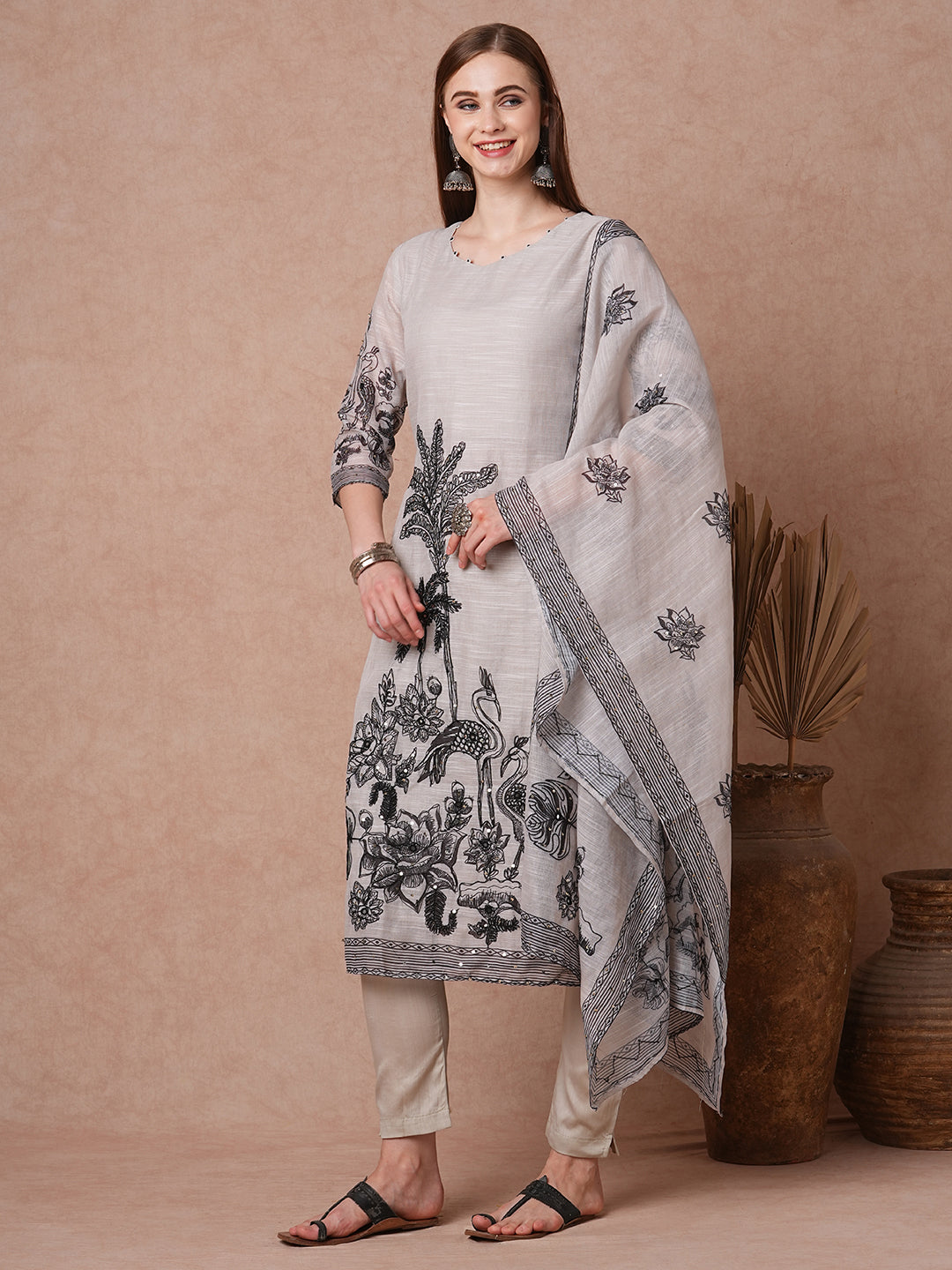 Grace meets whimsy in this Solid Ethnic Flamingo Printed & Hand Embroidered Kurta Set in elegant grey. Crafted from lightweight chanderi fabric, the kurta features delicate sequin and threadwork embroidery showcasing floral fauna and graceful flamingos. Paired with a solid pant and a matching floral-embroidered dupatta, this set brings together tradition and artistry with effortless sophistication.