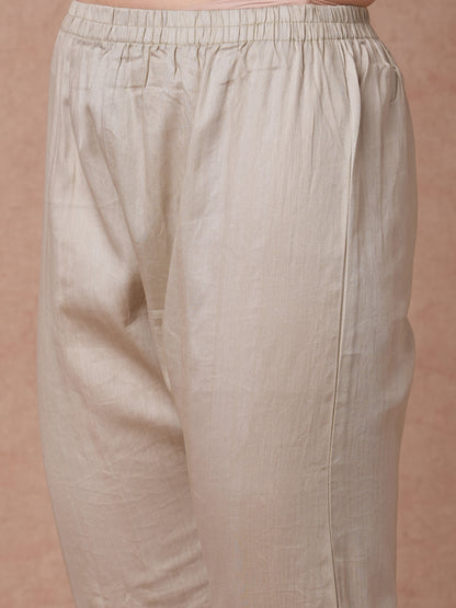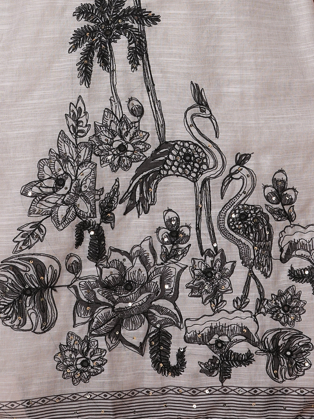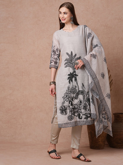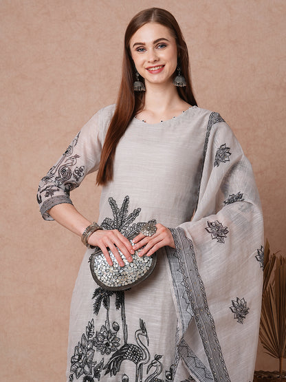 Solid Ethnic Flamingo Printed & Hand Embroidered Straight Fit Kurta Set - Grey