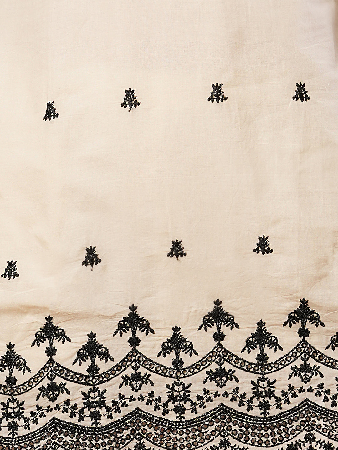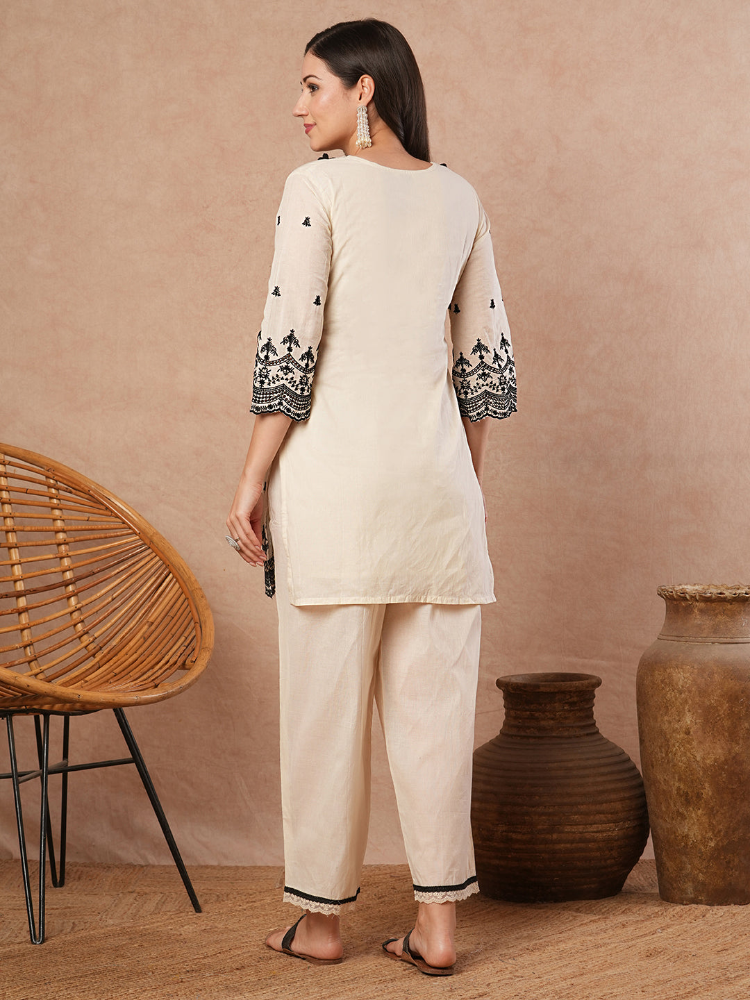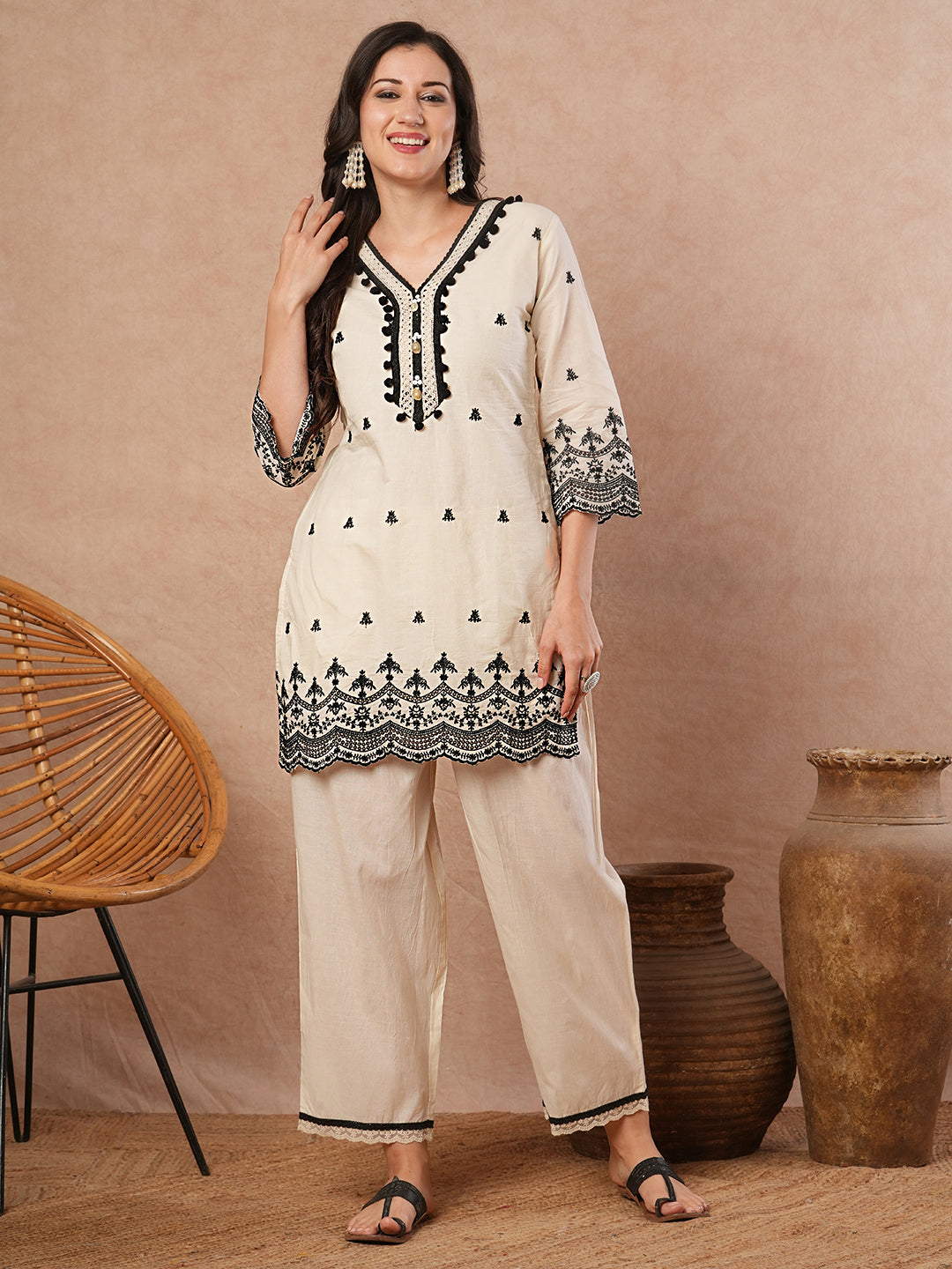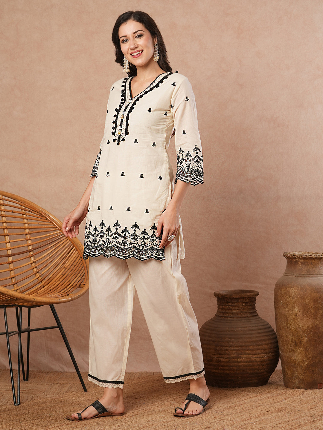 Step into subtle elegance with this Solid Ethnic Floral Embroidered Straight Cut Kurta with Pant in White. Made from soft cotton fabric, it promises breathable comfort and easy movement. The front features intricate black threadwork embroidery that stands out beautifully against the white base. A flattering V-neckline and delicate crochet lace detailing add refined charm. Paired with a solid matching pant, this ensemble blends timeless tradition with minimal modern styling. Perfect for daytime outings or elegant festive moments.
