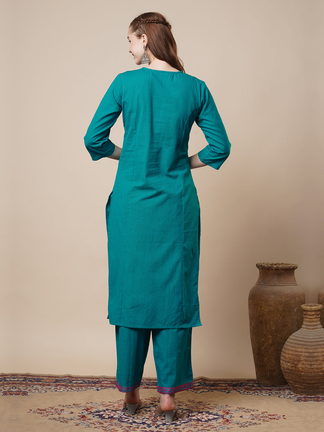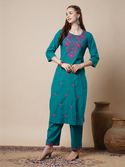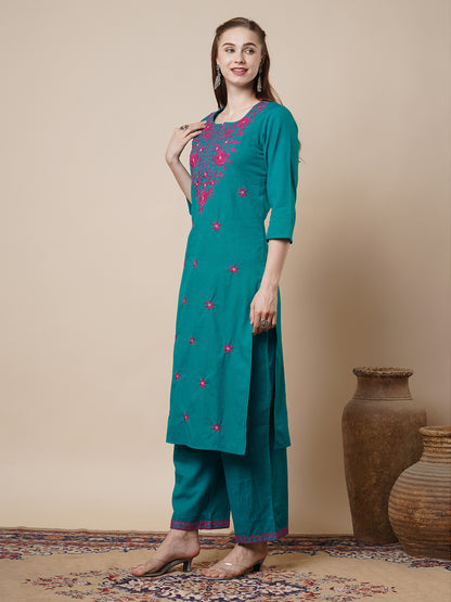 Solid Ethnic Floral Embroidered Straight Fit Co-ord Set - Turquoise Blue