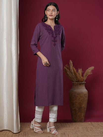 Solid Ethnic Floral Embroidered Straight Fit Kurta - Purple