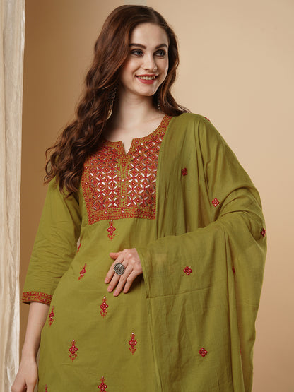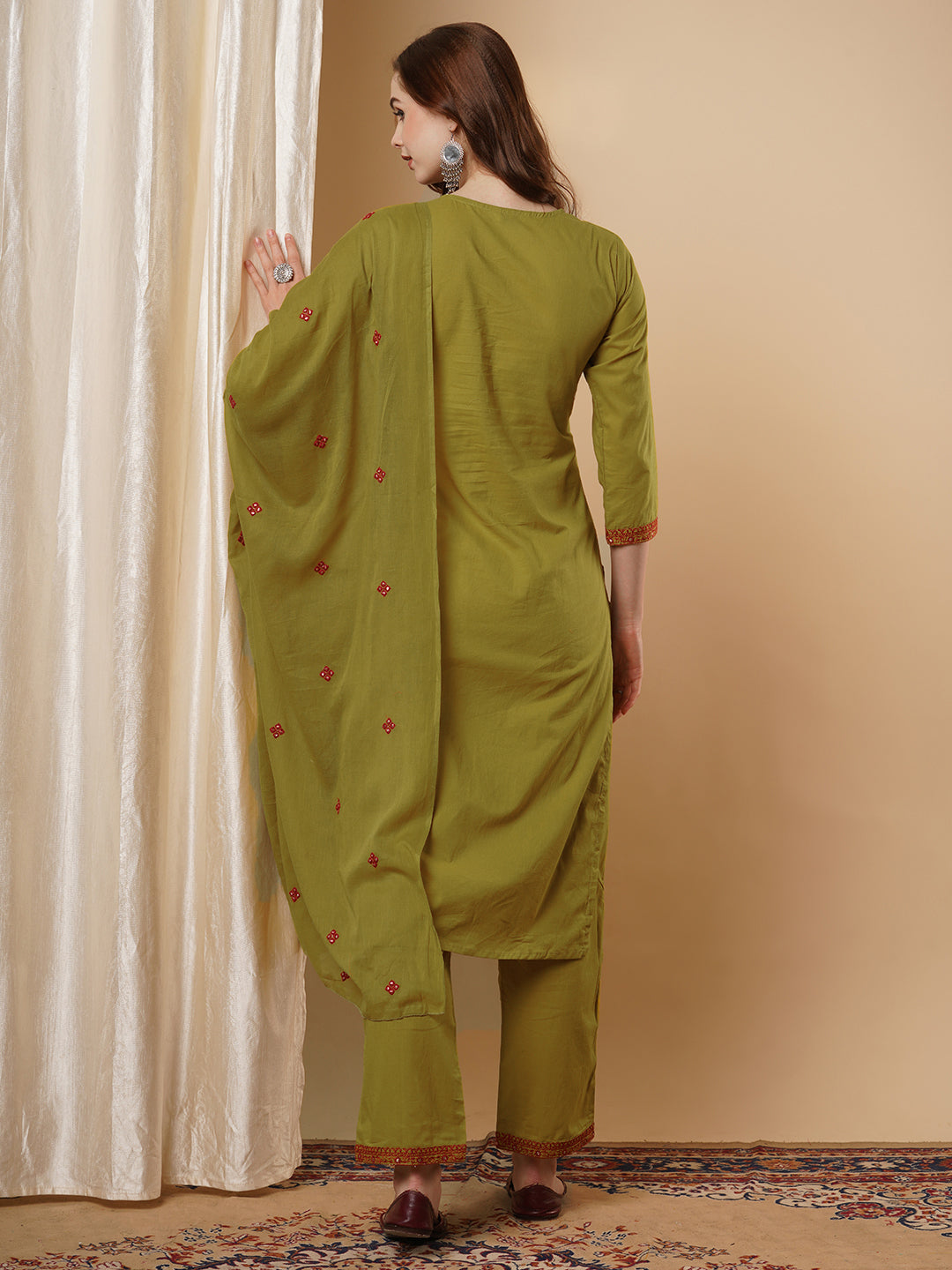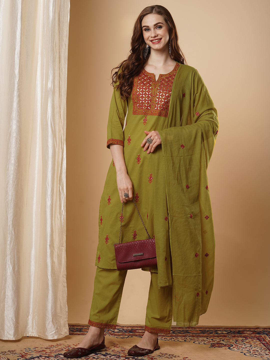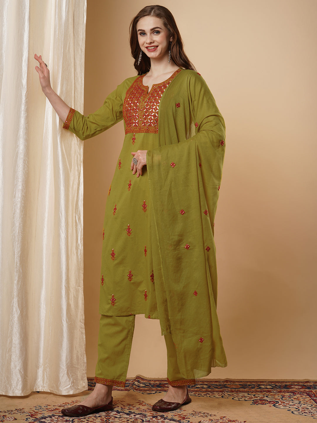 Solid Ethnic Mirror Embroidered Straight Cut Kurta with Pant & Dupatta - Green